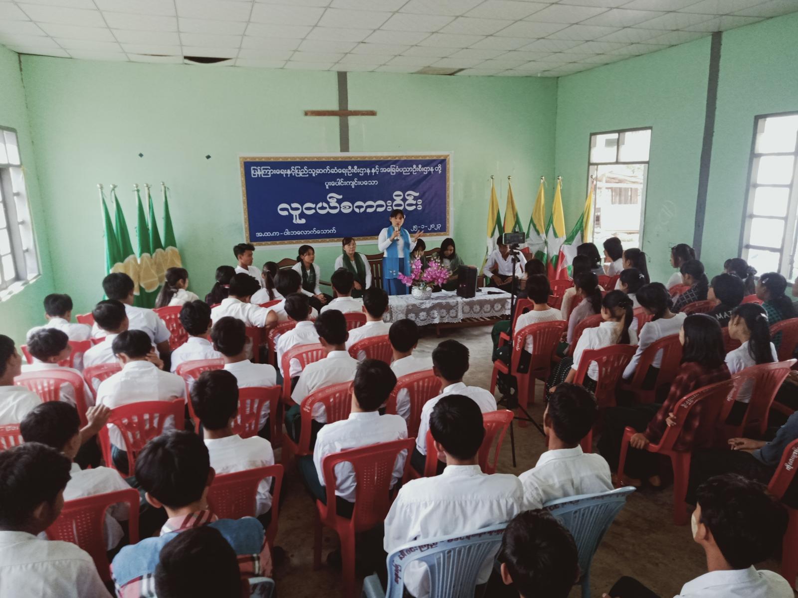 ဆက်လက်၍ “လူငယ်စကားဝိုင်း” ဆွေးနွေးပွဲကိုကျင်းပရာ ပြန်ကြားရေးနှင့်ပြည်သူ့ဆက်ဆံရေးဦးစီးဌာနမှ ဦးစီးအရာရှိ ဒေါ်ဇာခြည်စိမ့်က ဦးဆောင်ဆွေးနွေးသူ အဖြစ်ဆောင်ရွက်ပြီး Grade -10 မှ မဆုလင်းလဲ့နှင်းက လူငယ်နှင့်စာရိတ္တခေါင်းစဉ်ဖြင့် လည်းကောင်း၊ Grade-11မှ မောင်နေလင်းထိုက်က လူငယ်နှင့်အားကစားခေါင်းစဉ်ဖြင့်လည်းကောင်း၊ Grade-11မှ မအေးသဇင်ဦးက လူငယ်နှင့်ယဉ်ကျေးမှုခေါင်းစဉ်ဖြင့် လည်းကောင်း၊ Grade-10မှ မောင်ရှိုင်းထက်အောင်က လူငယ်နှင့်ကျန်းမာရေး ခေါင်းစဉ်ဖြင့်လည်းကောင်း၊ Grade-10မှ မဆုမြတ်မွန်က လူငယ်နှင့်စာပေခေါင်းစဉ်များဖြင့် ဆွေးနွေးခဲ့ကြသည်။ လူငယ်စကားဝိုင်းသို့ ကျောင်းသား/ကျောင်းသူ (၂၀၀)ဦးခန့် တက်ရောက်ခဲ့ကြပြီး ကျောင်းသား/ကျောင်းသူများထဲမှ သိရှိလိုသည်များကိုမေးမြန်းရာ ဦးဆောင်ဆွေးနွေးခဲ့သူများက ပြန်လည်ဖြေကြား ခဲ့ကြောင်း သိရသည်။