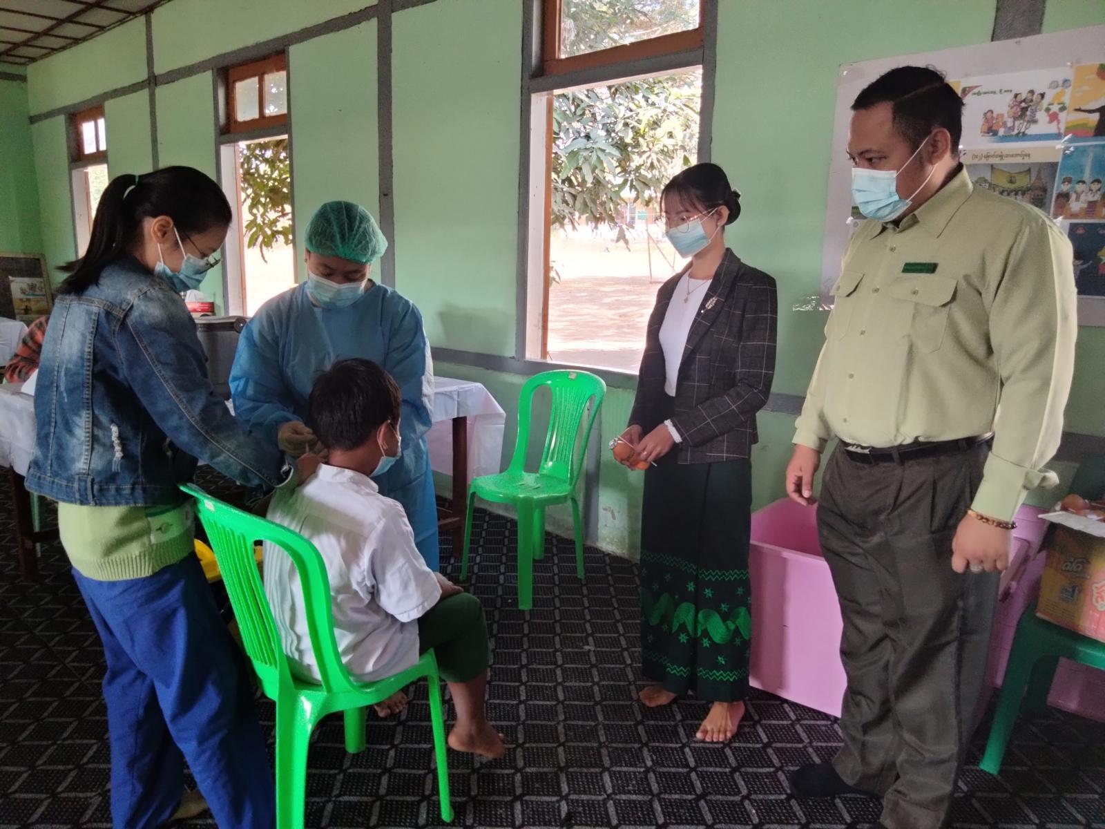 ထိုသို့ ကိုဗစ်-၁၉ အပိုဆောင်းကာကွယ်ဆေး ထပ်ဆောင်းထိုးနှံပေးခြင်းကို မြို့နယ်ကျန်းမာရေးဌာနမှ အထက်တန်းသူနာပြု ဒေါ်နန်းဝင်းကြည်နှင့် ကျန်းမာရေးဆရာမများ၊ ကျန်းမာရေးဝန်ထမ်းများက အသက် ၅ နှစ်မှ ၁၂ နှစ်အထိ ကျောင်းသား၊ ကျောင်းသူများအား ကာကွယ်ဆေးမထိုးနှံမီ မှတ်တမ်းအချက်အလက်များ စနစ်တကျ ဖြည့်သွင်းခြင်း၊ ကိုယ်အပူချိန်တိုင်းတာခြင်း၊ သွေးပေါင်ချိန် တိုင်းတာခြင်းနှင့် အခြားရောဂါ ရှိ/ မရှိ စစ်ဆေးမေးမြန်းပြီးမှသာ ပထမအကြိမ် ကိုဗစ်-၁၉ အပိုဆောင်း ကာကွယ်ဆေး ထိုးနှံပေးခဲ့သည်။