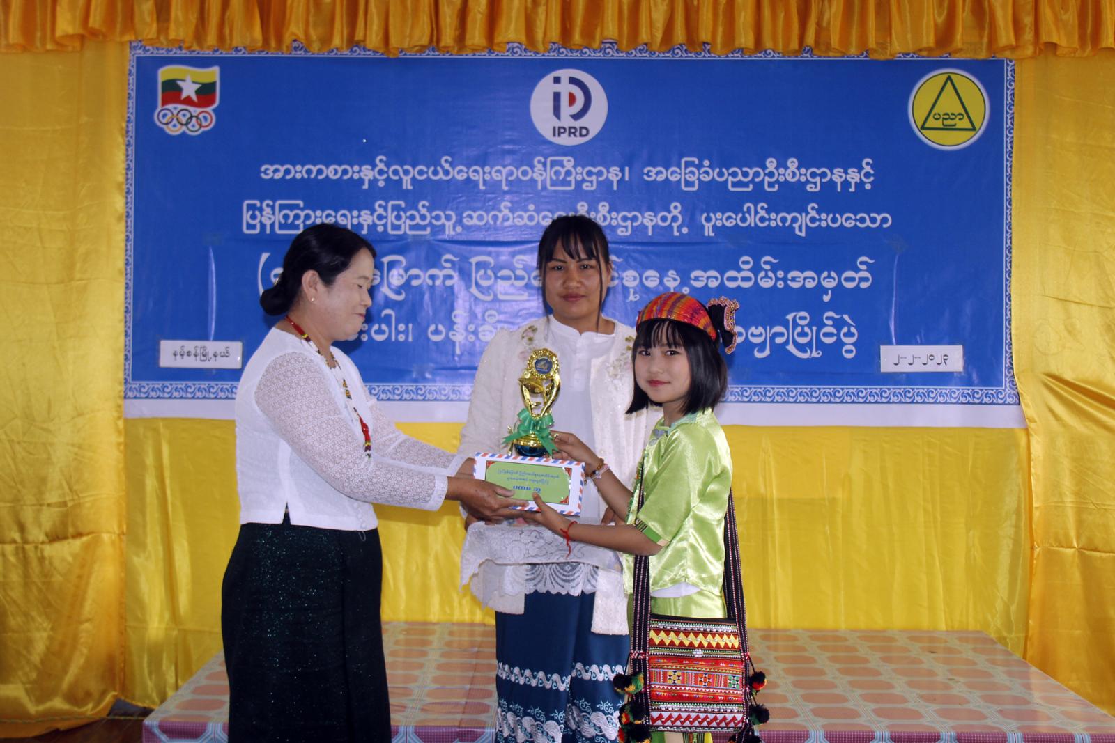 ထို့နောက် ပြိုင်ပွဲအလိုက် ပထမ၊ ဒုတိယ၊ တတိယ ဆုရရှိသူများနှင့် နှစ်သိမ့်ဆုရရှိသူများကို မြို့နယ်ပြန်ကြားရေးနှင့်ပြည်သူ့ဆက်ဆံရေးဦးစီးဌာနမှ ဦးစီးအရာရှိဒေါ်ဥမ္မာအောင်၊ အားကစားနှင့်လူငယ်ရေးရာဝန်ကြီးဌာနမှ နည်းစနစ်မှူးဦးအေးချမ်းနိုင်၊ ဒုတိယမြို့နယ်ပညာရေးမှူး ဒေါ်လင်းလင်းထိုက်၊ မြို့နယ်အမျိုးသမီးရေးရာအဖွဲ့ဥက္ကဋ္ဌ ဒေါ်ဥမ္မာဝင်းနှင့်မြို့နယ် Book Club အဖွဲ့မှ အဖွဲ့ဝင်များ၊ အခြေခံပညာအထက်တန်းကျောင်းအုပ်ကြီးများက ဆုတံဆိပ်နှင့်ဆုငွေများ အသီးသီးပေးအပ်ချီးမြှင့်ခဲ့ကြကြောင်း သိရသည်။