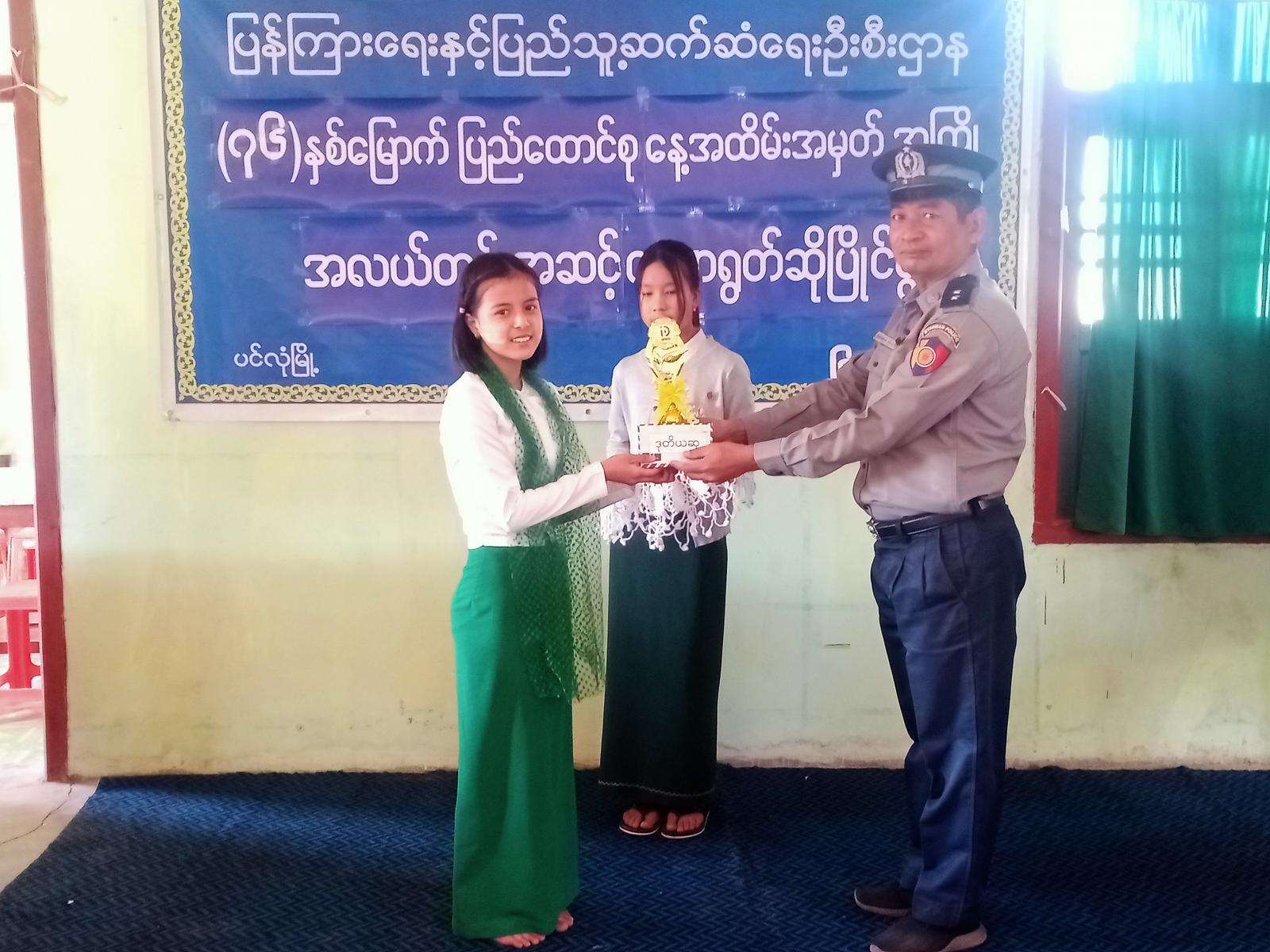 အဆိုပါ ပြိုင်ပွဲတွင် ပထမဆုရရှိသော အမှတ်(၁) အခြေခံပညာအထက်တန်းကျောင်းမှ မနော်သီရိရှင်းသန့်အား အထွေထွေအုပ်ချုပ်ရေးဦးစီးဌာန၊ မြို့အုပ်ချုပ်ရေးမှူးမှလည်းကောင်း၊ ဒုတိယဆုရရှိသော အမှတ်(၂)အခြေခံပညာ အထက်တန််းကျောင်းမှ မထက်နန္ဒာကျော်အား ပင်လုံနယ်မြေရဲစခန်း စခန်းမှူးမှလည်းကောင်း၊ တတိယဆုရရှိသော အမှတ်(၃) အခြေခံပညာ အထက်တန်းကျောင်းမှ မမိုးပြည့်ပြည့်မောင်အား ပြန်ကြားရေးနှင့်ပြည်သူ့ဆက်ဆံရေး ဦးစီးဌာန၊ မြို့နယ်ဦးစီးမှူးမှလည်းကောင်း၊ အထူးဆုရရှိသော အမှတ်(၂)အခြေခံပညာအလယ်တန်းကျောင်းခွဲမှ ခွန်ကျော်သူရဟိန်းအား နယ်စပ်ဒေသတိုင်းရင်းသား လူငယ်ဖွံ့ဖြိုးရေးသင်တန်းကျောင်း(ပင်လုံ) ကျောင်းအုပ်ဆရာကြီးမှလည်ကောင်း အသီးသီး ချီးမြှင့်ပေးခဲ့ပါသည်။