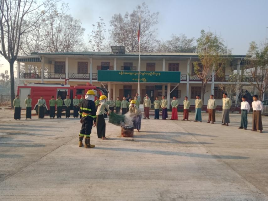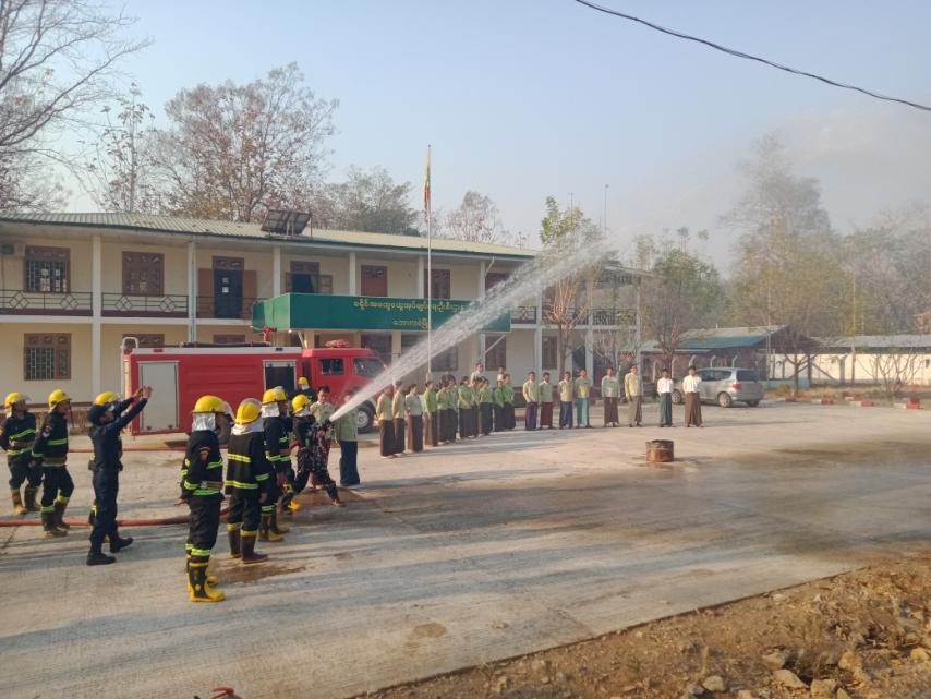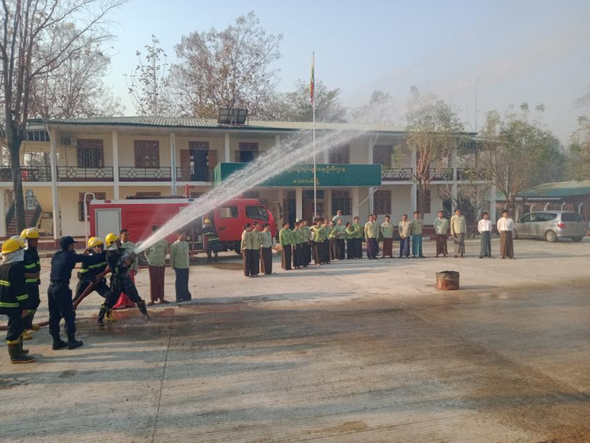 ရှေ့ဦးစွာ မီးသတ်ယာဉ်နှစ်စီးနှင့်စည်ပင်ရေတင် ယာဉ်နှစ်စီးဖြင့် မြို့မစျေးမီးငြှိမ်းသတ်မှု သရုပ်ပြလက်တွေ့ဆောင်ရွက်ခြင်းနှင့် မြို့နယ်မီးသတ်ဦးစီးဌာန ဦးစီးမှူးဦးဇော်ထက်က မီးသတ်ဆေးဗူး အသုံးပြုပုံနှင့် မီးသတ်ဆေးအကြောင်း သရုပ်ပြရှင်းလင်းဟောပြောပြီး မီးလောင်မှုဖြစ်ပွားလျှင် မီးသတ်ဦးစီးဌာနမှ ရောက်မလာခင် စျေးတွင်း၊ရုံးဌာနများနှင့် နေအိမ်များသို့ ကူးစက်မှုမဖြစ်ပွားစေရေး ရေပုံးလေ့ကျင့်သရုပ်ပြဖြင့် ကနဦး မီးငြှိမ်းသတ်နည်း၊ မီးသတ်ဆေးဗူးဖြင့် မီးငြှိမ်းသတ်နည်း၊ ရေစိုအဝတ်ဖြင့် ဖုံးအုပ်ငြှိမ်းသတ်နည်းတို့ကို သရုပ်ပြခဲ့ပြီး ခရိုင်အထွေထွေ အုပ်ချုပ်ရေး ရုံးတွင်းရှိဝန်ထမ်းများက ပါဝင်သရုပ်ပြသခဲ့ကြောင်း သိရသည်။