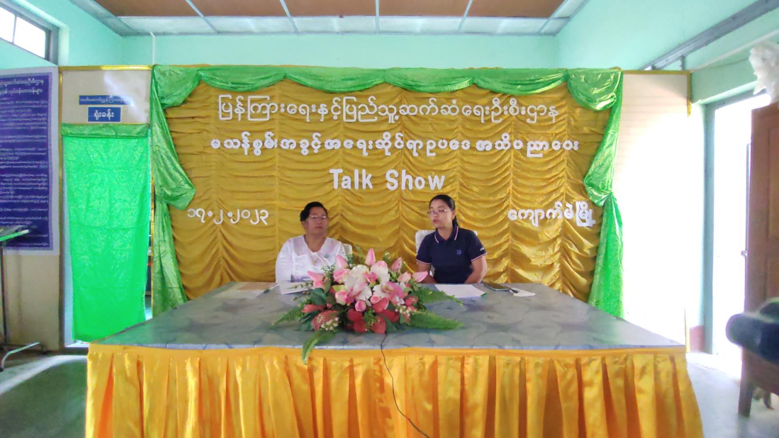 ရှေးဦးစွာ ကျောက်မဲခရိုင်၊ ပြန်ကြားရေးနှင့်ပြည်သူ့ဆက်ဆံရေးဦးစီးဌာန၊ လက်ထောက်ညွှန်ကြားရေးမှူး ဒေါ်နှင်းရည်က Talk Show ဆောင်ရွက်ရခြင်း၏ ရည်ရွယ်ချက်များကို ရှင်းလင်းပြောကြားခဲ့ပြီး ကျောက်မဲခရိုင် လူမှုဝန်ထမ်းဦးစီးဌာနမှ ခရိုင်ဦးစီးမှူး ဒေါ်စန်းစန်းရီက မသန်းစွမ်းဥပဒေများအကြောင်း၊ မသန်စွမ်းဥပဒေ စာအုပ်အကြောင်း၊ ပြန်လည် ထူထောင်ရေး၏အဓိပ္ပာယ်၊ ခွဲခြားဆက်ဆံမှုများအကြောင်း၊ ဘာသာစကားများအကြောင်း၊ မသန်စွမ်းသူများ အသင်းအဖွဲ့များအကြောင်း၊ မြန်မာနိုင်ငံ မသန်စွမ်းအသင်းချုပ်အ ကြောင်း၊ မသန်စွမ်းသူများ ရရှိနိုင်မည့် အခွင့်အရေးများကို အသေးစိတ် ရှင်းလင်းဆွေးနွေးခဲ့ကြောင်း သိရသည်။