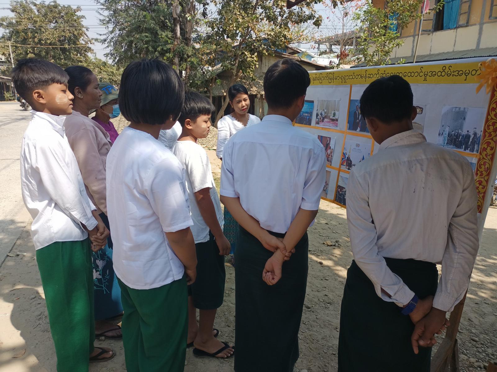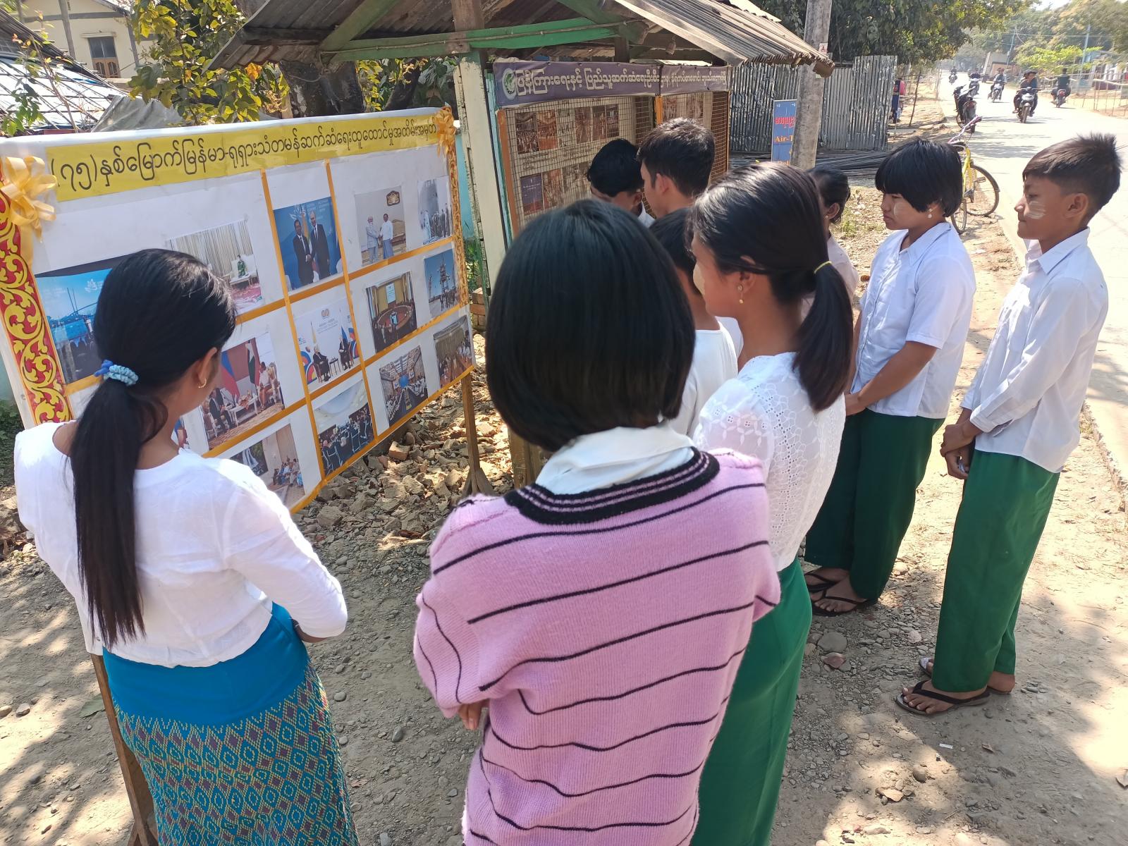 အဆိုပါ မြေစိုက်နံရံကပ်ဘုတ်တွင် (၇၅)နှစ်မြောက် မြန်မာ-ရှရှားသံတမန်ဆက်ဆံရေး ထူထောင်မှုအထိမ်းအမှတ်အနေဖြင့် နှစ်နိုင်ငံပူးပေါင်းဆောင်ရွက်မှု မှတ်တမ်းပုံများ၊ နှစ်နိုင်ငံအကြီးအကဲများ တွေ့ဆုံမှုမှတ်တမ်းဓာတ်ပုံများ၊ မှတ်တမ်းဓာတ်ပုံ(၂၀) ပါဝင်ပြီး၊ အများ ပြည်သူများ ကျယ်ကျယ်ပြန့်ပြန့် သိရှိစေရန်ရုံးရှေ့မြေစိုက်နံရံကပ်ဘုတ်တွင် ပြသဆောင်ရွက်မှုကို ကျောင်းသားကျောင်းသူများ၊ ပြည်သူများက စိတ်ပါဝင်စားစွာ ကြည့်ရှုလေ့လာကြောင်း သိရသည်။