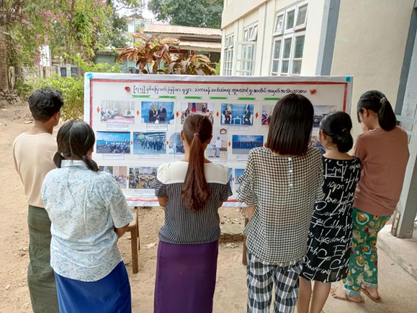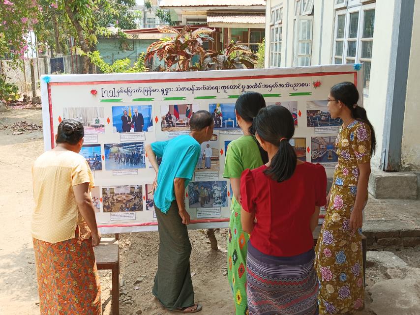 ထိုသို့ဆောင်ရွက်ရာတွင် ကျိုက်ထိုမြိုနယ်အတွင်းရှိ ဌာနဆိုင်ရာများ၊ ကျောင်းသား ကျောင်းသူများနှင့် ဒေသနေပြည်သူများအား ဖေဖော်ဝါရီလ (၁၈) ရက်နေ့တွင် ကျရောက်မည့် (၇၅) နှစ်မြောက် မြန်မာနှင့်ရုရှားတို့၏ သံတမန်ဆက်ဆံရေး ထူထောင်မှုအထိမ်းအမှတ်အဖြစ် နှစ်နိုင်ငံ ချစ်ကြည်ရေးခရီးစဉ်မှတ်တမ်းများ၊ စီးပွားရေးပူးပေါင်းဆောင်ရွက်မှု မှတ်တမ်းများ၊ နိုင်ငံတော်စီမံအုပ်ချုပ်ရေးကောင်စီဥက္ကဋ္ဌ နိုင်ငံတော်ဝန်ကြီးချုပ် ဗိုလ်ချုပ်မှူးကြီး မင်းအောင်လှိုင်နှင့်အဖွဲ့ဝင်များ အရှေ့ဖျားရေငုတ်သင်္ဘောဌာနချုပ်၊ အာကာသလွှတ်တင်ရေး စခန်း၊ လေယာဉ်ထုတ်လုပ်ရေးစက်ရုံများ လေ့လာကြည့်ရှုခဲ့သည့် မှတ်တမ်းပုံများအား ပြသဆောင်ရွက်ထားကြောင်း သိရသည်။