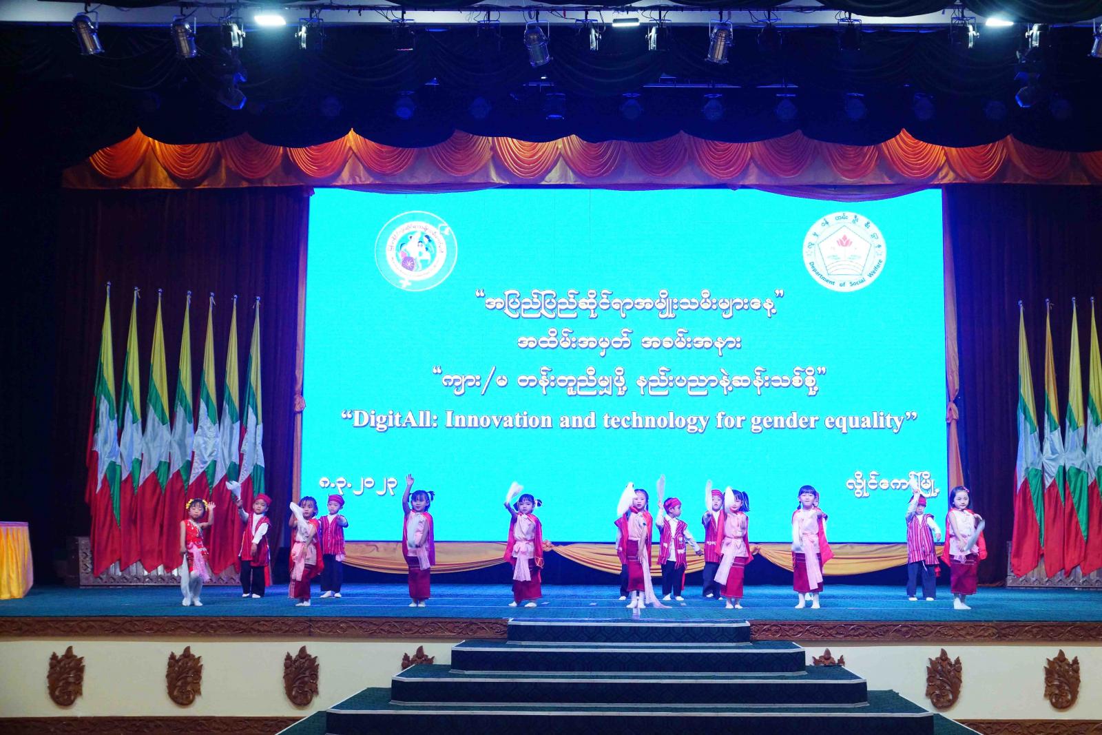ဆက်လက်ပြီး လွိုင်ကော်မူလတန်းကြိုကျောင်းမှ ရင်သွေးငယ်လေးများက “သွေးချင်းများနှင့်အတူ ကကြမယ်” သီချင်းနှင့် “ပန်းကောက်တေး” တေးသီချင်းတို့ဖြင့် ကပြဖျော်ဖြေတင်ဆက်ကြရာ ကပြဖျော်ဖြေတင်ဆက်ခဲ့ကြသော သားငယ်/ သမီးငယ်လေးများအား ပြည်နယ်ဝန်ကြီးချုပ်မှ ဂုဏ်ပြုဆုများ ပေးအပ်ချီးမြှင့်ခဲ့ပြီး အခမ်းအနားသို့တက်ရောက်လာကြသော အမျိုးသမီးရေးရာအဖွဲ့များ၊ လူမှုရေးအသင်းအဖွဲ့များနှင့် ရင်းရင်းနှီးနှီးတွေ့ဆုံနှုတ်ဆက်အားပေး စကားပြောခဲ့ကြောင်းသိရှိရသည်။