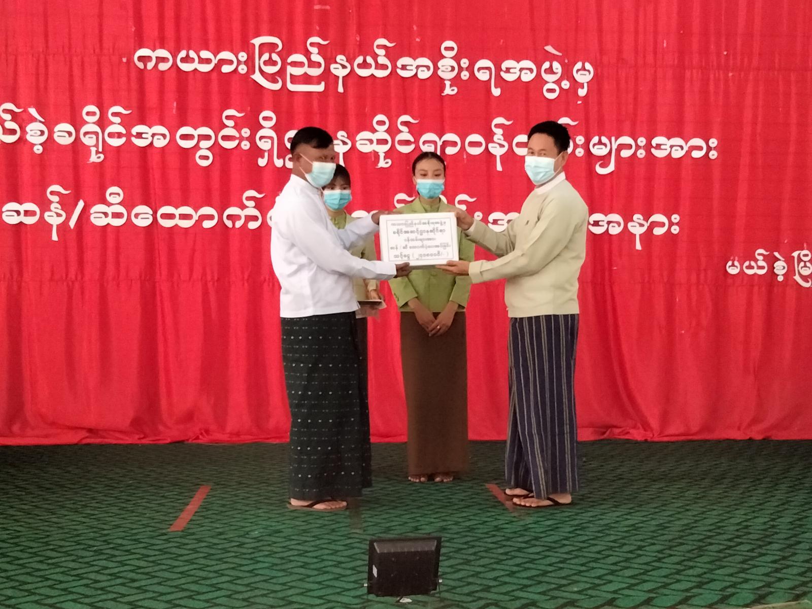 ထို့နောက် ဆန်နှင့် ဆီထောက်ပံ့မှုအပေါ် ဝန်ထမ်းများ၏ကိုယ်စား မြို့နယ်ပညာရေးမှူး ဒေါ်မင်းမင်းသန်းက ကျေးဇူးတင်စကားပြောကြားသည်။ ကယားပြည်နယ်အစိုးရအဖွဲ့မှ မယ်စဲ့ခရိုင်၊ မြို့နယ်အတွင်းရှိ ဝန်ထမ်းများအား တစ်ဦးလျင် ဆန် ၁၂ ပြည်၊ ဆီ ၅၀ ကျပ်သား၊ တန်ဖိုးသင့်ငွေကျပ် ၅၆၀၀၀ နှုန်းဖြင့် ဝန်ထမ်း ၂၈၄ ဦးအတွက် စုစုပေါင်း ငွေကျပ် ၁၅၉၀၄၀၀၀ တို့ကို ဝန်ထမ်းတစ်ဦးချင်းစီ လက်ဝယ်သို့ ထောက်ပံ့ပေးခဲ့ကြောင်း သိရသည်။