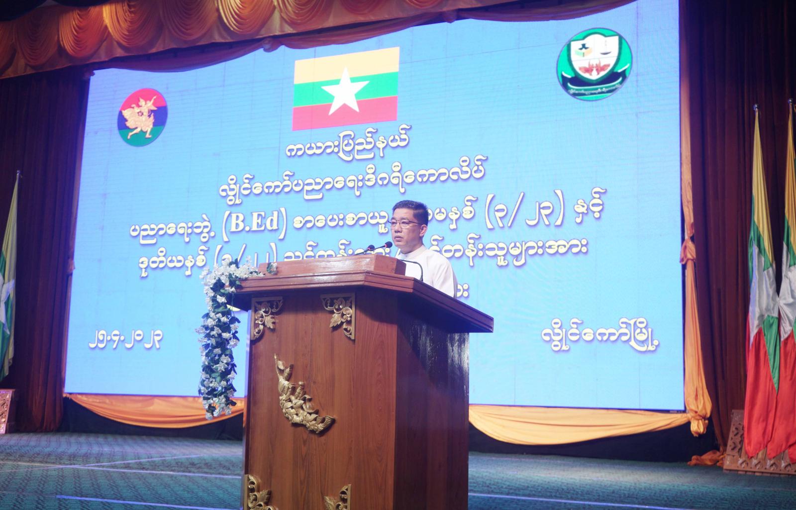 ကယားပြည်နယ် ၊ လွိုင်ကော်မြို့ ၊ ဆရာအတတ်ပညာဦးစီးဌာန ၊ ပညာရေးဒီဂရီကောလိပ်မှကျင်းပသည့် ပညာရေးဘွဲ့(B.Ed)စာပေးစာယူ ပထမနှစ်(၃/၂၃)နှင့် ဒုတိယနှစ်(၁/၂၂) သင်တန်းသား၊ သင်တန်းသူများအား ကြိုဆိုနှုတ်ဆက်ပွဲ အခမ်းအနားကို ယနေ့နံနက် ၉ နာရီအချိန်က လွိုင်ကော်မြို့၊ ကယားပြည်နယ်ခန်းမ၌ကျင်းပခဲ့ရာ ပြည်နယ်ဝန်ကြီးချုပ်ဦးဇော်မျိုးတင်၊ ပြည်နယ်အစိုးရအဖွဲ့ဝင်များ၊ တက္ကသိုလ်၊ ဒီဂရီကောလိပ်များမှ ပါမောက္ခချုပ်၊ ဒုတိယပါမောက္ခချုပ်နှင့် ကျောင်းအုပ်ကြီးများ၊ ဌာနဆိုင်ရာအကြီးအကဲများ၊ သင်ကြားရေးဆရာ၊ ဆရာမများနှင့်သင်တန်းသား၊ သင်တန်းသူများ တက်ရောက်ခဲ့ကြသည်။