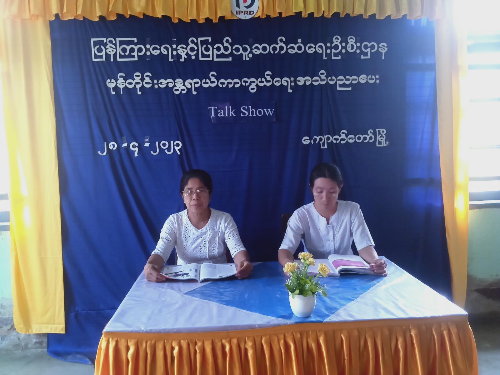 ဆက်လက်၍ အငယ်တန်းစာရေး ဒေါ်ကျော့ကျော့ဝင်းက မုန်တိုင်းအန္တရာယ်ကာကွယ်ရေးနှင့် ပတ်သက်၍ ဆွေးနွေးရာတွင် မုန်တိုင်းအရှိန်ကြောင့် ထူးကဲဒီရေမြင့်တက်ခြင်း၊ ရုတ်တရမြစ်ရေကြီးခြင်း၊ မုန်တိုင်းအခြေအနေများအား အရောင်ခွဲခြားသတ်မှတ်ခြင်းများနှင့်ပတ်သက်၍ အပြန်အလှန်ဆွေးနွေးခဲ့ကြသည်။ ပြန်ကြားရေးနှင့်ပြည်သူ့ဆက်ဆံရေးဦးစီးဌာန၊ ကျောက်တော်မြို့နယ်ရုံးအနေဖြင့် အသိပညာပေး Talk Show များ၊ ဟောပြောပွဲများ၊ စာအုပ်မိတ်ဆက်၊ ပုံပြင်၊ ကဗျာရွတ်စသည့် အကြောင်းအရာများကို ပြည်သူများ အသိပညာ ဗဟုသုတရရှိစေရန်အတွက် Online မှတစ်ဆင့် စဉ်ဆက်မပြတ် တင်ဆက်ပေးလျက်ရှိရာ ယခု Talk Show အပြည့်အစုံကိုလည်း We Love Kyauk Taw နှင့် ကျောက်တော်မြို့နယ် ပြည်သူ့စာကြည့်တိုက် Face bookPage များမှ လွှင့်တင်ပေးလျက်ရှိကြောင်း သိရသည်။