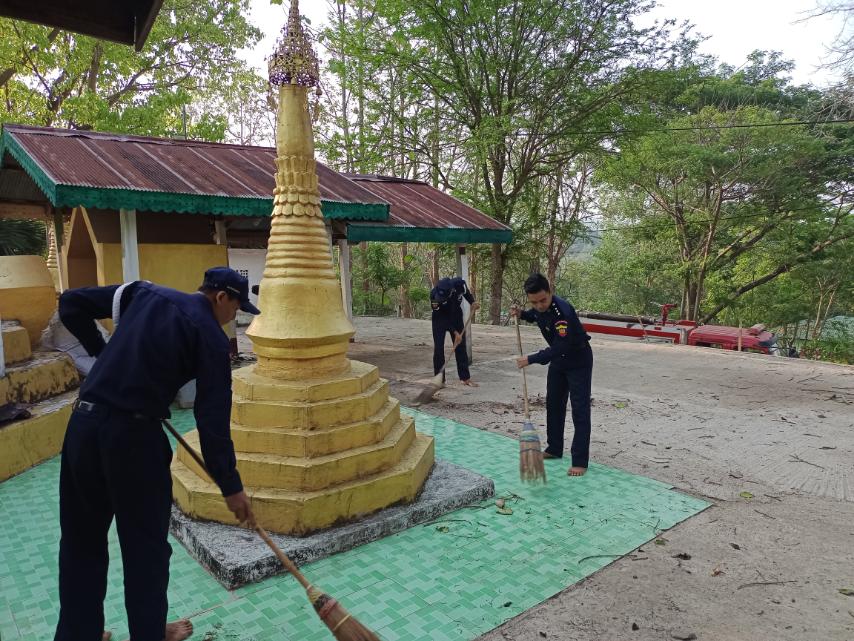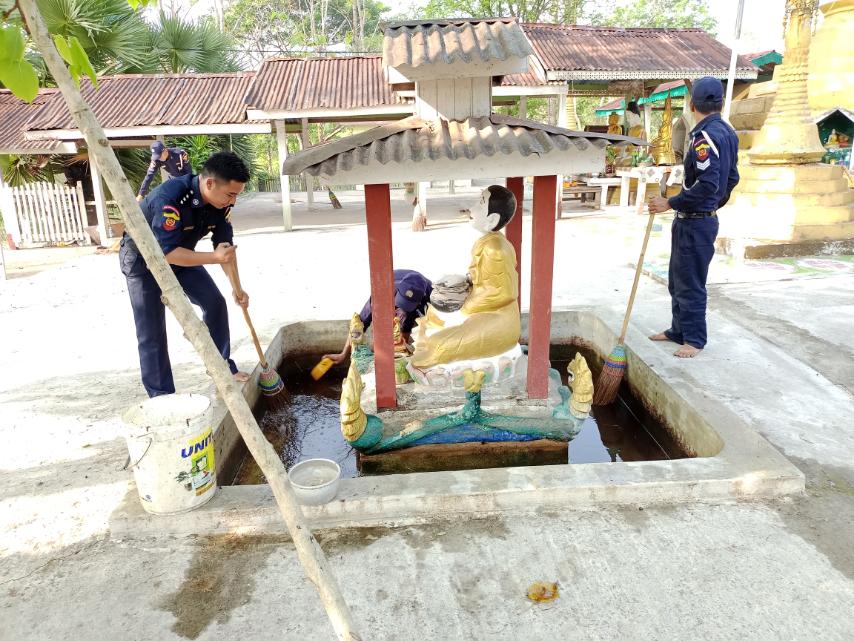 ထိုသို့ပြုလုပ်ရာတွင် မြိုနယ်မီးသတ်ဦးစီးဌာန မြို့နယ်ဦးစီးမှူး ဦးဖြိုးမြတ်သူနှင့် မီးသတ်တပ်ဖွဲ့ဝင်များက မေလ(၅)ရက်နေ့တွင် ကျရောက်မည့် (၇၇)နှစ်မြောက် မြန်မာနိုင်ငံမီးသတ်တပ်ဖွဲ့နေ့ကို ဂုဏ်ပြုသည့်အနေဖြင့် ရတနာရန်အောင်စေတီတော်အား ရေသပ္ပယ်ခြင်း၊ စေတီတော်ရင်ပြင်တွင် သန့်ရှင်းရေးပြုလုပ်ခြင်း၊ စေတီတော်ဝင်းအတွင်းရှိ အမှိုက်သရိုက်များရှင်းလင်းခြင်းတို့ကို စုပေါင်းဆောင်ရွက်ခဲ့ကြောင်း သိရသည်။