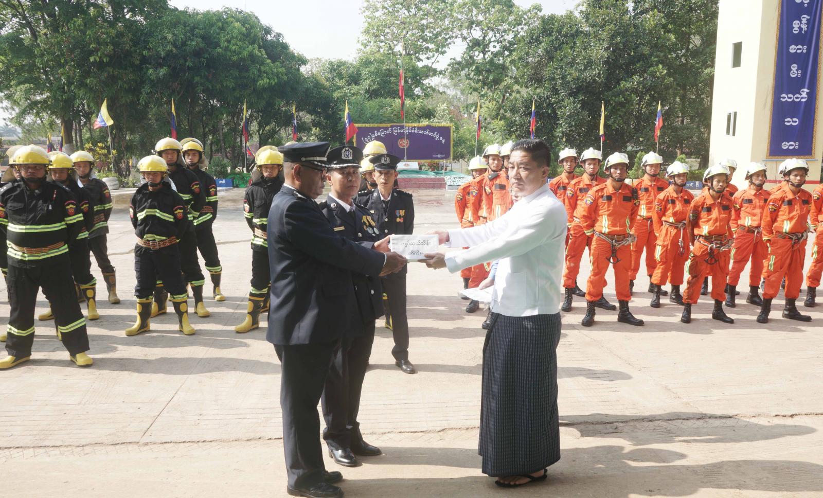 ထို့နောက် ပြည်နယ်ဝန်ကြီးချုပ်က မီးသတ်တပ်ဖွဲ့ဝင်များသည် နိုင်ငံတော်၏အကျိုး၊ တိုင်းရင်းသားပြည်သူများ၏ အကျိုးကို ဆောင်ရွက်နေသည့် ပြည်သူ့အကျိုးပြု တပ်ဖွဲ့တစ်ခု ဖြစ်ကြောင်း၊ မီးသတ်တပ်ဖွဲ့ဝင်များအား နိုင်ငံတော်၏ ခိုင်မာသော အရန်အင်အားဖြစ်စေရေးအတွက် လေ့ကျင့်ဖွဲ့စည်း၍ တပ်ဖွဲ့ဝင်တစ်ဦးချင်း၏ စွမ်းဆောင်ရည်မြင့်တင်ခြင်း၊ ရှာဖွေကယ်ဆယ်ရေးနည်းပညာ၊ သတင်းအချက်အလက် ဆက်သွယ်ရေးနည်းပညာများကို စဉ်ဆက်မပြတ် လေ့လာပြီး အမြဲမပြတ် တပ်ဖွဲ့အလိုက်စုဖွဲ့ လေ့ကျင့်ပြီး ကြိုတင်ပြင်ဆင်မှုများ ဆောင်ရွက်နေရမည်ဖြစ်ကြောင်း၊ မီးသတ်တပ်ဖွဲ့ဝင်များ၏ စွမ်းဆောင်မှုတိုင်းသည် ပြည်သူများ၏ နေထိုင်မှု ဘဝလုံခြုံရေးမှ အစပြု၍ နိုင်ငံတော်တည်ဆောက်ရေးအထိ အကျုံးဝင်ကြောင်း၊ မီးသတ်လုပ်ငန်းသည် တစ်ဦးတစ်ယောက်ထဲမရပဲ မီးသတ်တပ်ဖွဲ့ ဝင်များ၊ တာဝန်ရှိသူများနှင့် ပြည်သူများ၏ စုပေါင်းစွမ်းအားဖြင့် ဆောင်ရွက်မှသာပိုမို အောင်မြင်နိုင် ကြောင်း ဂုဏ်ပြုမိန့်ခွန်းပြောကြားခဲ့သည်။