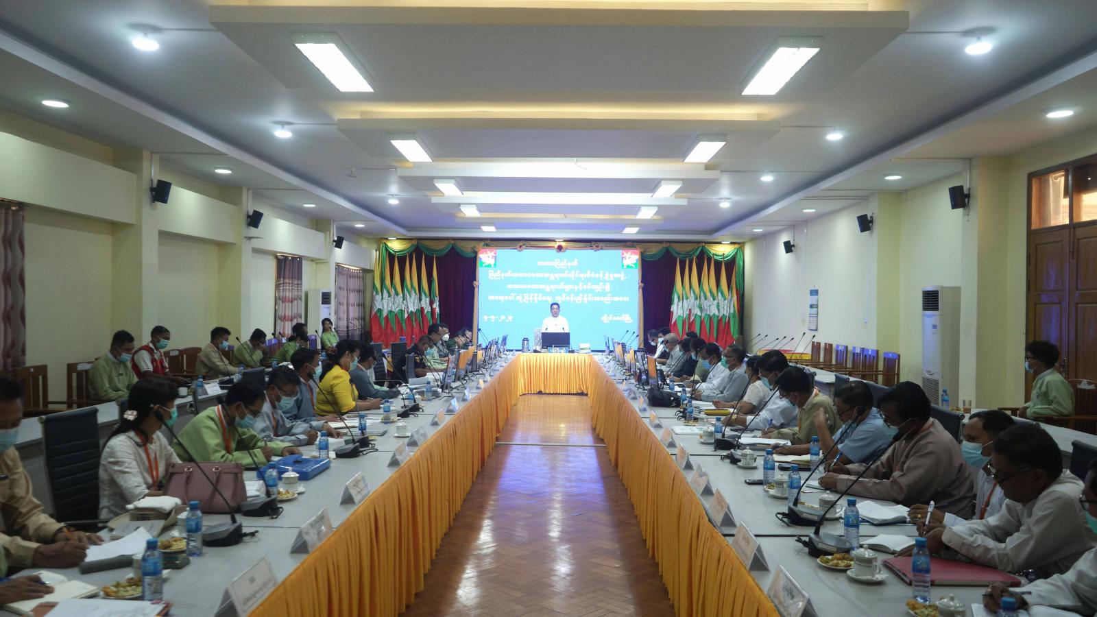 ထို့နောက် ပြည်နယ်အစိုးရအဖွဲ့၊ အတွင်းရေးမှူး ဦးအံ့မော်က သဘာဝဘေးအန္တရာယ်များနှင့် စပ်လျဉ်း၍ အရေးပေါ်တုံ့ပြန်ရေး ဆောင်ရွက်ထားရှိသည့် အစီအမံများကို Power Point ဖြင့်ရှင်းလင်းတင်ပြခဲ့ပြီး တက်ရောက်လာကြသည့် ပြည်နယ်သဘာဝဘေးအန္တရာယ်ဆိုင်ရာ လုပ်ငန်းကော်မတီဝင်များက မိမိတို့သက်ဆိုင်ရာ လုပ်ငန်းကော်မတီများအလိုက် ကြိုတင်စီမံဆောင်ရွက်ထားရှိမှု အခြေအနေများကို ဆွေးနွေးတင်ပြခဲ့ကြသည်။