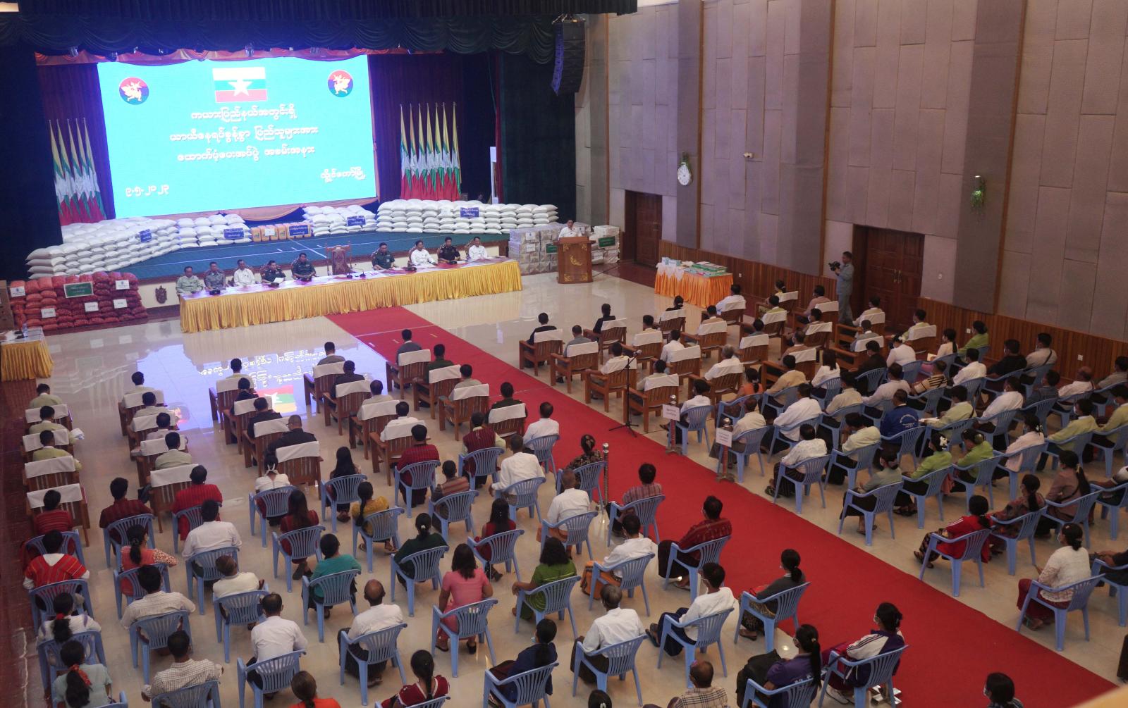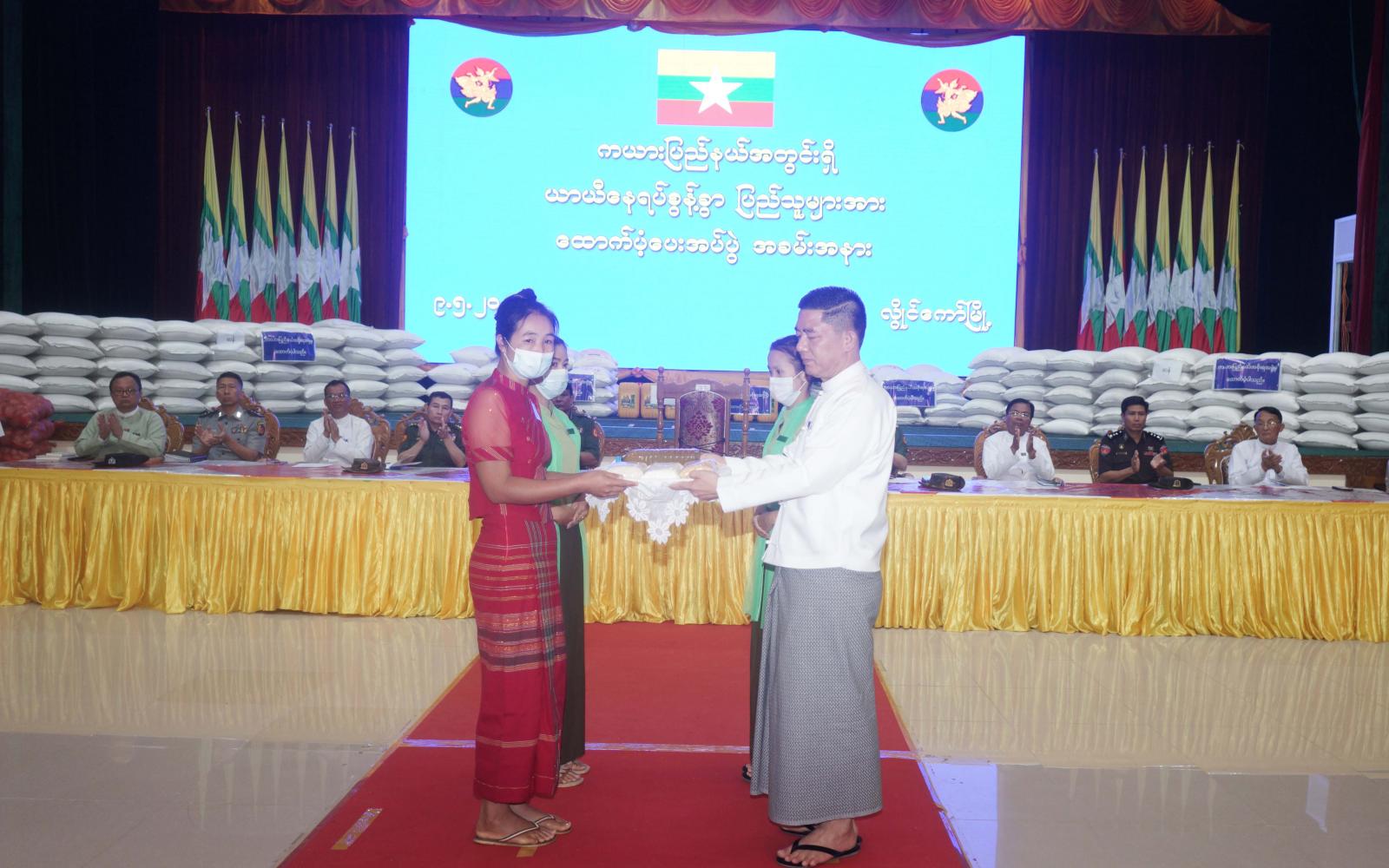 ထို့နောက် အရှေ့ပိုင်းတိုင်းစစ်ဌာနချုပ်၊ တိုင်းမှူးဗိုလ်ချုပ်လှမိုးက ပြည်နယ်အတွင်း ပြန်လည်နေရာချထားရေး ကိစ္စရပ်များနှင့်စပ်လျဉ်း၍ ရှင်းလင်းပြောကြားခဲ့ပြီး ပြည်နယ်ဝန်ကြီးချုပ်၊ အရှေ့ပိုင်းတိုင်းစစ်ဌာနချုပ်၊ တိုင်းမှူးနှင့် တာဝန်ရှိသူများက ပြည်နယ်အတွင်းရှိ ယာယီနေရပ်စွန့်ခွာ ပြည်သူများအား ဆန်၊ ဆီ၊ ပဲနှင့် အခြေခံစားသောက်ကုန်များ၊ ထောက်ပံ့ငွေများ၊ ကျောင်းဝတ်စုံနှင့် ကျောင်းသုံးဗလာစာအုပ်များကိုပေးအပ်ရာ သက်ဆိုင်ရာယာယီခိုလှုံရာစခန်းအသီးသီးမှ ကိုယ်စားလှယ်များက လက်ခံရယူခဲ့ကြသည်။