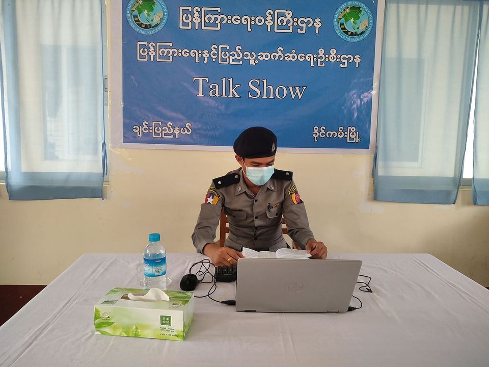 ချင်းပြည်နယ် ဖလမ်းခရိုင်တီးတိန်မြို့နယ် ခိုင်ကမ်းမြို့ ပြန်ကြားရေးနှင့် ပြည်သူ့ဆက်ဆံရေးဦးစီးဌာန၊ ခိုင်ကမ်းမြို့ နယ်မြေရဲစခန်းမှ တာဝန်ရှိသူနှင့် ပူးပေါင်း၍ ယနေ့ နံနက် ၁၀ နာရီအချိန်တွင် Community Centre ခန်းမ၌ မူးယစ်ဆေးဝါးနှင့် ပတ်သက်သည့်ပြစ်မှု ဆိုင်ရာသိကောင်းစရာများ On Line Talk Show ကို ပြုလုပ်ကျင်းပခဲ့သည်။