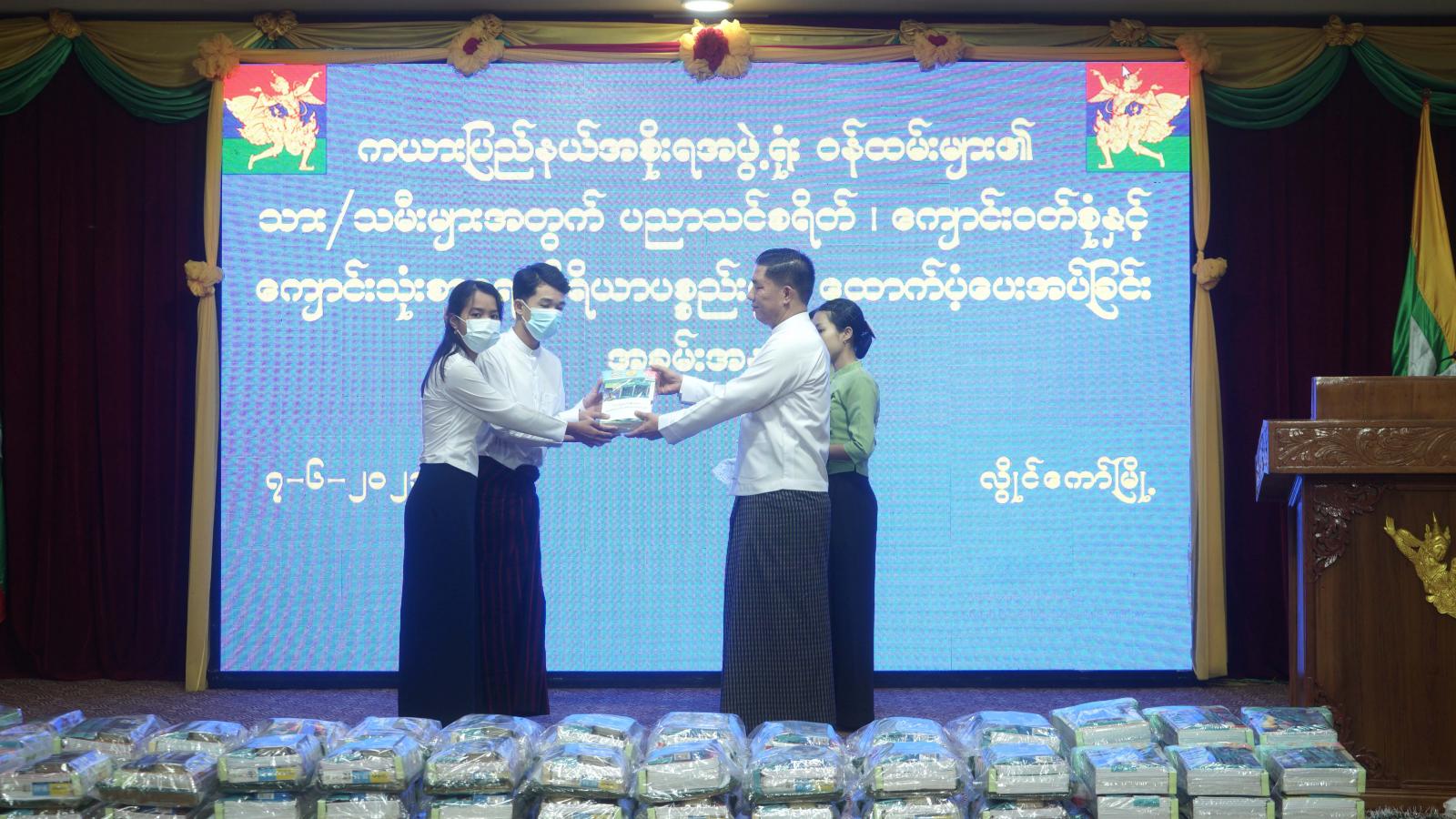 ကယားပြည်နယ်အစိုးရအဖွဲ့ရုံး ဝန်ထမ်းများ၏သားသမီးများအတွက် ပညာသင်စရိတ်၊ ကျောင်းဝတ်စုံနှင့် ကျောင်းသုံးစာရေးကိရိယာပစ္စည်းများ ထောက်ပံ့ပေးအပ်ခြင်း အခမ်းအနားကို ယမန်နေ့မွန်းလွဲပိုင်းက ကယားပြည်နယ်အစိုးရအဖွဲ့ရုံး၊ အစည်းအဝေးခန်းမ၌ ကျင်းပပြုလုပ်ခဲ့သည်။