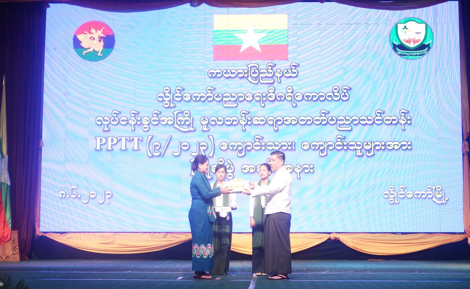 ထို့နောက် ပြည်နယ်ဝန်ကြီးချုပ်က လွိုင်ကော်ပညာရေးဒီဂရီကောလိပ်ကျောင်းတွင် ရေပိုက်သွယ်တန်းခြင်းလုပ်ငန်းနှင့် ကျောင်းသား၊ ကျောင်းသူများအတွက် ထောက်ပံ့ငွေများပေးအပ်ရာ ကျောင်းအုပ်ကြီး ဒေါ်ချယ်ရီထွန်းက လက်ခံရယူခဲ့သည်။