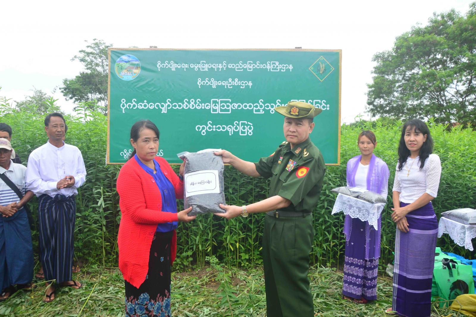 ထို့နောက် လုံခြုံရေးနှင့်နယ်စပ်ရေးရာဝန်ကြီးနှင့် တာဝန်ရှိသူများက ပိုက်ဆံလျှော်မျိုးစေ့နှင့် နေကြာမျိုးစေ့များအား စိုက်ပျိုးတောင်သူများထံသို့ အခမဲ့ဖြန့်ဝေပေးအပ်ပြီး ပိုက်ဆံလျှော် သစ်စိမ်းမြေဩဇာထည့်သွင်းခြင်း ကွင်းသရုပ်ပြမှုများကို ကြည့်ရှုအားပေးခဲ့ကြကာလိုအပ် သည်များကို လမ်းညွှန်မှာကြားခဲ့သည်။