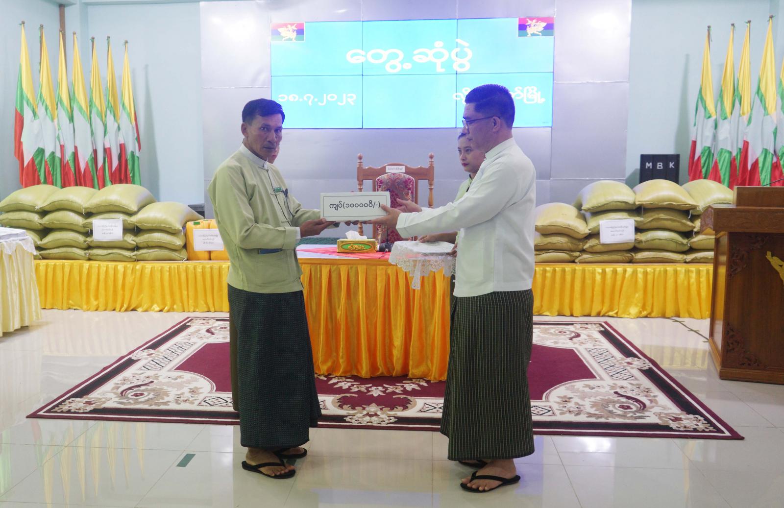 ထို့နောက် ပြည်နယ်ဝန်ကြီးချုပ်နှင့် ပြည်နယ်အစိုးရအဖွဲ့ဝင်များက မယ်စဲ့ခရိုင် ၊ မြို့နယ်နှင့် ရွာသစ်မြို့များမှ ယာယီနေရပ်စွန့်ခွာသူရောက်ရှိလာပြီး လွိုင်ကော်မြို့တွင် တာဝန်ထမ်းဆောင်လျက်ရှိသော ဝန်ထမ်းများအား ချီးမြှင့်ငွေနှင့် ဆန် ၊ ဆီများပေးအပ်ခဲ့ကြရာ အဆိုပါမြို့နယ်များရှိဌာနဆိုင်ရာအသီးသီးမှ ဝန်ထမ်းများ ကလက်ခံရယူခဲ့ကြသည်။