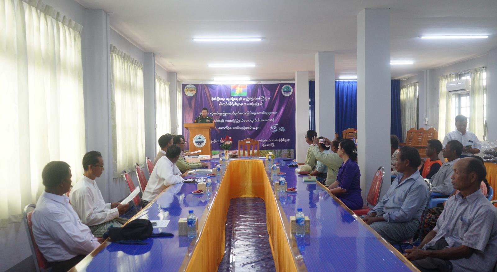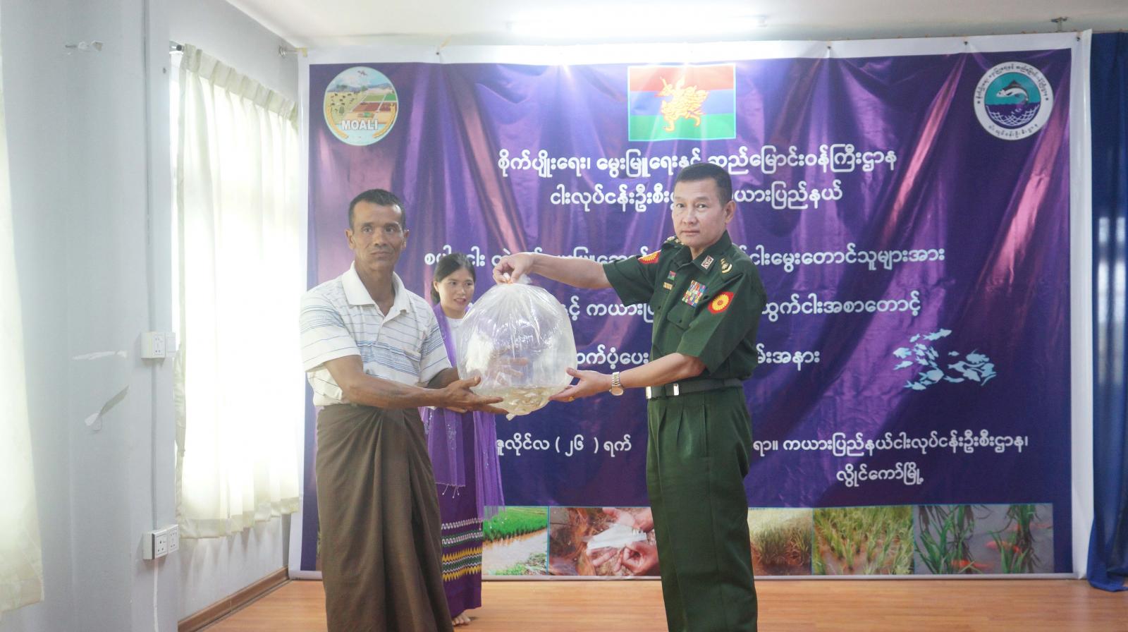 ကယားပြည်နယ်အစိုးရအဖွဲ့၏ ထောက်ပံ့မှုဖြင့် စိုက်ပျိုးရေး၊ မွေးမြူရေးနှင့် ဆည်မြောင်း ဝန်ကြီးဌာန၊ ကယားပြည်နယ် ငါးလုပ်ငန်းဦးစီးဌာနမှ စပါး-ငါး တွဲဖက်မွေးမြူ ဆောင်ရွက်နေသည့် ငါးမွေးတောင်သူများအား ငါးသားပေါက်နှင့် ကယားပြည်နယ်ဒေသထွက် ငါးအစာတောင့်များ ထောက်ပံ့ပေးခြင်းအခမ်းအနားကို ယမန်နေ့နံနက် ၉ နာရီအချိန်က လွိုင်ကော်မြို့၊ နမ့်ဘော်ဝမ်ရပ်ကွက်ရှိ ပြည်နယ်ငါးလုပ်ငန်းဦးစီးဌာန အစည်းအဝေးခန်းမ၌ ကျင်းပပြုလုပ်ခဲ့သည်။
