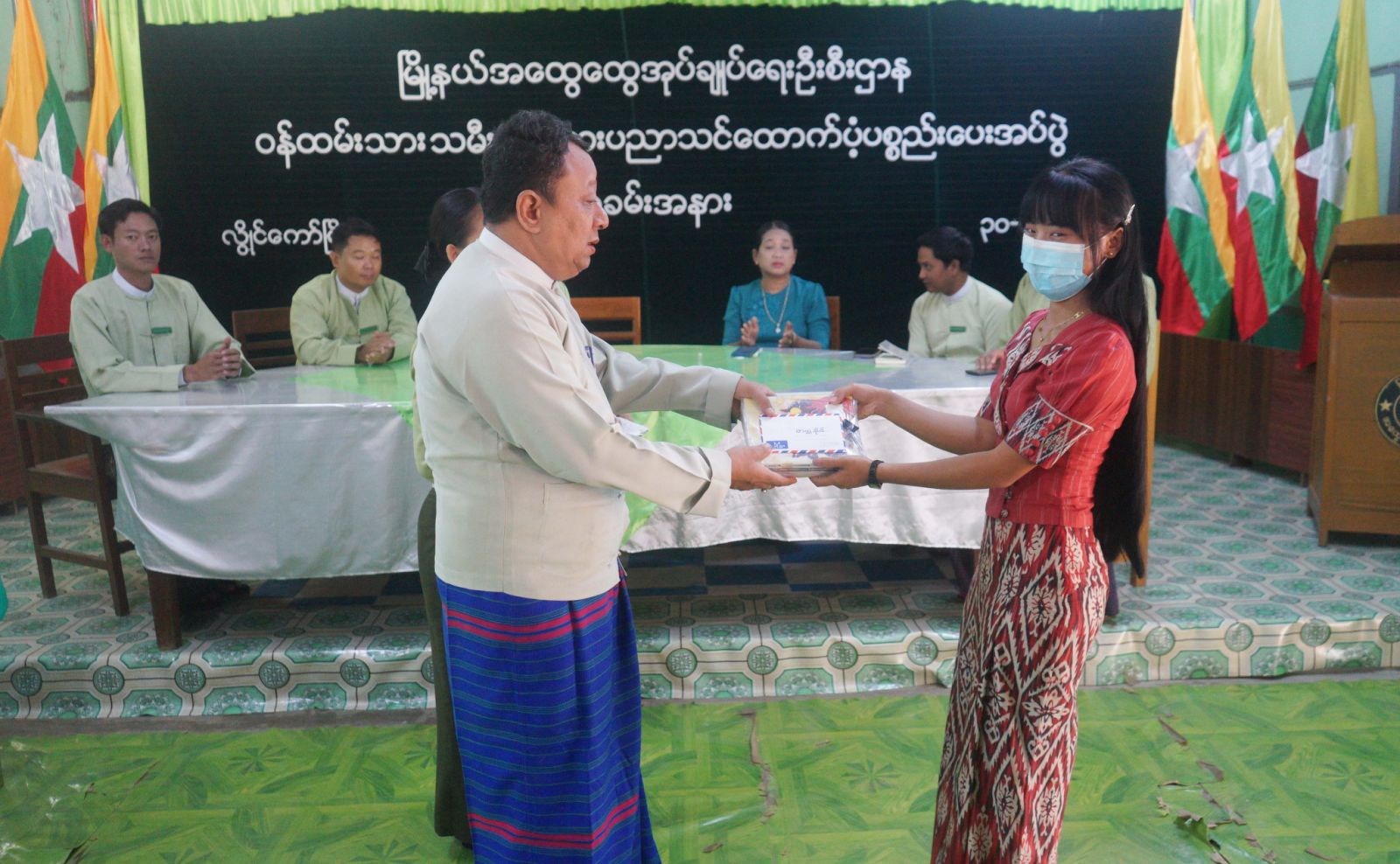 ထို့နောက် မြို့နယ်အုပ်ချုပ်ရေးမှူးနှင့် တာဝန်ရှိသူများက တက္ကသိုလ်အဆင့်နှင့် အခြေခံပညာအဆင့်တွင် တက်ရောက်ပညာသင်ကြားနေသော ကျောင်းသား၊ ကျောင်းသူ (၄၂)ဦးအား ထောက်ပံ့ငွေနှင့် ကျောင်းသုံးဗလာစာအုပ်များ ထောက်ပံ့ပေးအပ်ခဲ့ကြရာ ကျောင်းသား/ကျောင်းသူများက အသီးသီးလက်ခံရယူခဲ့ကြသည်။