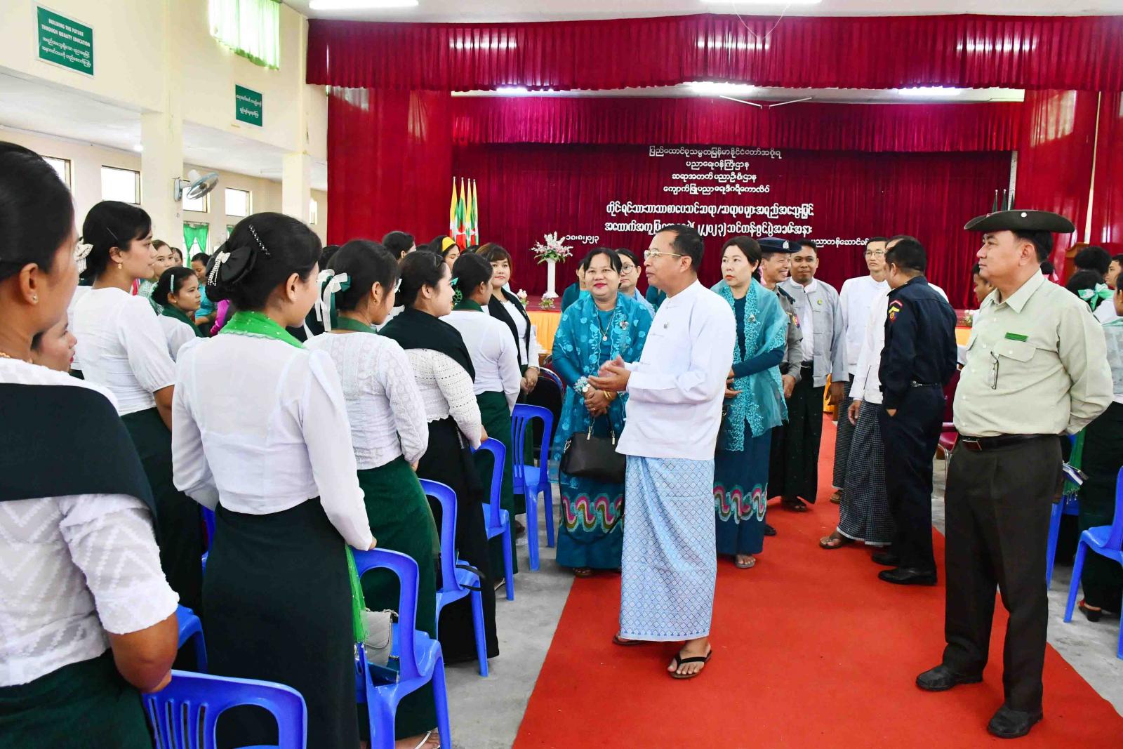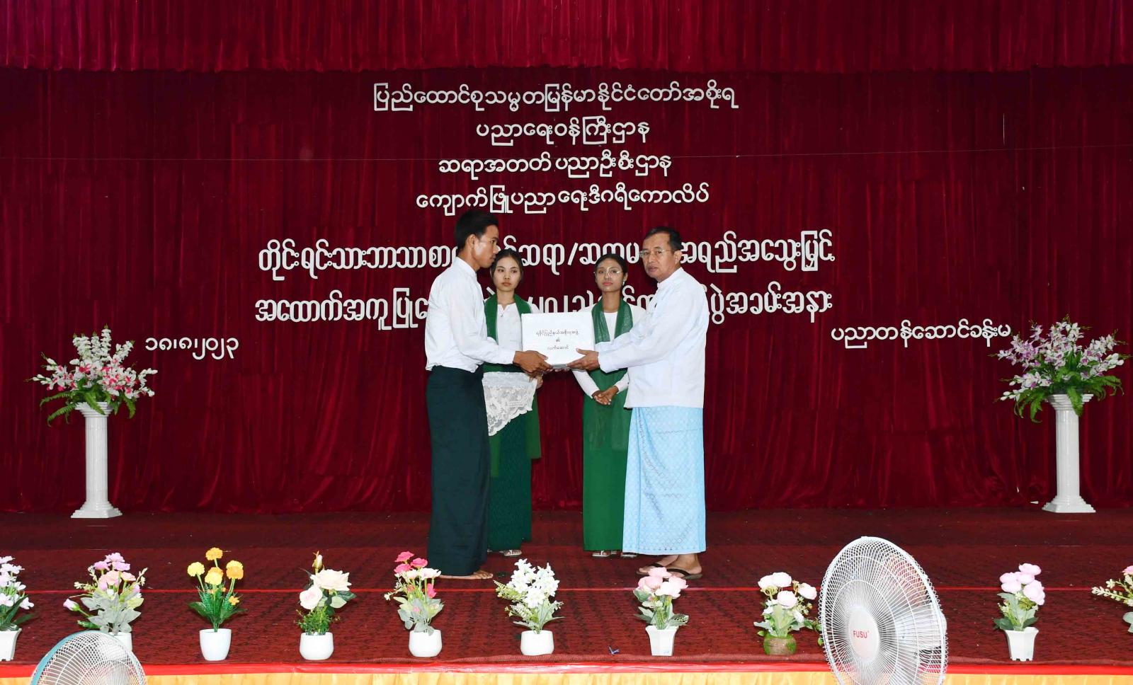 ထို့နောက် ကျောက်ဖြူပညာရေးဒီဂရီကောလိပ် ကျောင်းအုပ်ကြီး ဒေါ်မီမီဝင်းက တိုင်းရင်သားဘာသာစာပေသင် အထောက်အကူပြု ဆရာ၊ ဆရာမ သင်တန်းသား/ သင်တန်းသူများအား ကြိုဆိုနှုတ်ခွန်းဆက်စကားပြောကြားပြီး ပြည်နယ်တိုင်းရင်းသားရေးရာဝန်ကြီးက သင်တန်းသား/သင်တန်းသူများကို ရခိုင်ပြည်နယ်အစိုးရ အဖွဲ့မှပေးအပ်သည့် အမှတ်တရလက်ဆောင်များအား ပေးအပ်ရာ ကျောင်းအုပ်ကြီးနှင့် သင်တန်းသား/သင်တန်းသူများမှ လက်ခံရယူကြသည်။ ယင်းနောက် အခမ်းအနား တက်ရောက်လာကြသူများကို သင်တန်းသား/သင်တန်းသူများက တိုင်းရင်းသားရေးရာ အကအလှဖြင့် ကပြဖျော်ဖြေရာ ပြည်နယ်တိုင်းရင်းသားရေးရာဝန်ကြီးက ဂုဏ်ပြုချီးမြင့်ငွေများပေးအပ်၍ သင်တန်းသား/သင်တန်းသူများကို ရင်းရင်းနှီးနှီး လိုက်လံနှုတ်ဆက်၍ အားပေးစကားပြောကြားသည်။