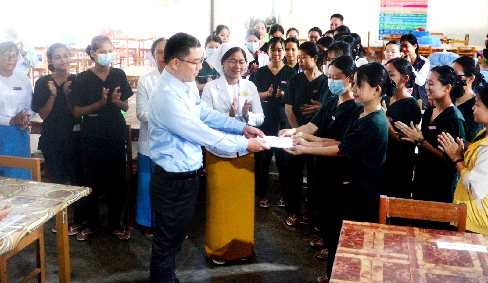 ဆက်လက်၍ ပြည်နယ်ဝန်ကြီးနှင့် တာဝန်ရှိသူများက သူနာပြုနှင့်သားဖွားသင်တန်းကျောင်းရှိ ဆရာ၊ ဆရာမများနှင့်ကျောင်းသား၊ ကျောင်းသူများစားရိပ်သာအတွက် ထောက်ပံ့ငွေများ ပေးအပ်ခဲ့ကြသည်။