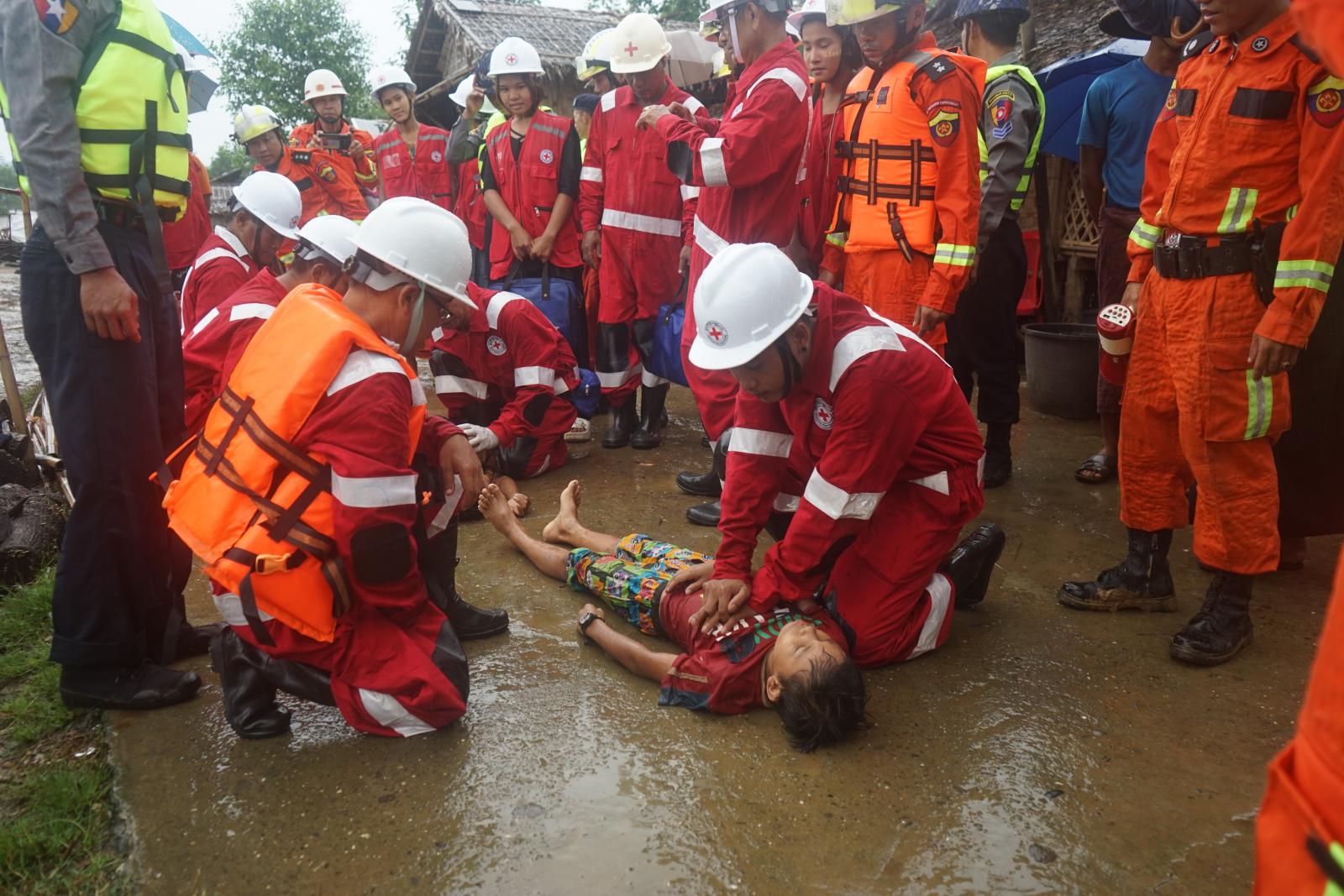 ဆက်လက်၍ ရေဘေးအန္တရာယ်သဏ္ဍာန်တူ ဇာတ်တိုက်လေ့ကျင့်ခြင်းအား ဆောင်ရွက်ခဲ့ရာ သဘာဝဘေးကြုံတွေ့လာပါက သတင်းပို့ခြင်း၊ သတိပေးကြေညာခြင်း၊ ရေဘေးသင့် ပြည်သူများအား ဘေးလွတ်ရာနေရာများသို့ ပြောင်းရွှေ့နေရာချထားခြင်း၊ လိုအပ်သော ကျန်းမာရေး စောင့်ရှောက်မှုလုပ်ငန်းများ ဆောင်ရွက်ခြင်း၊ ရေနစ်သူများအား ရှာဖွေကယ်ဆယ်၍ ရှေးဦးသူနာပြုစုခြင်းစသည့် ရေဘေးသဏ္ဍာန်တူ ဇာတ်တိုက်လေ့ကျင့်ခန်းပြုလုပ်ခြင်းများကို မီးသတ်ဦးစီးဌာနမှ မီးသတ်တပ်ဖွဲ့ဝင်များ၊ မြန်မာနိုင်ငံရဲတပ်ဖွဲ့ဝင်များ၊ ကျန်းမာရေးဝန်ထမ်းများ၊ ဘေးအန္တရာယ်ဆိုင်ရာ စီမံခန့်ခွဲမှုဦးစီးဌာနနှင့် ပြန်ကြားရေးနှင့်ပြည်သူ့ဆက်ဆံရေးဦးစီးဌာနတို့မှ ဝန်ထမ်းများ၊ ကြက်ခြေနီတပ်ဖွဲ့ဝင်များ၊ လူမှုရေးအသင်းအဖွဲ့များ၊ ဌာနဆိုင်ရာများနှင့် ဒေသခံပြည်သူများ ပူးပေါင်း၍ လုပ်ငန်းစဉ်အတိုင်း အဆင့်ဆင့် သရုပ်ပြဆောင်ရွက်ခဲ့ကြသည်။