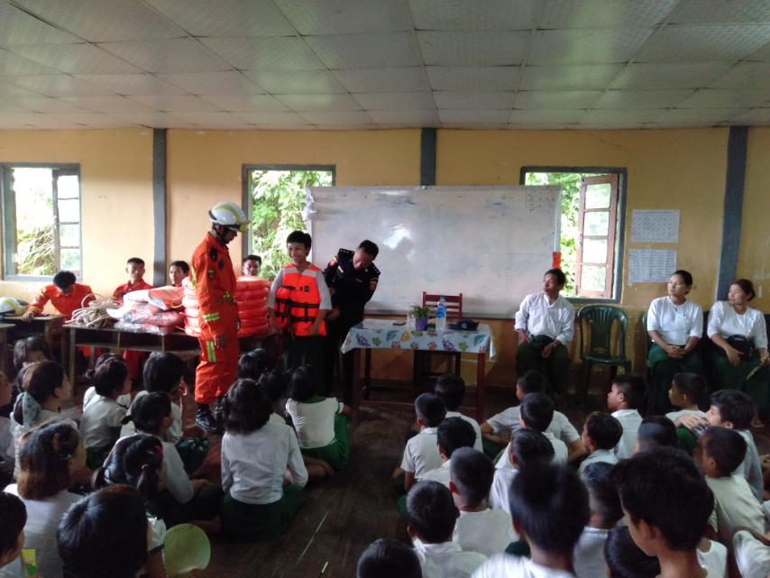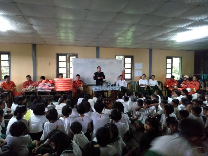မြို့နယ်မီးသတ်ဦးစီးဌာနမှ မြို့နယ်မီးသတ်ဦးစီးမှူး ဦးလှဝင်း ဦးဆောင်၍ ဆရာ/ဆရာမများနှင့် ကျောင်းသား/ကျောင်းသူများကို ရေဘေးအန္တရာယ် ကြိုတင်ကာကွယ်နိုင်ရန်အတွက် အသက်ကယ်အင်္ကျီ (Life Jacket) များစနစ်တကျဝတ်ဆင် အသုံးပြုတတ်စေရန်အတွက် မီးသတ် တပ်ဖွဲ့ဝင်များမှ လက်တွေ့သရုပ်ပြသခြင်း၊ ကျောင်းသား/ကျောင်းသူများအား (Life Jacket) များ လက်တွေ့ဝတ်ဆင်ခြင်းများ လက်တွေ့ပြသခြင်းများ ဆောင်ရွက်ခဲ့သည်။ ဆက်လက်၍ ဒုမီးသတ်ဦးစီးမှူးက ယခုအခါမိုးရာသီ သို့ရောက်ရှိလာပြီဖြစ်၍ ရုတ်တရက် လေပြင်းတိုက်ခတ်ခြင်း၊ ရေဘေးအန္တရာယ်ကြိုတင်ကာကွယ်ရေးနှင့် Life Jacket စနစ်တကျ ဝတ်ဆင်ရေး အသိပညာပေးခြင်းများ ကွင်းဆင်းဆောင်ရွက်ခဲ့ကြောင်း သိရသည်။