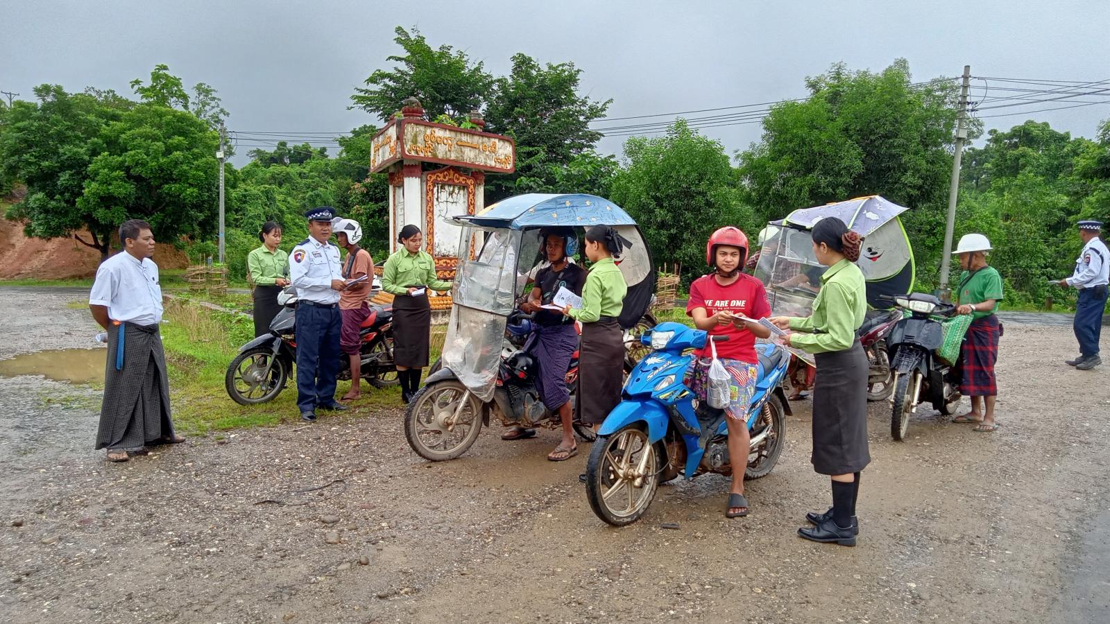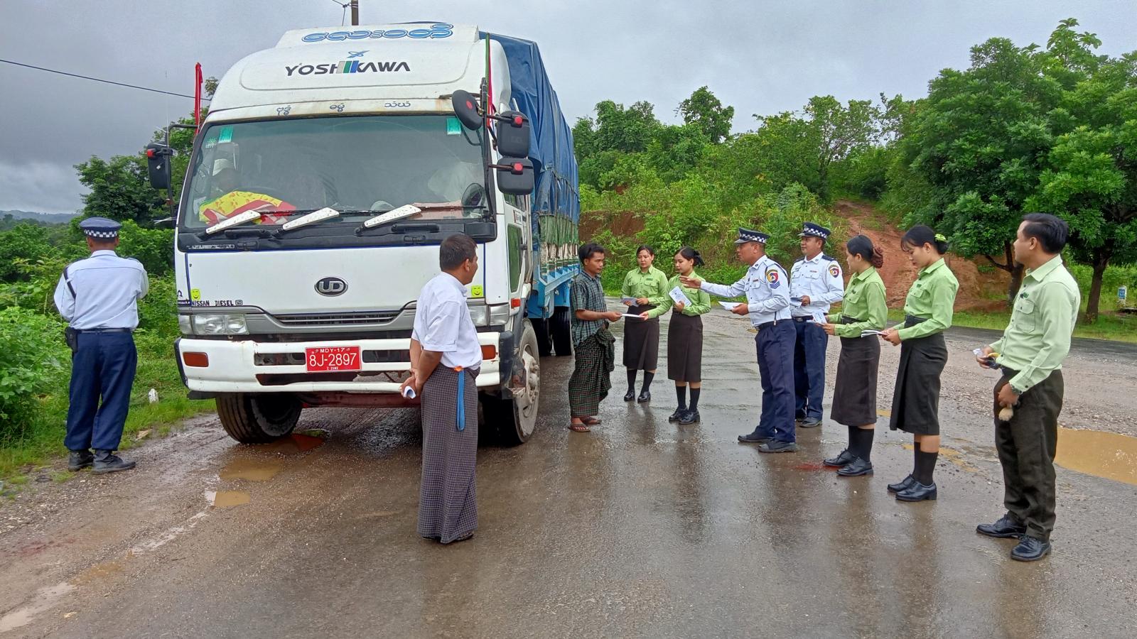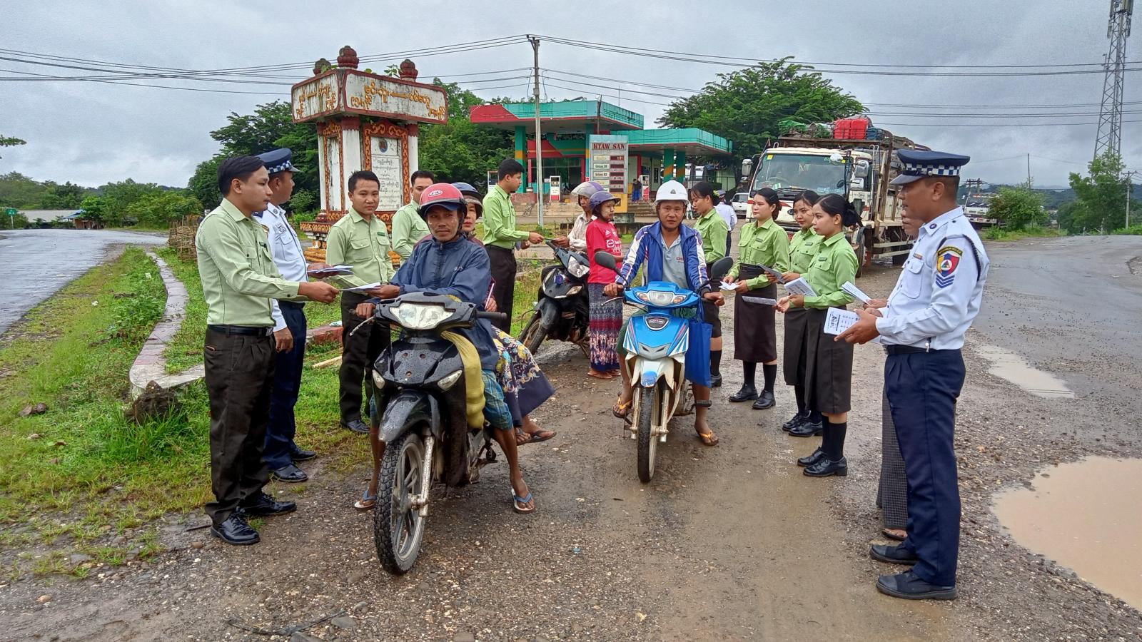 အဆိုပါ ယာဉ်လမ်းစည်းကမ်း အသိပညာပေးရာတွင် အမှတ် (၂၁) ယာဉ်ထိန်းရဲတပ်ဖွဲ့စု အမ်းယာဉ်ထိန်းရဲတပ်ဖွဲ့စိတ်မှ တပ်ဖွဲ့စိတ်မှူး ဒုရဲအုပ်သန့်ဇင်ဦးနှင့် တပ်ဖွဲ့ဝင်များ၊ မြို့နယ်ပြန်ကြားရေးနှင့်ပြည်သူ့ဆက်ဆံရေးဦးစီးဌာနမှ ဦးစီးအရာရှိ ဦးစန်းဝင်းနှင့် ဝန်ထမ်းများ၊ မြို့နယ်အထွေထွေအုပ်ချုပ်ရေးဦးစီးဌာနမှ ဒုတိယဦးစီးမှူး ဒေါ်သက်မွန်ဖြိုးနှင့် ဝန်ထမ်းများ ပူးပေါင်း၍ မြို့တွင်းသွားလာနေကြသည့် ခရီးသွားမော်တော်ယာဉ်၊ အိမ်စီးမော်တော်ယာဉ်များ၊ မော်တော်ဆိုင်ကယ်များတွင် ယာဉ်မောင်းသူ၊ စီးနင်းလိုက်ပါသူ၊ ခရီးသွားပြည်သူများအား မော်တော်ယာဉ်ဖောင်းကြွနံပါတ်ပြားအသစ်များ အမြန်ပြောင်းလဲတပ်ဆင်ရန် အသိပေးနှိုးဆော်ခြင်း၊ မော်တော်ယာဉ် မောင်းနှင်သူနှင့် မော်တော်ယာဉ် စီးနင်းလိုက်ပါသူများ အသက်ကယ်ထိုင်ခုံခါးပတ် တပ်ဆင်ကြရန်၊ ဘေးအန္တရာယ်ဖြစ်စေနိုင်သည့်အထိ မဆင်မခြင်(သို့) အရှိန်ပြင်းစွာ ပေါ့လျော့စွာ မောင်းနှင်ခြင်းမပြုရ၊ မူးယစ်ဆေးဝါး/ အရက်သေစာသုံးစွဲကာ ယာဉ်ကိုမောင်းနှင်ခြင်းမပြုရ၊ မော်တော်ယာဉ်၊ မော်တော်ဆိုင်ကယ်မောင်းနှင်စဉ် လက်ကိုင်ဖုန်းအသုံးမပြုခြင်း၊ မော်တော်ဆိုင်ကယ်မောင်းနှင်စဉ် မောင်းနှင်သူနှင့် စီးနင်းသူတို့တွင် ဆိုင်ကယ်စီးဦးထုတ်စနစ်တကျ ဝတ်ဆင်မှုရှိခြင်းတို့ကို အသိပညာပေးနှိုးဆော်ခဲ့ပြီး ယာဉ်စည်းကမ်း လမ်းစည်းကမ်း လက်ကမ်းစာစောင်(၁၅၀) စောင်ကို ဖြန့်ဝေပေးခဲ့ကြောင်း သိရသည်။