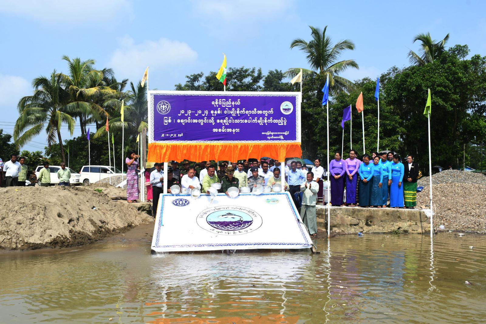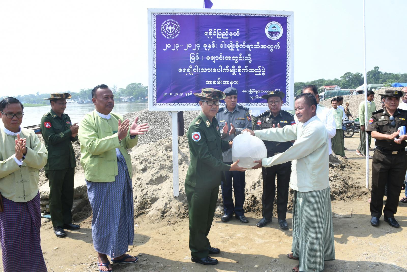 ရခိုင်ပြည်နယ်၊ မောင်တောခရိုင်၊ ဘူးသီးတောင်မြို့နယ်တွင် ငါးလုပ်ငန်းဦးစီးဌာနမှ ဒေသအတွင်း ငါးသယံဇာတများ စဉ်ဆက်မပြတ် ရေရှည်ထိန်းသိမ်းရေး၊ ငါးသယံဇာတများ မပြုန်းတီးစေရေးနှင့် ဒေသအတွင်း ဖူလုံစွာစားသောက်နိုင်ရေးအတွက် မေယုမြစ်ဖျား သဘာ၀ရေပြင်အတွင်း ရေချိုငါးသားပေါက်များ စိုက်ထည့်ခြင်းကို ယမန်နေ့ နံနက် ၁၀ နာရီ အချိန် စက်လှေဆိပ်ကမ်းအနီး တွင် ကျင်းပပြုလုပ်ရာ ခရိုင်စီမံအုပ်ချုပ်ရေးအဖွဲ့ဥက္ကဋ္ဌ ဦးနေဦးနှင့် အဖွဲ့၀င်များ၊ နယ်မြေခံ အခြေချ စစ်ဗျူးဟာမှူး ဗိုလ်မှူးကြီး တင်မိုးအောင်၊ မြို့နယ်စီမံအုပ်ချုပ်ရေးအဖွဲ့ဥက္ကဋ္ဌ ဦးဇော်၀င်းနှင့် အဖွဲ့၀င်များ၊ ဌာနဆိုင်ရာများ၊ လူမှုရေး အသင်းအဖွဲ့များနှင့် တာ၀န်ရှိသူများ တက်ရောက်ခဲ့ကြသည်။