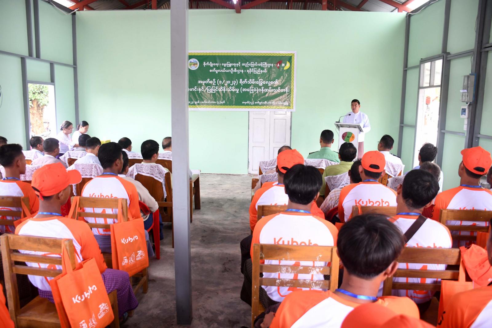 သင်တန်းဖွင့်ပွဲတွင် ပြည်နယ်ဝန်ကြီးချုပ် ဦးထိန်လင်းက ရခိုင်ပြည်နယ်တွင် ဆိုင်ကလုန်းမုန်တိုင်း (မိုခါ)ဒဏ်ကြောင့် ထိခိုက်ခဲ့သည့် တောင်သူများအတွက် ပြည်နယ်စက်မှုလယ်ယာဦးစီးဌာနမှ မြို့နယ်(၁၁)မြို့နယ်မှာ မိုးစပါးအချိန်မီ စိုက်ပျိုးနိုင်ရန် (၁၉၉၂၉)ဧကကို နိုင်ငံတော်၏အထောက်အပံ့ဖြင့် အခမဲ့ထွန်ယက်ပေးခဲ့ပြီးဖြစ်ကြောင်း၊ မကြာမီအချိန်ကာလတွင် မိုးစပါးရိတ်သိမ်းရာသီ ရောက်လာ မည်ဖြစ်သည့်အတွက် ဒေသခံ(နေ့စား)ထွန်စက်မောင်း (၃၂)ဦး၊ အမြဲတမ်းဝန်ထမ်း (၁၈) ဦးတို့ကို အလေအလွင့်နည်းပါးပြီး စက်စွမ်းအားအပြည့်နှင့် မြန်မြန်ဆန်ဆန် ရိတ်သိမ်းခြွေလှေ့နိုင်ရေးအတွက် ယခုသင်တန်းကိုဖွင့်လှစ်သင်ကြားပေးခြင်းဖြစ်ကြောင်း၊ အလေအလွင့်နည်းပါးစွာ ရိတ်သိမ်းခြွေလှေ့ နိုင်မှသာတောင်သူများ ဝင်ငွေတိုးတက်မှုရရှိမည်ဖြစ်ကြောင်း၊ သင်တန်းတွင် သင်ကြားပို့ချပေးကြမည့်ကုမ္ပဏီမှ သင်တန်းဆရာများနှင့် စက်မှုလယ်ယာဦးစီးဌာနမှ သင်တန်းဆရာများကလည်း စေတနာ ထားပြီး အားကြိုးမာန်တက်သင်ကြားပေးရန်နှင့် သင်တန်းသားများကလည်းလိုချင်စိတ်ဖြင့် ကြိုးကြိုးစားစားသင်ယူရန် ပြောကြားသည်။ ဆက်လက်၍ စက်မှုလယ်ယာဦးစီးဌာန၊ ပြည်နယ်ဦးစီးမှူး ဦးကျော်စိုးမိုးက သင်တန်းဖွင့်လှစ်ရခြင်းနှင့် စပ်လျဉ်းပြီး ရှင်းလင်းတင်ပြကာ ပြည်နယ်ဝန်ကြီးချုပ်နှင့် တာဝန်ရှိသူများက သင်တန်းသားများအား လက်တွေ့သင်ကြားနေမှုကို ကြည့်ရှုအားပေးကြသည်။