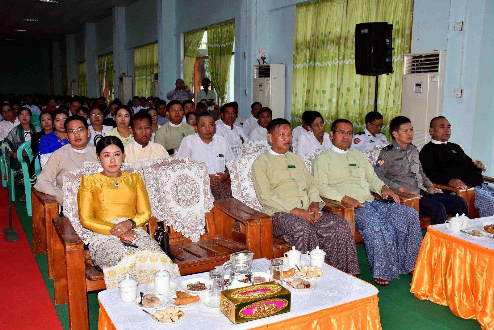 အခမ်းအနားသို့ ခရိုင်စီမံအုပ်ချုပ်ရေးအဖွဲ့ဥက္ကဋ္ဌနှင့်အဖွဲ့ဝင်များ၊ မြို့နယ်စီမံအုပ်ချုပ်ရေးအဖွဲ့ ဥက္ကဋ္ဌနှင့်အဖွဲ့ဝင်များ၊ ခရိုင်/မြို့နယ်အဆင့် ဌာနဆိုင်ရာများ၊ မြို့နယ်အနုပညာရှင်အဖွဲ့ဝင်များ၊ မြို့မိမြို့ဖများ၊ ဖိတ်ကြားထားသည့်ဧည့်သည်တော်များ၊ ဆရာ၊ဆရာများနှင့် ကျောင်းသား၊ ကျောင်းသူများ၊ ပြိုင်ပွဲဝင်များနှင့် ၎င်းတို့၏မိဘအုပ်ထိန်းသူများ တက်ရောက်ကြသည်။