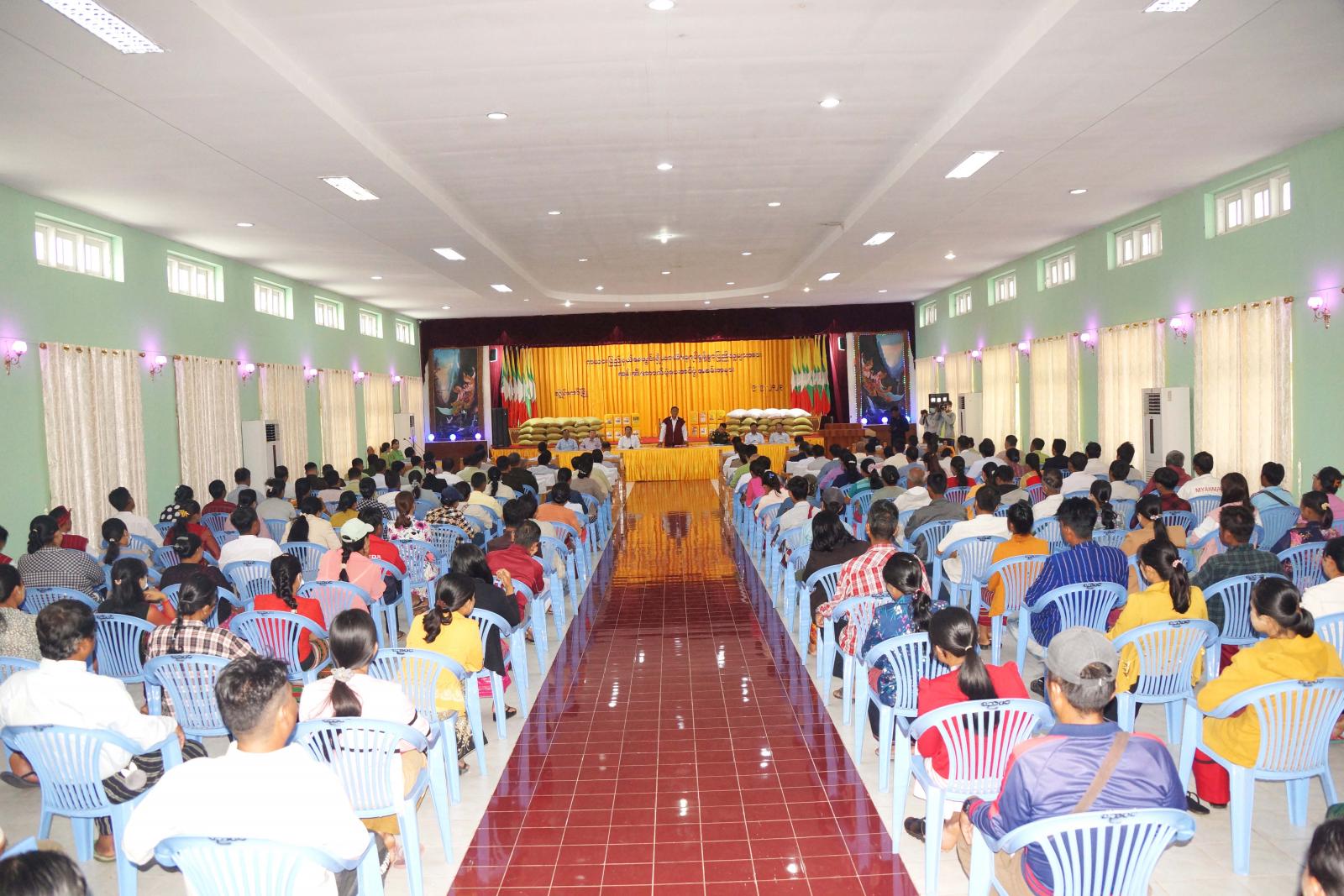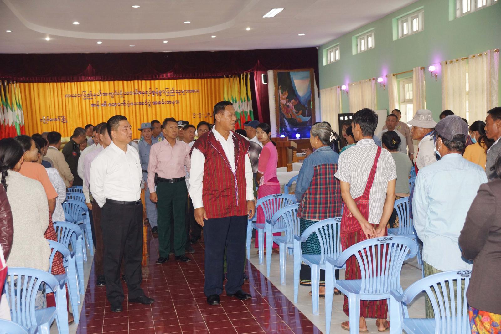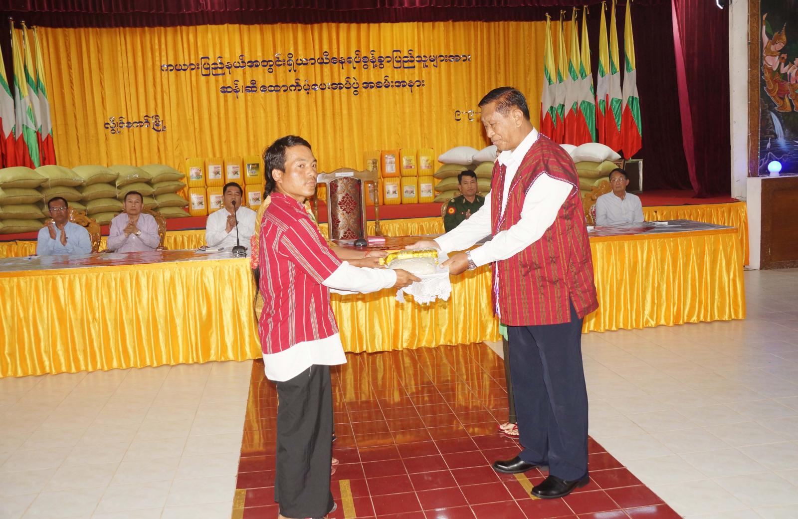 ထို့နောက် ပြည်နယ်ဝန်ကြီးချုပ်က ပြည်နယ်အတွင်း နယ်မြေတည်ငြိမ်အေးချမ်းရေးနှင့် ဒေသဖွံ့ဖြိုး တိုးတက်ရေးလုပ်ငန်း ဆောင်ရွက်နေမှု များကို ရှင်းလင်းပြောကြားခဲ့ပြီး နိုင်ငံတော်စီမံအုပ်ချုပ်ရေး ကောင်စီအဖွဲ့ဝင်၊ ပြည်နယ်ဝန်ကြီးချုပ်၊ ပြည်နယ်အစိုးရ အဖွဲ့ဝင်များနှင့် ဒေသ ကွပ်ကဲရေးမှူးတို့က ကယားပြည်နယ်အတွင်းရှိ ယာယီတိုက်ပွဲ ရှောင်ပြည်သူများအား ဆန်၊ ဆီများကို ထောက်ပံ့ပေးအပ်ခဲ့ကြရာ သက်ဆိုင်ရာ ယာယီနေရပ်စွန့်ခွာစခန်း အသီးသီးမှ ကိုယ်စားလှယ်များက လက်ခံရယူခဲ့ကြ သည်။
