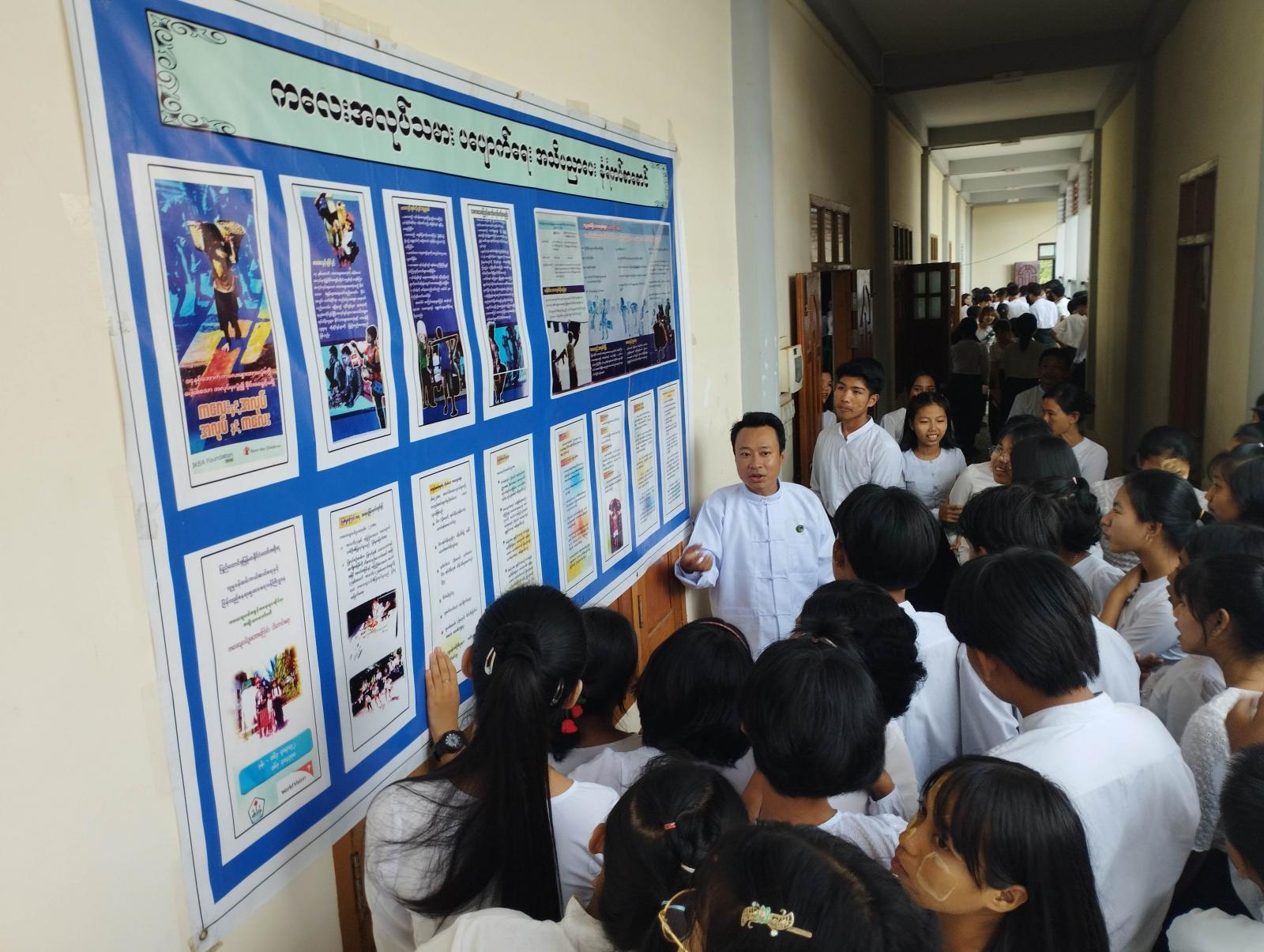 ဆက်လက်၍ အခမ်းအနားအပြီးတွင် ဟောပြောပွဲတက်ရောက်လာကြသော ကျောင်းသား/ ကျောင်းသူများက ပြန်ကြားရေးနှင့်ပြည်သူ့ဆက်ဆံရေးဦးစီးဌာနမှ ခင်းကျင်းပြသထားသည့် " ကလေးအလုပ်သမားပပျောက်ရေး " အသိပညာရေး နံရံကပ်စာစောင်နင့် " လူကုန်ကူးမှု တားဆီး ကာကွယ်ရေး " အသိပညာပေး နံရံကပ်စာစောင်တို့အား စိတ်ပါဝင်စားစွာ လေ့လာကြည့်ရှုခဲ့ကြကြောင်း သိရသည်။