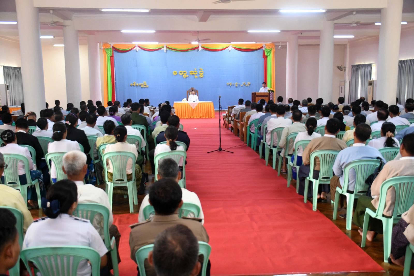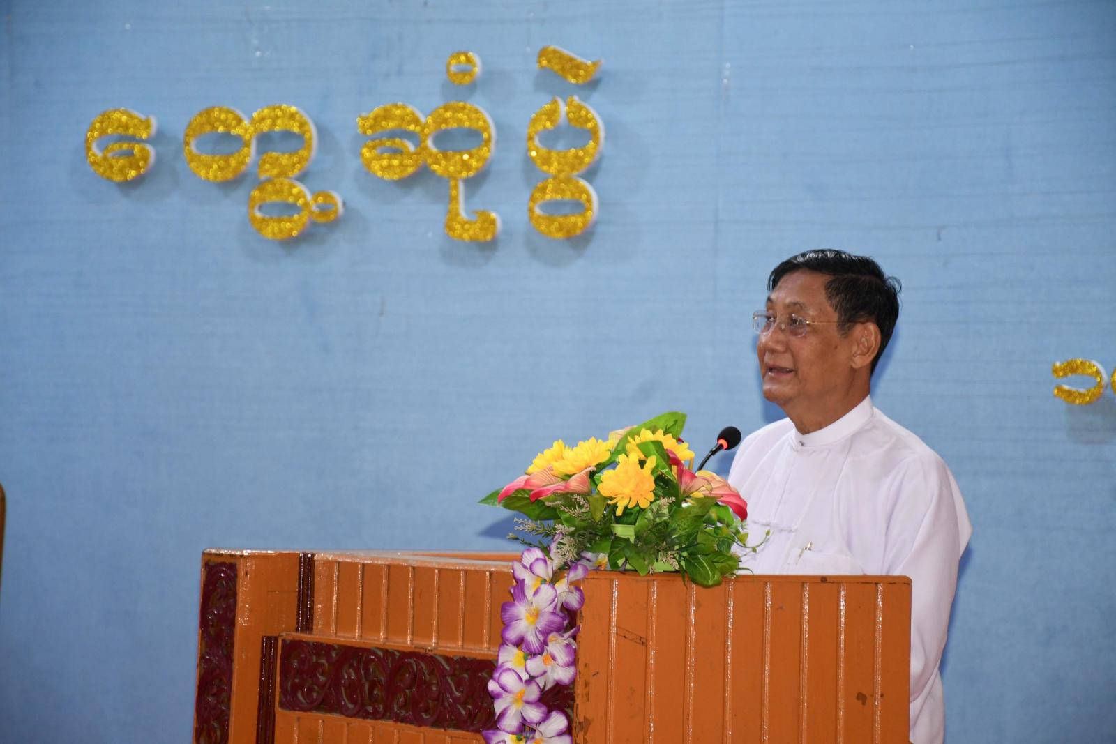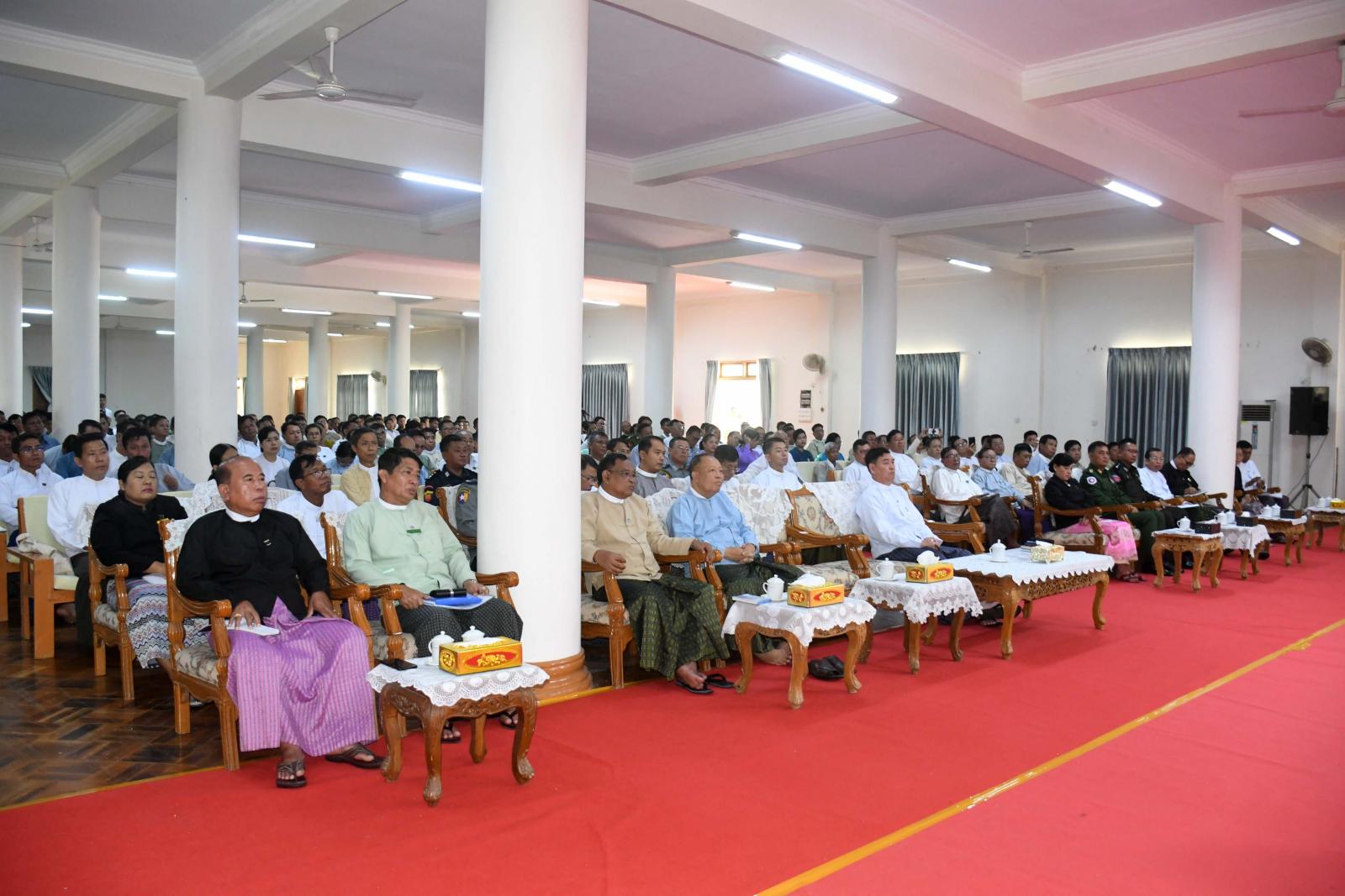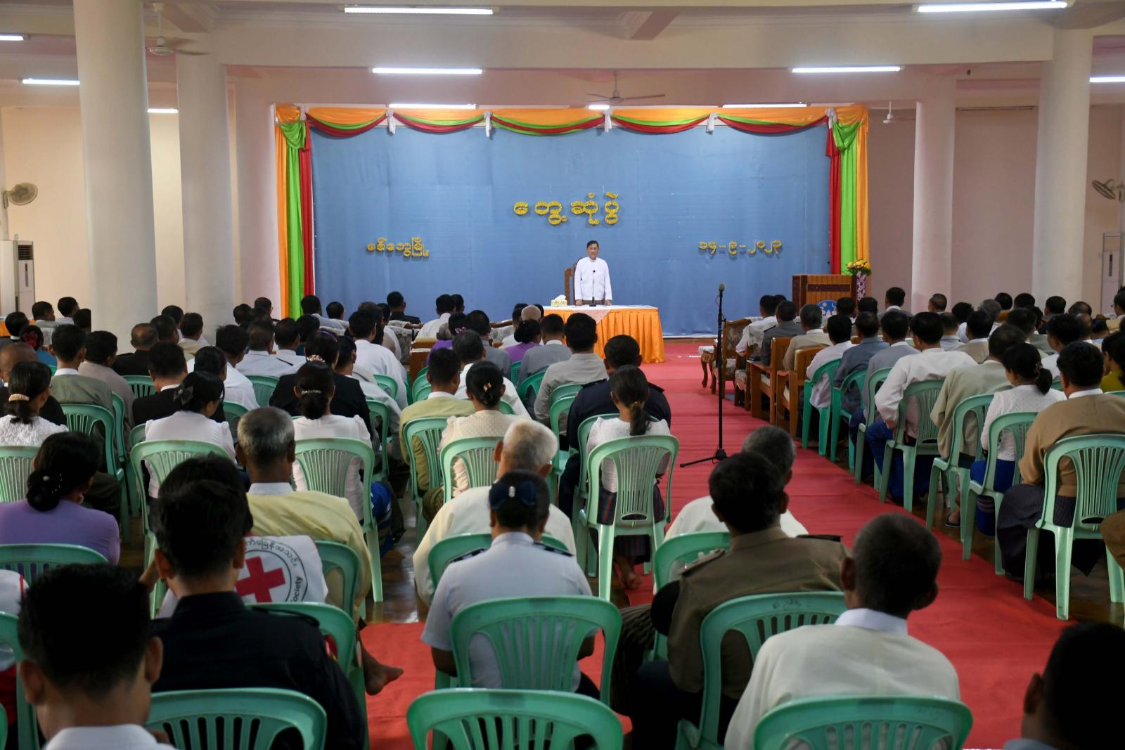 ထို့နောက် လောကာနန္ဒာစေတီတော်ပရိဝုဏ်အတွင်းရှိ သာသနာ့ဗိမာန်တော်၌ ဌာနဆိုင်ရာများ၊ မြို့မိ၊ မြို့ဖများ၊ စီးပွားရေးလုပ်ငန်းရှင်များ၊ စာပေပညာရှင်များ၊ လူမှုရေးအဖွဲ့များ၊ ရပ်ကွက်၊ ကျေးရွာအုပ်စုအုပ်ချုပ်ရေးမှူးများနှင့် တွေ့ဆုံပွဲသို့တက်ရောက်ကြသည်။ တွေ့ဆုံပွဲတွင် နိုင်ငံတော်စီမံအုပ်ချုပ်ရေးကောင်စီအဖွဲ့ဝင် ဒေါက်တာဘရွှေက မိမိတို့ ပြည်သူများသည် ဆိုင်ကလုန်းမုန်တိုင်း(မိုခါ) တိုက်ခတ်ပြီးနောက် ပြန်လည်ထူထောင်ရေးလုပ်ငန်းများကို လုပ်ကိုင်ဆောင်ရွက် လျက်ရှိသည်ကို တွေ့ရ၍ ဝမ်းမြောက်မိပါကြောင်း၊ မုန်တိုင်းမတိုက်ခတ်မီ နိုင်ငံတော်စီမံအုပ်ချုပ်ရေးကောင်စီ၏လမ်းညွှန်မှုများ၊ ပြည်နယ်အစိုးရအဖွဲ့၏ ကြီးကြပ်ဆောင်ရွက်မှုများ၊ ပြည်သူများနှင့် လူမှုရေးအဖွဲ့ အစည်းများ၏ ပူးပေါင်းပါဝင်ဆောင်ရွက်မှုကြောင့် ကြိုတင်ရွှေ့ပြောင်းခြင်းများဆောင်ရွက်ခဲ့ရာ ထိခိုက်ဆုံးရှုံးမှုအနည်းဆုံးဖြင့် မုန်တိုင်းကာလကို ဖြတ်ကျော်နိုင်ခဲ့သည်ကို တွေ့ရကြောင်း၊ သဘာဝကို မိမိတို့အနေဖြင့်တားဆီး၍ မရနိုင်သို့သော်လည်း ကျော်ဖြတ်နိုင်ရမည်ဖြစ်သည့်အတွက် ယခုအခါ ကျော်ဖြတ်နိုင်ခဲ့ပြီဖြစ်ကြောင်း၊ မုန်တိုင်းဒဏ်ကိုကျော်ဖြတ်ခဲ့ပြီး နောက်တွင် ပြန်လည်ထူထောင်ရေးလုပ်ငန်းများကို လုပ်ဆောင်ကြရမည်ဖြစ်ကြောင်း၊ နိုင်ငံတော်စီမံအုပ်ချုပ်ရေးကောင်စီအနေဖြင့် ရှေ့လုပ်ငန်းစဉ် (၅)ရပ်၊ ဦးတည်ချက်(၉) ရပ်ချမှတ်ကာ တည်ငြိမ်အေးချမ်းရေး၊ တရားဥပဒေစိုးမိုးရေးနှင့် ဖွံ့ဖြိုးတိုးတက်ရေးလုပ်ငန်းများကို ဆောင်ရွက်လျက်ရှိကြောင်း၊ နိုင်ငံတော်စီမံအုပ်ချုပ်ရေးကောင်စီ၏ နိုင်ငံရေးရည်မှန်းချက်မှာ စစ်မှန်၍ စည်းကမ်းပြည့်ဝသည့် ပါတီစုံဒီမိုကရေစီစနစ် ခိုင်မာရေးနှင့် ဒီမိုကရေစီနှင့်ဖက်ဒရယ်စနစ်ကို အခြေခံသည့် ပြည်ထောင်စုတည်ဆောက်နိုင်ရေးပင်ဖြစ်ကြောင်း၊ ဖက်ဒရယ်စနစ်သည် လူမျိုးကိုအခြေခံ၍ ဆောင်ရွက်နေခြင်းမဟုတ်ဘဲ ဒေသကိုအခြေခံသည့်စနစ်ကို အဓိကထားဆောင်ရွက် ခြင်းဖြစ်ကြောင်း၊ ပြည်ထောင်စုစိတ်ဓာတ်သည် အရေးအကြီးဆုံးဖြစ်ကြောင်း၊ ထို့ပြင် ကျေးလက်နေပြည်သူများနှင့် ဝေးလံဒေသများမှ တိုင်းရင်းသားပြည်သူများ စာတတ်မြောက်ရေး၊ အတန်းပညာတတ်မြောက်ရေးကို ဆောင်ရွက်လျက်ရှိကြောင်း၊ တိုင်းပြည်တစ်ပြည်တိုးတက်ရန် အခြေခံမှာပညာတတ်များ ပေါကြွေဝခြင်းပင်ဖြစ်ကြောင်း၊ ထို့ကြောင့် အသိပညာ၊ အတတ်ပညာနှင့်ပြည့်စုံသည့် လူသားအရင်းအမြစ်ကောင်းများ မဖြစ်မနေလိုအပ်နေသည့်အတွက် နိုင်ငံသားတိုင်း ပညာရည် မြင့်မားရေးကို နိုင်ငံတော်အစိုးရအနေဖြင့် ဆောင်ရွက်လျက်ရှိကြောင်း၊ အလားတူ စိုက်ပျိုးရေး၊ မွေးမြူရေးလုပ်ငန်းများ ဖွံ့ဖြိုးတိ