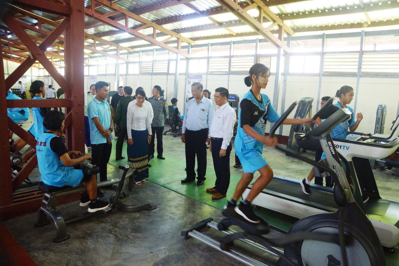 ဆက်လက်၍ ခန်းမအတွင်း ခင်းကျင်းပြသထားသော အားကစားလှုပ်ရှားမှုဆိုင်ရာ မှတ်တမ်းဓါတ်ပုံများ၊ အားကစားနည်းများအလိုက် အသုံးပြုသောပစ္စည်းများ၊ ကျောင်းဝင်းအတွင်းရှိ သင်တန်းသား၊ သင်တန်းသူများ၏ အိပ်ဆောင်၊ စာကြည့်တိုက်၊ ကွန်ပျူတာခန်းနှင့် အားကစား ခန်းမအတွင်း အားကစားသမားများက အားကစားနည်းများအလိုက် လေ့ကျင့်ဆောင်ရွက်နေမှုများကို လှည့်လည်ကြည့်ရှုအားပေးခဲ့ကြကာ ပြည်နယ်ဂုဏ်ဆောင်၊ နိုင်ငံ့ဂုဏ်ဆောင်ထူးချွန် အားကစားသမားများ ဖြစ်အောင်ကြိုးစားသွားကြရန် မှာကြားခဲ့ကြောင်း သိရသည်။