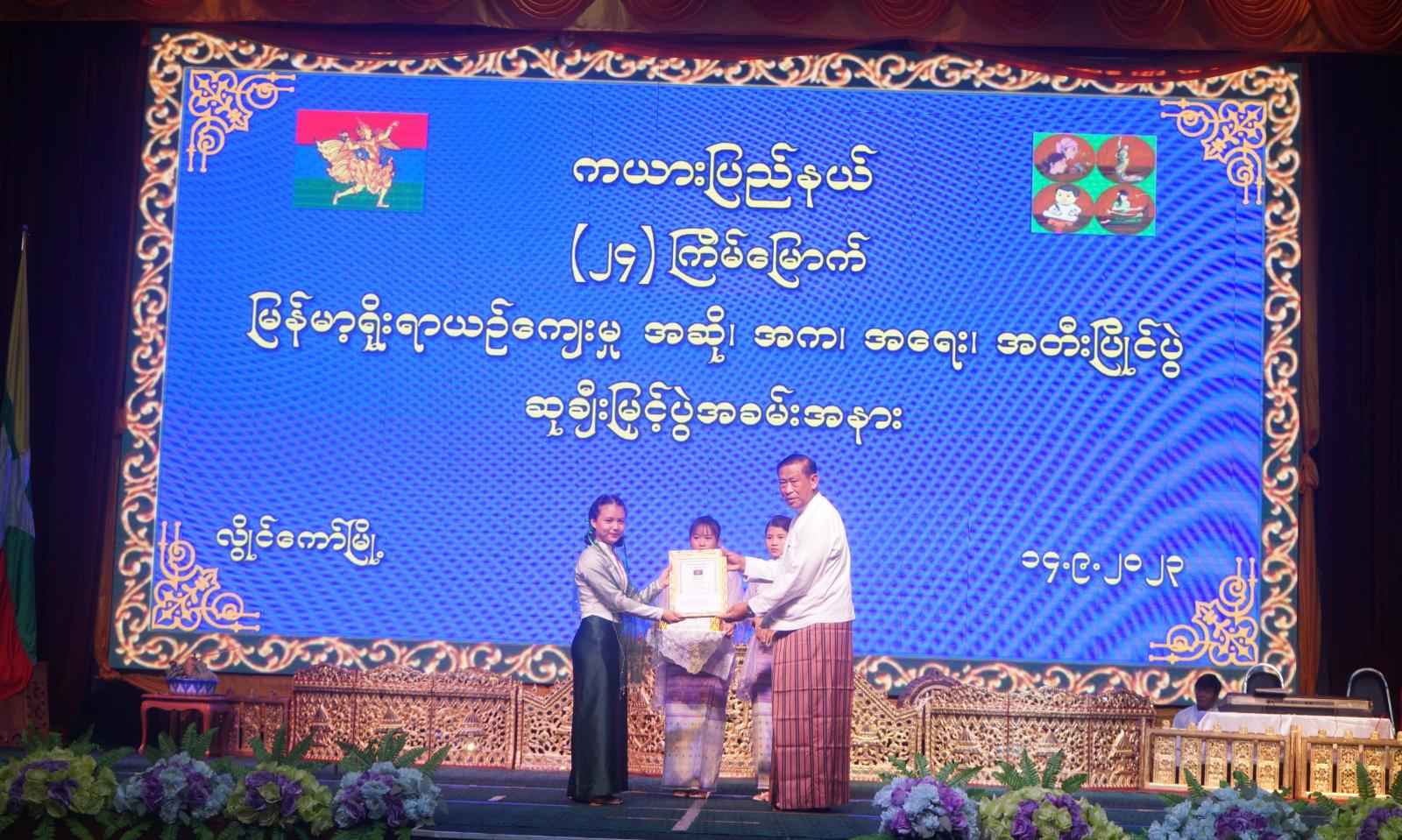 ကယားပြည်နယ် ၊ ၂၀၂၃ ခုနှစ် ၊ (၂၄)ကြိမ်မြောက် မြန်မာ့ရိုးရာယဉ်ကျေးမှု အဆို ၊ အက ၊ အရေး၊ အတီးပြိုင်ပွဲ(ပြည်နယ်အဆင့်) ဆုချီးမြှင့်ခြင်း အခမ်းအနားကို ယမန်နေ့နံနက်ပိုင်းက လွိုင်ကော်မြို့ ၊ ပြည်နယ်ခန်းမ၌ ကျင်းပပြုလုပ်ခဲ့သည်။