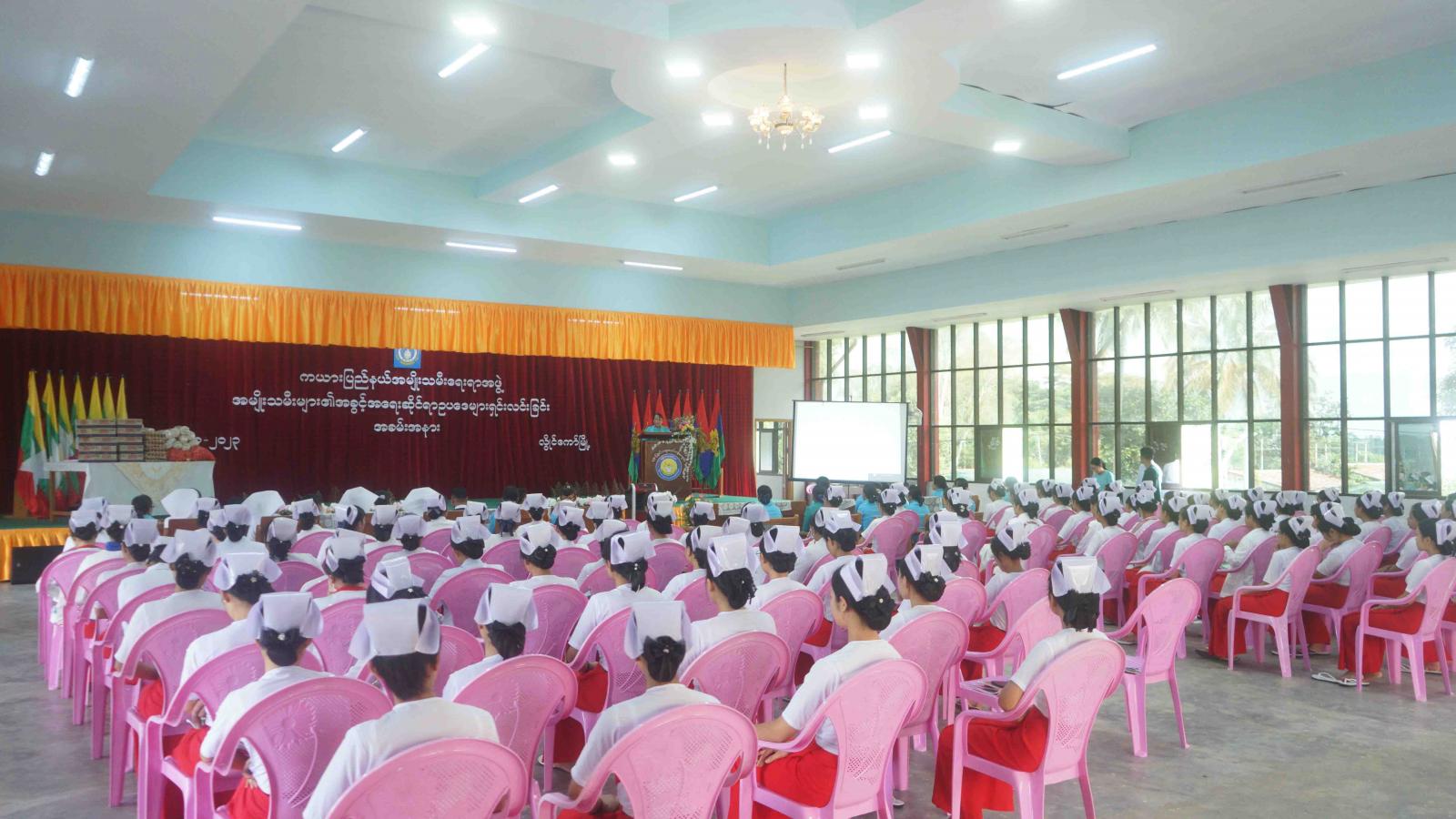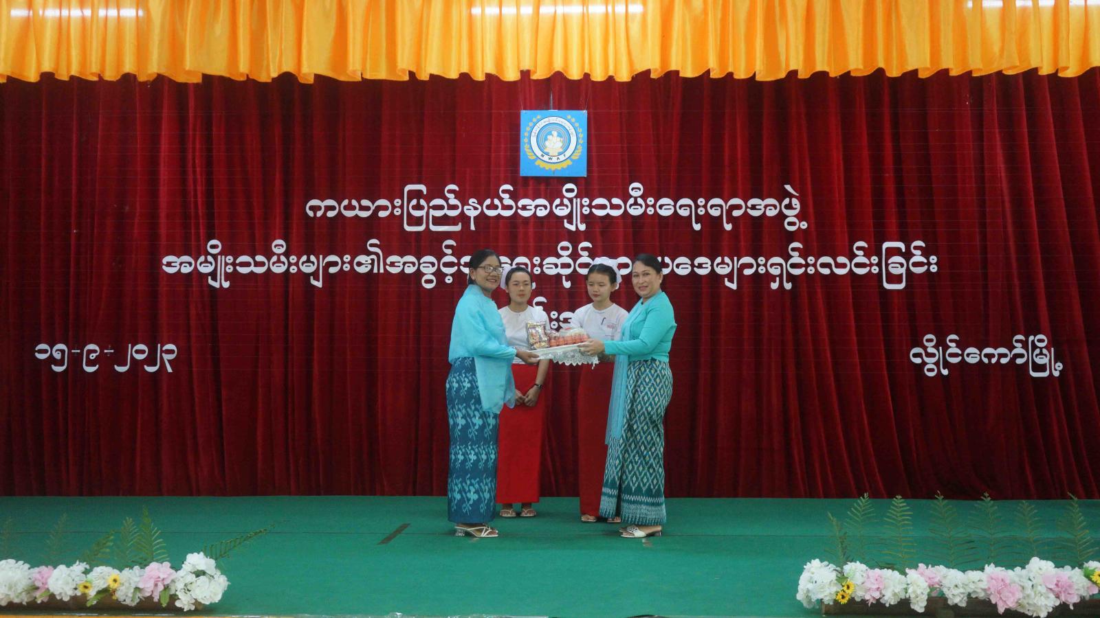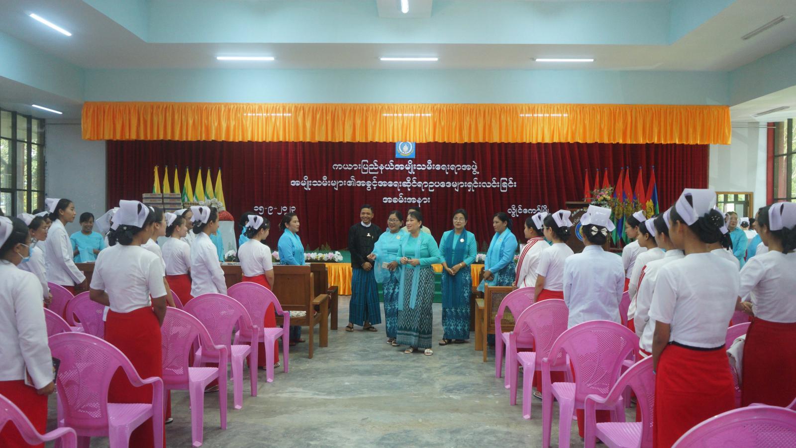 ထို့နောက် ကယားပြည်နယ်အမျိုးသမီးရေးရာအဖွဲ့ ဥက္ကဋ္ဌ ဒေါ်ဘောက်နန်က အမျိုးသမီးရေးရာ အဖွဲ့ချုပ်အကြောင်းအားလည်းကောင်း၊ ကယားပြည်နယ်ဥပဒေအရာရှိ ဦးသိန်းထွန်းက အမျိုးသမီးများ၏ အခွင့်အရေးဆိုင်ရာ ဥပဒေများအကြောင်းအားလည်းကောင်း ရှင်းလင်း ပြောကြားခဲ့ကြပြီး ပြည်နယ်အမျိုးသမီးရေးရာအဖွဲ့ နာယက ဒေါ်နွယ်နီဝင်းက သူနာပြုနှင့် သားဖွားသင်တန်းကျောင်းရှိသင်တန်းသား၊ သင်တန်းသူများအတွက် အခြေခံ စားသောက်ကုန်များ ပေးအပ်ခဲ့ရာ ကျောင်းအုပ်ကြီး ကလက်ခံရယူခဲ့သည်။