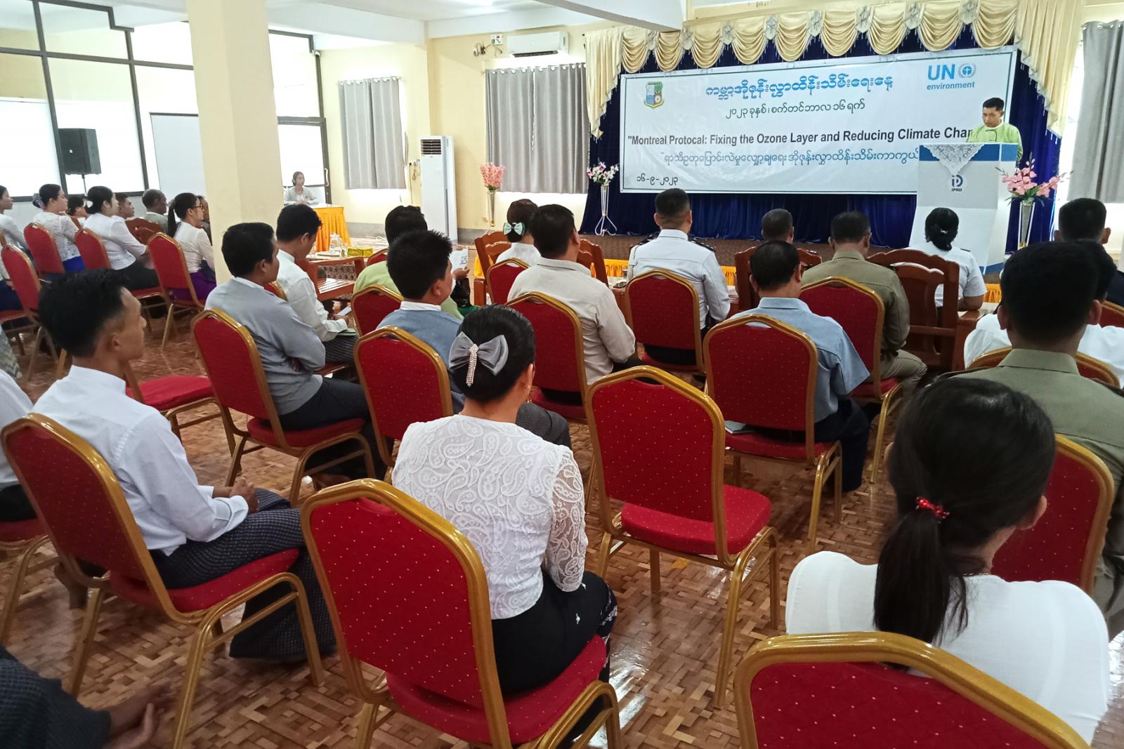 အခမ်းအနားတွင် ခရိုင်စီမံအုပ်ချုပ်ရေးအဖွဲ့ဥက္ကဋ္ဌ ဦးမျိုးချစ်က အဖွင့်အမှာစကား ပြောကြားသည်။ ထိုသို့ပြောကြားရာတွင် ကမ္ဘာပေါ်မှာရှိသည့် သက်ရှိတွေကို ကောင်းကျိုးပြုနေတဲ့အိုဇုန်းလွှာဟာ သဘာဝရဲ့လက်ဆောင်မွန်ဖြစ်ပါကြောင်း၊ အိုဇုန်းလွှာသည် အိုဇုန်းမော်လီကျူးတွေအများဆုံးတည်ရှိသည့် ကမ္ဘာမြေပြင်အထက် အမြင့်၁၅ကီလိုမီတာမှ ၃၅ ကီလိုမီတာကြားတွင်ရှိသည့် ကမ္ဘာ့လေထု၏ ဒုတိယအလွှာ စထက်ရက်တိုစဖီးယားအလွှာမှာ သဘာဝအလျောက်တည်ရှိနေပြီး ကမ္ဘာမြေပေါ်ကိုကျရောက်လာသည့် ခရမ်းလွန်ရောင်ခြည် (၃)မျိုးအနက် အပင်နှင့်သက်ရှိတွေများအား အလွန်အန္တရာယ်ဖြစ်စေသော ခရမ်းလွန်ရောင်ခြည် ((UV-B)နှင့် (UV-C)ကို စုပ်ယူထားသည့်အတွက် ကမ္ဘာမြေပေါ်ကိုမကျရောက်တော့ဘဲအပင်နှင့် သက်ရှိတွေကိုအကာအကွယ်ပေးပြီး အကျိုးပြုနေခြင်းဖြစ်ပါကြောင်း အိုဇုန်းလွှာပျက်စီးရခြင်းအကြောင်းရင်းများ ၊ အိုဇုန်းလွှာကာကွယ်ရေးဆိုင်ရာများ ၊ ကမ္ဘာ့နိုင်ငံများ လက်ရှိကြုံတွေ့နေရသည့် ရာသီဥတုဆိုင်ရာစိန်ခေါ်မှုဆိုင်ရာများနှင့် မြန်မာနိုင်ငံအနေဖြင့် အိုဇုန်းလွှာပျက်စီးစေသည့် အအေးပေးဒြပ်ပစ္စည်းတစ်မျိုးဖြစ်သည့် ဟိုက်ဒရိုကရိုလိုဖလူရိုကာဗွန် HCFC သုံးစွဲမှုကို လျော့ချရပ်ဆိုင်းနိုင်ဖို့အတွက် HCFC ဓာတ်ပစ္စည်းများကို ပြည်တွင်းသို့တင်သွင်းအသုံးပြုခြင်းကို ၂၀၁၅ ခုနှစ်မှစတင်ပြီး ကန့်သတ်ပမာဏအတိုင်း ဒြပ်ပစ္စည်းဆိုင်ရာလုပ်ငန်း လုပ်ကိုင်ခွင့်အမိန့်အရ လိုင်စင်စနစ် ခွဲတမ်းစနစ်ဖြင့် ခွင့်ပြု၍ နှစ်အလိုက် လျှော့ချလျက်ရှိပြီး ၂၀၂၄ ခုနှစ်တွင် အပြီးသတ်ရပ်ဆိုင်းသွားမည်ဖြစ်သည်။ ပြည်သူများအနေဖြင့် ယခုနှစ် ကမ္ဘာအိုဇုန်းလွှာထိန်းသိမ်းရေးနေ့ ဆောင်ပုဒ်ဖြစ်သည့် “ရာသီဥတုပြောင်းလဲမှု လျှော့ချရေးအိုဇုန်းလွှာထိန်းသိမ်းကာကွယ်ပေး”ဟူသောဆောင်ပုဒ်နှင့်အညီ အိုဇုန်းလွှာကိုဝိုင်းဝန်း ထိန်းသိမ်းကာကွယ်သွားကြရေး အကျယ်တဝင့်ပြောကြားခဲ့သည်။