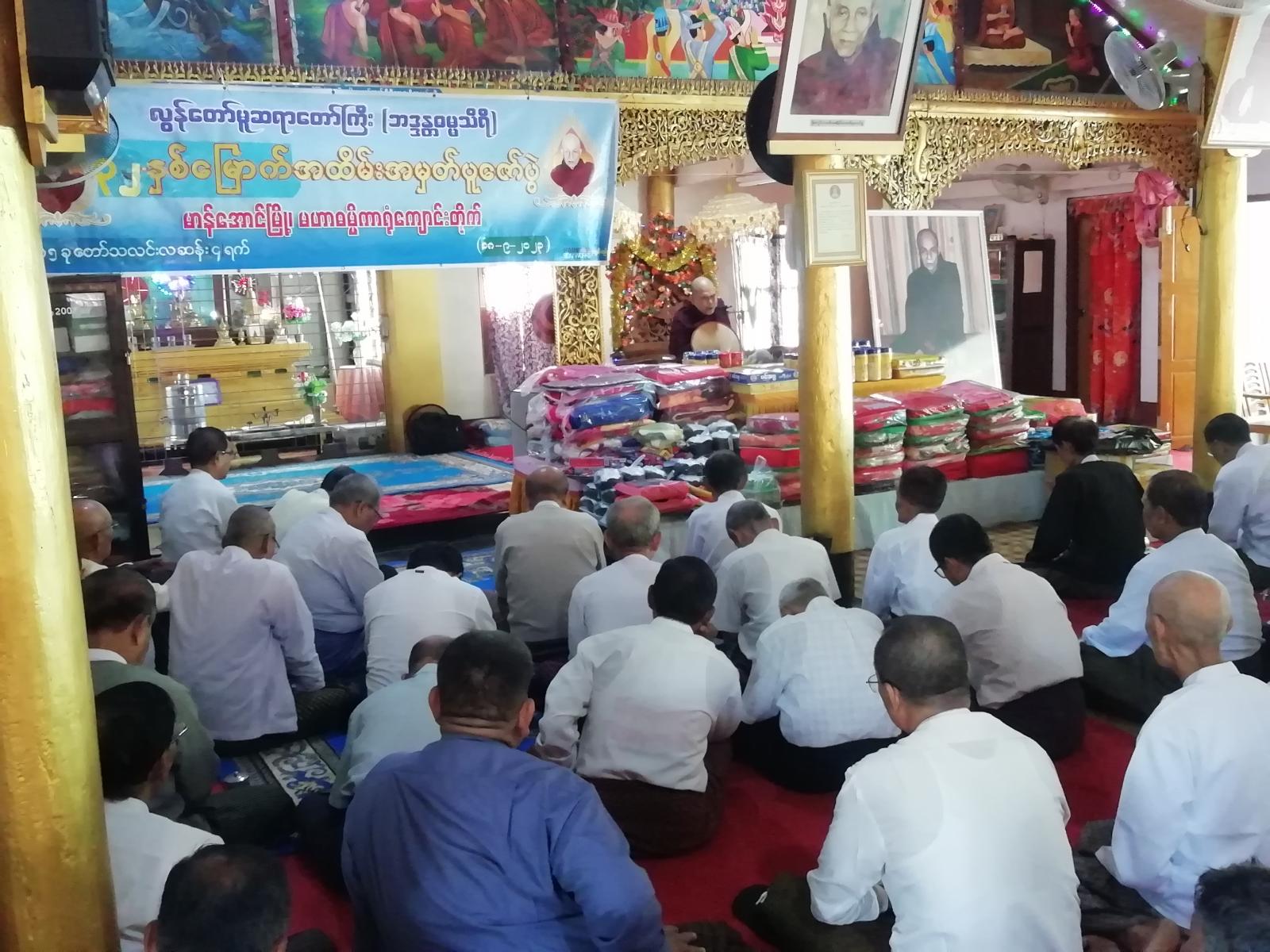 ထို့နောက် သံဃာတော်များက ပရိတ်တရားတော်များကို ချီးမြှင့်ကြပြီး ပြည်နယ်သံဃာ့ဝန်ဆောင် အတွင်းရေးမှူး (ရွှေကျင်) ဒိုးတန်းကျောင်း ဆရာတော်ဘဒ္ဒန္တမဟောသဓထံမှ လွန်တော်မူဆရာတော်ကြီး၏ အောက်မေ့ဖွယ်ရာ သီလဂုဏ်၊ သမာဓိဂုဏ်၊ ပညာဂုဏ် ကျေးဇူးတော်များနှင့် သာဓုအနုမောဒနာ တရားတော်မြတ်ကို နာယူကြပြီး လှူဒါန်းမှုအစုစုတို့အား ရေစက်သွန်းချအမျှပေးဝေကာ အခမ်းအနားကို ဗုဒ္ဓသာသနံ စိရံတိဋ္ဌတု သုံးကြိမ်ရွတ်ဆို အခမ်းအနားပြီးဆုံးခဲ့ကြောင်း သိရသည်။