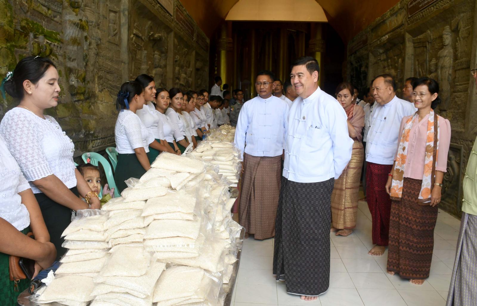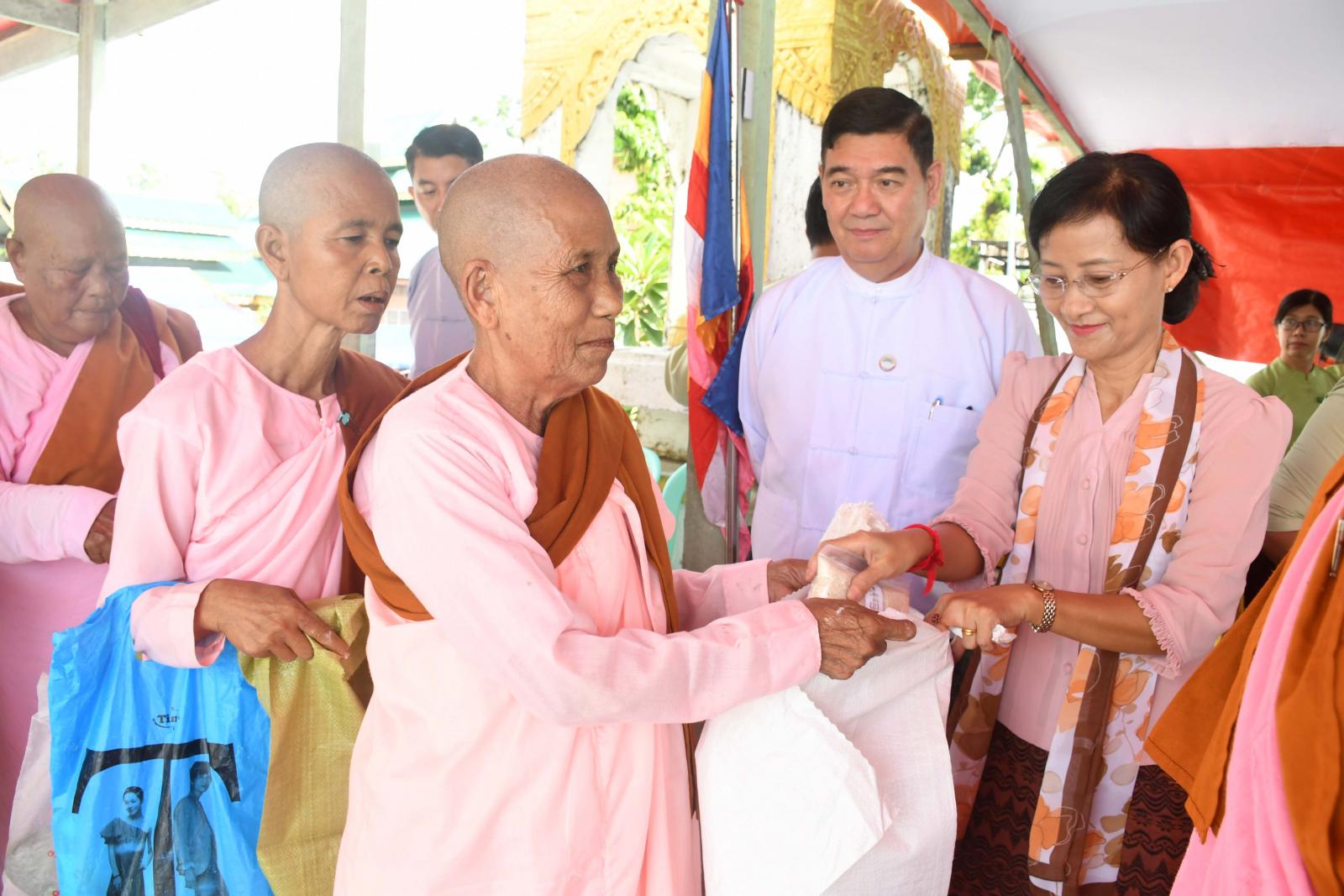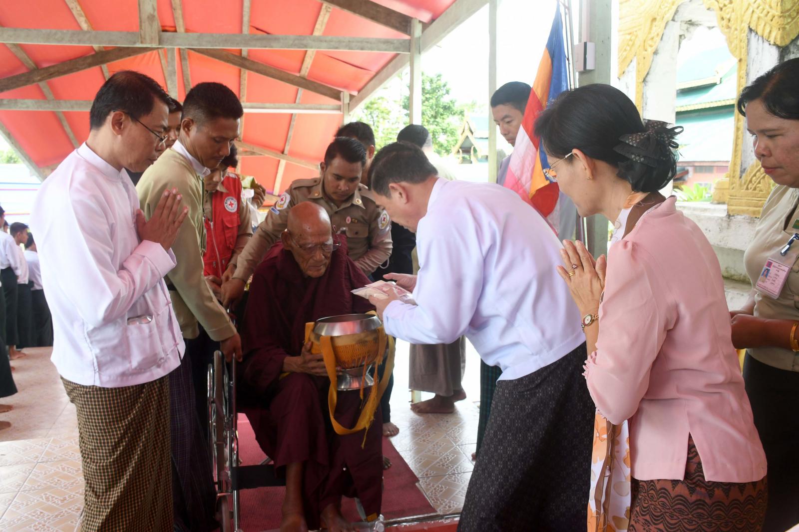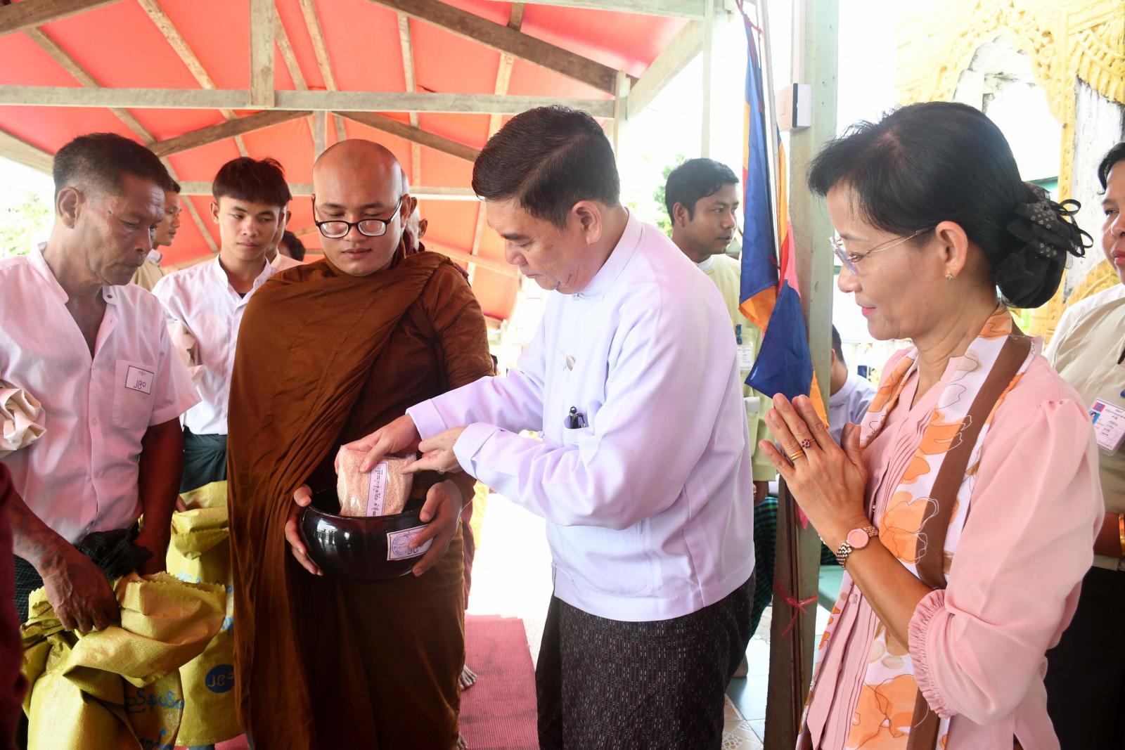 ဆက်လက်၍ ပြည်နယ်ဝန်ကြီးချုပ်နှင့်ဇနီး၊ ပြည်နယ်ဝန်ကြီးများက ဦးဆောင်ကာ ကြွရောက် တော်မူကြသော ထေရ်ကြီး၊ ဝါကြီးဆရာတော်ကြီးများနှင့် သံဃာတော်များအား ဆွမ်းဆန်တော်နှင့် လှူဖွယ်ပစ္စည်းများကို လောင်းလှူကြသည်။ ဆွမ်းဆန်တော်လောင်းလှူပွဲသို့ စစ်တွေမြို့ပေါ်ရှိ ထေရ်ကြီး၊ ဝါကြီးဆရာတော်ကြီးများ၊ ကျောင်းတိုက်အသီးသီးမှ ရဟန်း၊ သံဃာများနှင့် သာမဏေများ၊ သီလရှင်များကြွရောက်တော်မူကြပြီး ဆွမ်းဆန်တော်များ အလှူခံကြသည်။