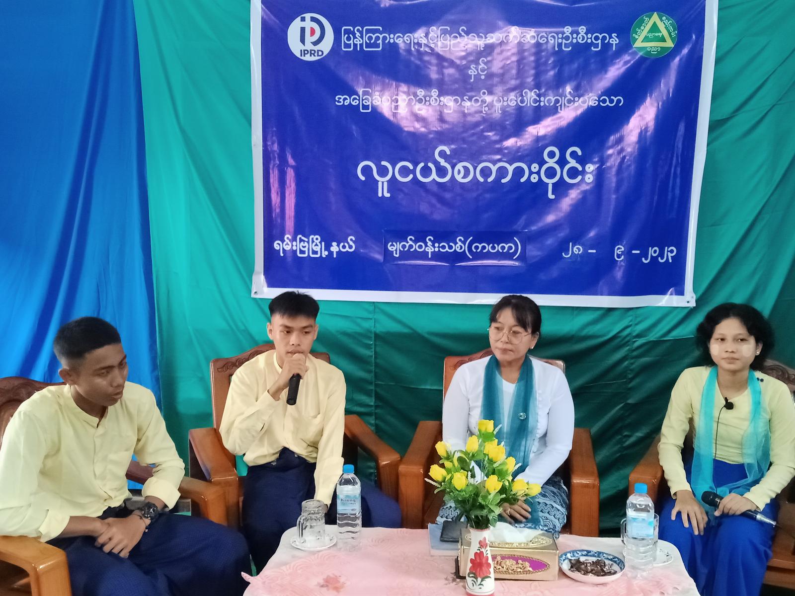 ဆက်လက်၍ ပြန်ကြားရေးနှင့်ပြည့်သူ့ဆက်ဆံရေးဦးစီးဌာမှ ဦးစီးအရာရှိ ဒေါ်အောင်တင်ကြည်က ကျောင်းသား/ကျောင်းသူများအား လူငယ်တွေ အောင်မြင်ရေးနည်းလမ်းနှင့် ဗလငါးတန်ဖွံ့ဖြိုးရေးအတွက် နိုင်ငံတော်၏ လူမှုရေးဦးတည်ချက် တတိယအချက်တွင် နိုင်ငံ၏ဖွံ့ဖြိုးတိုးတက်ရေး လုပ်ငန်းစဉ်များ၌ လူငယ်များအနေဖြင့် အဓိကစွမ်းအားစုအဖြစ် ပါဝင်နိုင်ရေး ဗလငါးတန်နှင့်ပြည့်စုံသော လူငယ်များဖြစ်စေရန် လူငယ်ကဏ္ဍကို မြှင့်တင်ဆောင်ရွက်ရေးဟူသည့် အချက်များ ချမှတ်ထားပါကြောင်း ခေတ်သစ်လူ့အဖွဲ့အစည်းမှာ ပညာတတ်မြောက်မှုက အလွန်ပင်ရေးကြီးပါကြောင်း အထူးသဖြင့် မိမိတို့နိုင်ငံရဲ့လူဦးရေ သုံးပုံတစ်ပုံက လူငယ်တွေဖြစ်ကြပြီး လူငယ်တွေက ပညာတတ်မြောက်မှု မြင့်မားမှသာ တိုင်းပြည်၏ အနာဂတ် ဖွံ့ဖြိုးသာယာမည်ဖြစ်ကြောင်းနှင့် ပညာဖြင့်လူ့ဘဝ၊ ကျေးလက်ဘဝမြှင့်တင်ခြင်း၊ အနာဂတ်တိုင်းပြည်တာဝန်များကို ပခုံးပြောင်းထမ်းရွက်ကြမည့် ကျောင်းသား/သူ လူငယ်များ၊ မိမိဒေသမှာ ခေါင်းဆောင်တာဝန်ယူကြမည့်လူငယ်များ အသိပညာဗဟုသုတတိုးပွားစေရန်၊ ဝိုင်းဖွဲ့ဦးဆောင်ဆွေးနွေးတတ်သည့် အလေ့အထများရရှိစေရန်၊ အဖွဲ့အစည်းစိတ်ဓာတ်ဖြင့် ပူးပေါင်းပါဝင်ဆောင်ရွက်တတ်စေရန်၊ စဉ်းစားတွေးခေါ်မှုစွမ်းရည်များ ရင့်သန်လာစေပြီး အကောင်း၊ အဆိုး၊ အမှား၊ အမှန်ကို ကိုယ်ပိုင်ဉာဏ်ဖြင့် ချင့်ချိန်၍ ဆုံးဖြတ်ချက်များ ချမှတ်နိုင်စေရန်၊ လူအများရှေ့မှောက်တွင်စကားပြောဆိုရာ၌ ပြောရဲဆိုရဲသတ္တိ ပြောတတ်ဆိုတတ်စေရန် နှုတ်မူစွမ်းရည်များ တိုးတက်လာစေရန် ရည်ရွယ်၍ လူငယ်စကားဝိုင်း ဆွေးနွေးပွဲကို ကျင်းပပေးခဲ့ခြင်း ဖြစ်ပါကြောင်း လူငယ်စကားဝိုင်းကျင်းပရခြင်း၏ ရည်ရွယ်ချက်အား ရှင်းလင်းပြောကြားခဲ့သည်။