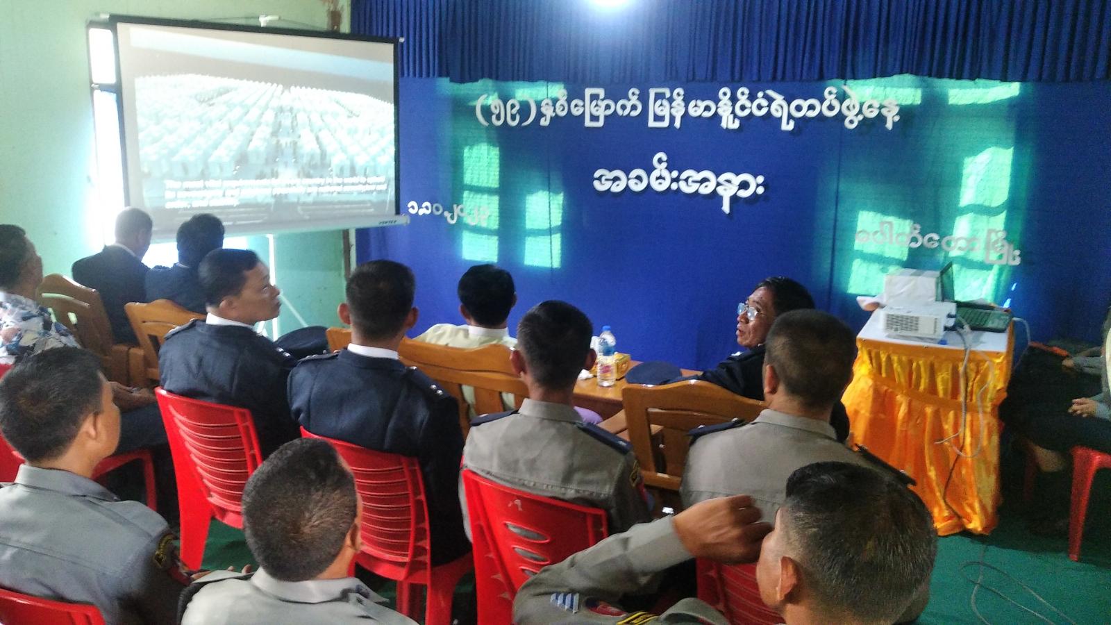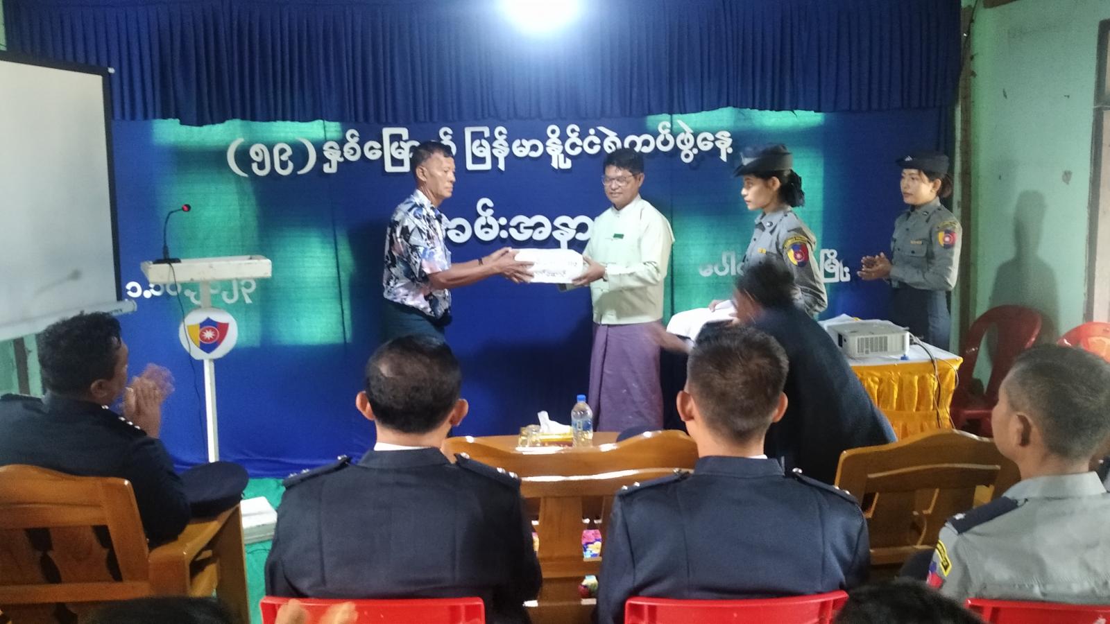 ထို့နောက် မြို့နယ်စီမံအုပ်ချုပ်ရေးအဖွဲ့ ဥက္ကဋ္ဌ ဦးကျန်အေးက ရဲမှုထမ်းဟောင်းအဖွဲ့ဝင်များကို လက်ဆောင်ပစ္စည်းများပေးအပ်ချီးမြှင့်ပြီး (၅၉) နှစ်မြောက် မြန်မာနိုင်ငံရဲတပ်ဖွဲ့နေ့ အထိမ်းအမှတ် Video Clip အားပြသသည်။