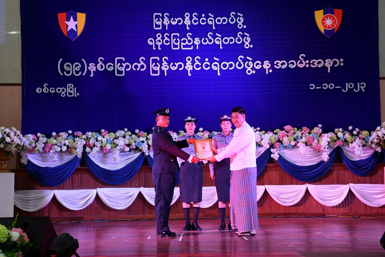 ထို့နောက် ပြည်နယ်ဝန်ကြီးချုပ်၊ ပြည်နယ်တရားလွှတ်တော်တရားသူကြီးချုပ်နှင့် တာဝန်ရှိသူများက မှုခင်းများ ဖော်ထုတ်၊ ဖမ်းဆီးရမိမှုတွင် စွမ်းစွမ်းတမံ ဆောင်ရွက်ခဲ့ကြသည့် တပ်ဖွဲ့ဝင်များအား ရာထူးတိုး တံဆိပ်တပ်ဆင်ခြင်း၊ ဂုဏ်ပြုမှတ်တမ်းလွှာများ ပေးအပ်ခြင်းနှင့် ဂုဏ်ပြုချီးမြှင့်ကြသည်။ ယင်းနောက် မြန်မာနိုင်ငံရဲတပ်ဖွဲ့နေ့ အထိမ်းအမှတ် (Video Clip) အား ပြသပြီး ပြည်နယ်ဝန်ကြီးချုပ်နှင့် တာဝန်ရှိသူများက အထိမ်းအမှတ်ပြခန်းများအား လှည့်လည်ကြည့်ရှုကြကာ စုပေါင်းမှတ်တမ်းတင်ဓာတ်ပုံ ရိုက်ကူးကြသည်။