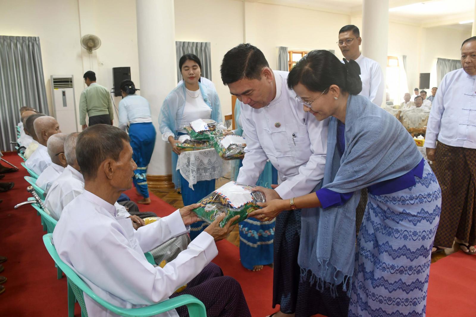ထို့နောက် ပြည်နယ်ဝန်ကြီးချုပ် ဦးထိန်လင်းနှင့်ဇနီး ပြည်နယ်အမျိုးသမီးရေးရာအဖွဲ့ နာယက ဒေါ်ဆွေဆွေမြတ်၊ ပြည်နယ်အစိုးရအဖွဲ့ဝင်များနှင့် ဇနီးများက ဦးဆောင်ကာ သက်ကြီးဘိုးဘွားများအား ထောက်ပံ့ငွေနှင့် ဂုဏ်ပြုပစ္စည်းများ ပေးအပ်ကြသည်။