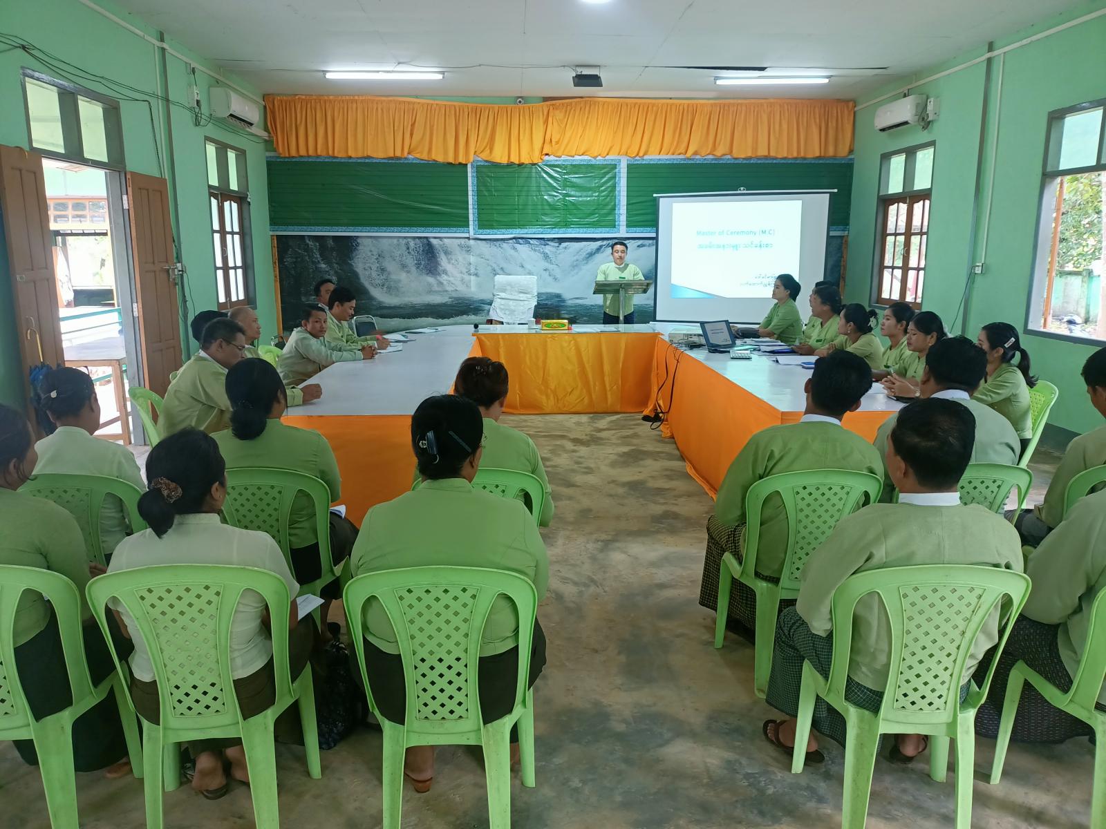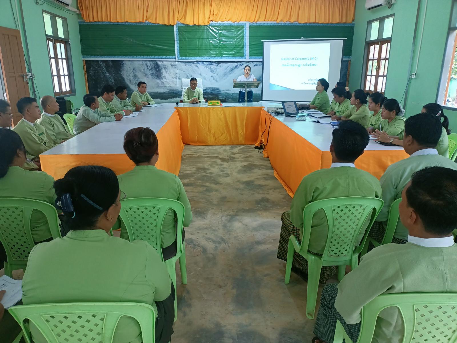 သင်တန်းတွင် မြို့နယ်စီမံအုပ်ချုပ်ရေးအဖွဲ့ဥက္ကဋ္ဌ၊ မြို့နယ်အုပ်ချုပ်ရေးမှူး ဦးဇော်ဝင်းက ဝန်ထမ်းများအနေဖြင့် အခမ်းအနားများကျင်းပဆောင်ရွက်ရာတွင် အခမ်းနားတစ်ခုလုံးကို အဆင်ပြေပြေချောမွေ့စွာ ဆောင်ရွက်နိုင်စေရန်နှင့် အခမ်းနားမှူးကောင်းများ ပေါ်ထွက်လာစေရန်၊ အခမ်းအနားများတွင် အမှားအယွင်းမရှိ စနစ်တကျ အစီအစဉ်အတိုင်း ဆောင်ရွက်တတ်စေရန်နှင့် စကားအသုံးအနှုန်း မှန်ကန်စွာပြောဆိုဆောင်ရွက်တတ်စေရန် စသည့်ရည်ရွယ်ချက်များဖြင့် သင်ကြားပို့ချပေးခြင်းဖြစ်ပြီး သင်တန်းသူများအနေဖြင့် သင်ကြားပို့ချသူနည်းပြများ၏ သင်ကြားပြသပေးမှုအပေါ် စိတ်ဝင်တစားဖြင့် လေ့လာမှတ်သားကြစေလိုကြောင်း ပြောကြားခဲ့သည်။