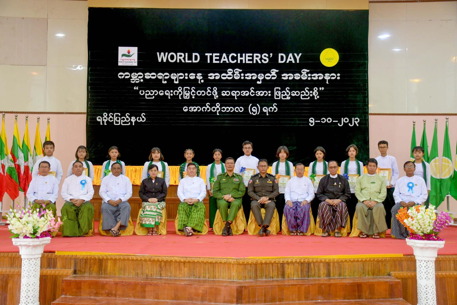 ၂၀၂၃ ခုနှစ်၊ အောက်တိုဘာလ ၅ ရက်နေ့တွင် ကျရောက်သည့် ကမ္ဘာ့ဆရာများနေ့အခမ်းအနားကို ယမန်နေ့နံနက်ပိုင်းက စစ်တွေမြို၊ ခိုင်သဇင်ခန်းမ၌ ကျင်းပရာ ရခိုင်ပြည်နယ်ဝန်ကြီးချုပ် ဦးထိန်လင်း၊ ပြည်နယ်အစိုးရအဖွဲ့ဝင်များ၊ ဌာနဆိုင်ရာများ၊ အပူဇော်ခံဆရာကြီး၊ ဆရာမကြီးများနှင့် ဆရာ၊ ဆရာမများ၊ ကျောင်းသား၊ ကျောင်းသူများ၊ ဖိတ်ကြားထားသူများတက်ရောက်ကြသည်။