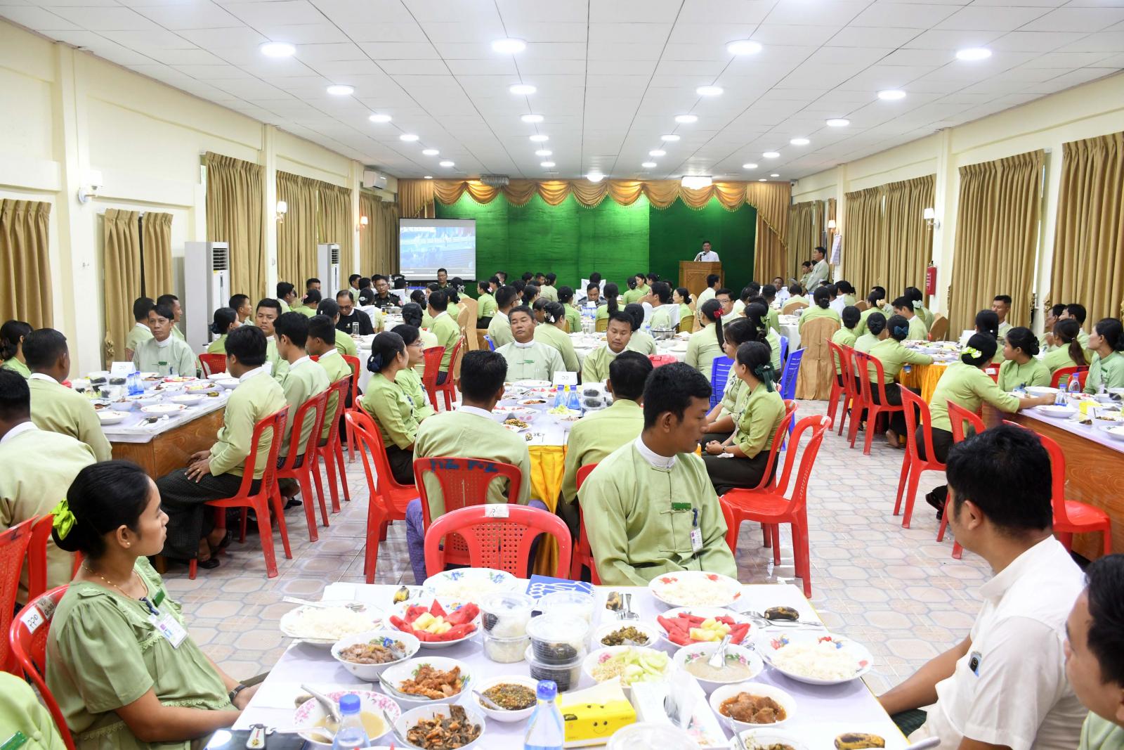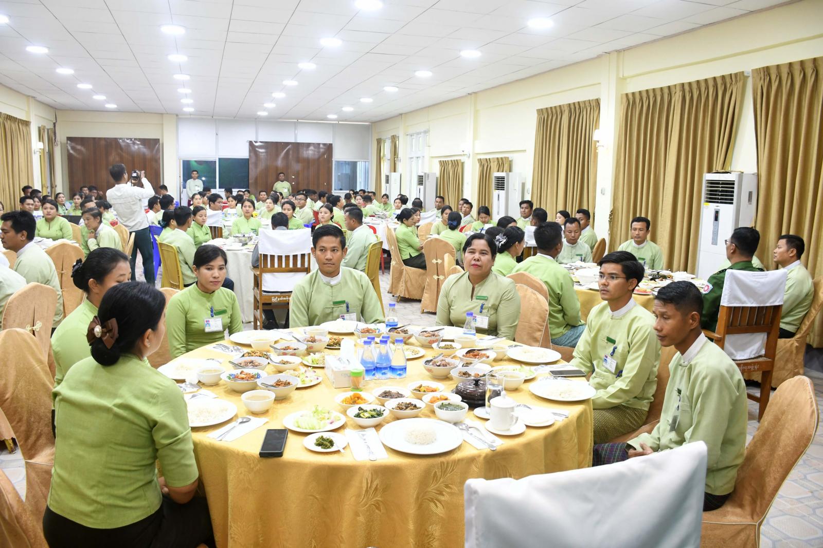 အထူးနေ့လယ်စာ စားပွဲတွင် ရခိုင်ပြည်နယ်ဝန်ကြီးချုပ် ဦးထိန်လင်းက အစားအသောက်ကို လတ်လတ် ဆတ်ဆတ်စားသုံးမှ အရသာရှိသကဲ့သို့ ရုံးလုပ်ငန်းများကို ဆောင်ရွက်ရာတွင်လည်း မြန်မြန်ဆန်ဆန်တိတိ ကျကျ မှန်မှန်ကန်ကန် အကောင်အထည်ဖော်ဆောင်ရွက်နိုင်မှ ရုံးလုပ်ငန်းများ လည်ပတ်ပြီး ဝန်ကြီးချုပ်၊ သက်ဆိုင်ရာ ဝန်ကြီးများနှင့် အစိုးရအဖွဲ့အတွင်းရေးမှူးတို့ကို အထောက်အကူပြုနိုင်မည်ဖြစ်ကြောင်း၊ ထို့အတူ ရုံးလုပ်ငန်းစနစ်သည်လည်း မိသားစုတစ်ခုတွင် မိဘသားသမီး များရှိသကဲ့သို့ မိသားစုညီညီညွတ်ညွတ်ဖြင့် ဆောင်ရွက်ရခြင်းဖြစ်သောကြောင့် အဆင့်ဆင့်ကြတ်မတ် ကွပ်ကဲပြီး ဆောင်ရွက်ရသော စနစ်တစ်ခု ဖြစ်ကြောင်း၊ အလုပ်တစ်ခုလုပ်ဆောင်ရာတွင် အောက်ခြေဝန် ထမ်းမှစပြီး တာဝန်ရှိသည့်သူအဆင့်ဆင့်ထိ သူ့တာဝန်နှင့်သူရှိကြောင်း၊ ဝန်ထမ်းများအားလုံးသည် ရည်မှန်းချက်အတူတူဖြစ်ကြောင်း၊ ထို့ကြောင့် ရည်မှန်းချက်တူညီပြီး တစ်မိုးအောက်တွင် တာဝန်ထမ်းဆောင်နေကြသူများဖြစ်သည့်အတွက် အတူတကွ ပူးပေါင်း ပါဝင်ပြီး မိသားစုအသွင်ဖြင့် ချစ်ချစ်ခင်ခင် ညီညီညာညာဖြင့် ပေးအပ်သည့်တာဝန်များကို ထမ်းဆောင်ကြရန်၊ မိသားစုထမင်းဝိုင်းကို နွေးနွေးထွေးထွေး မိသားစုစိတ်ဓာတ်ဖြင့် စားသုံးကြရန်နှင့် ရှေ့ဆက်ပြီး ပေးအပ်သည့် တာဝန်များကို ကျေကျေ ပွန်ပွန်ထမ်းဆောင်ကြရန်ပြောကြားသည်။