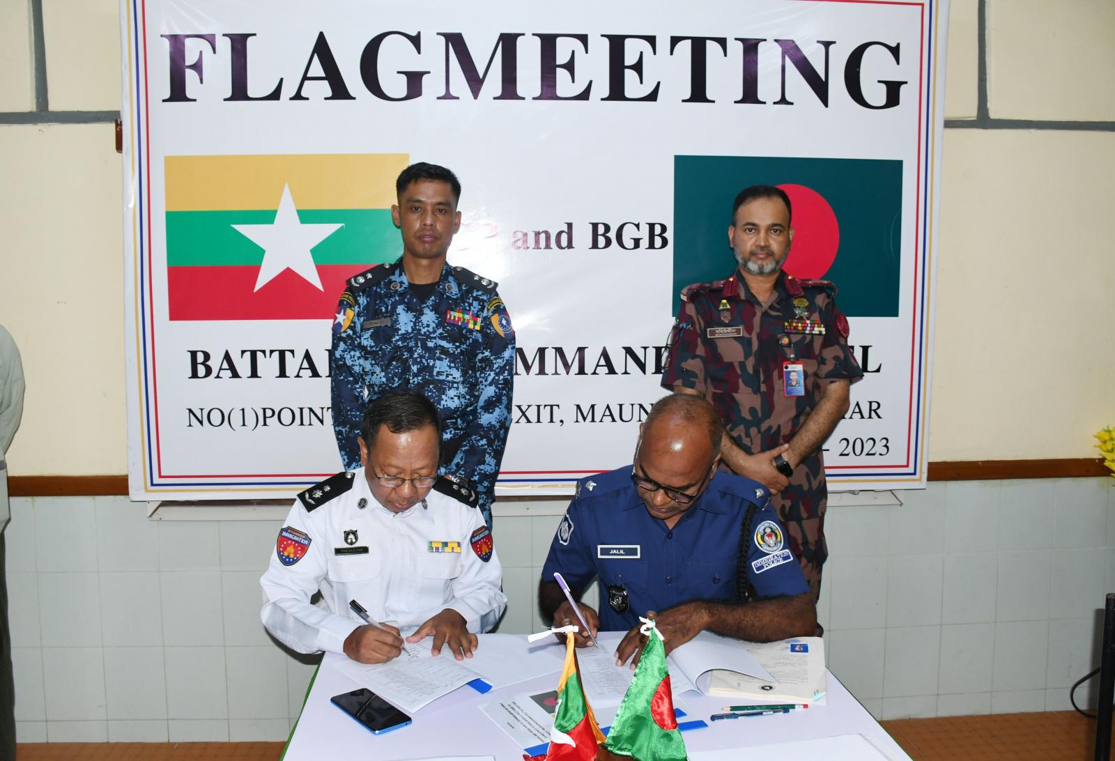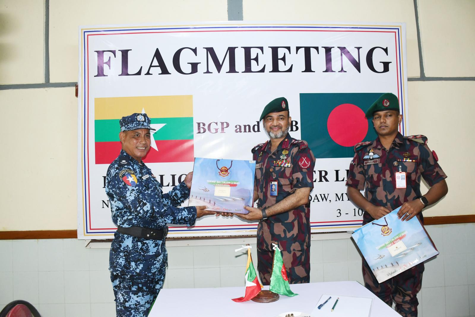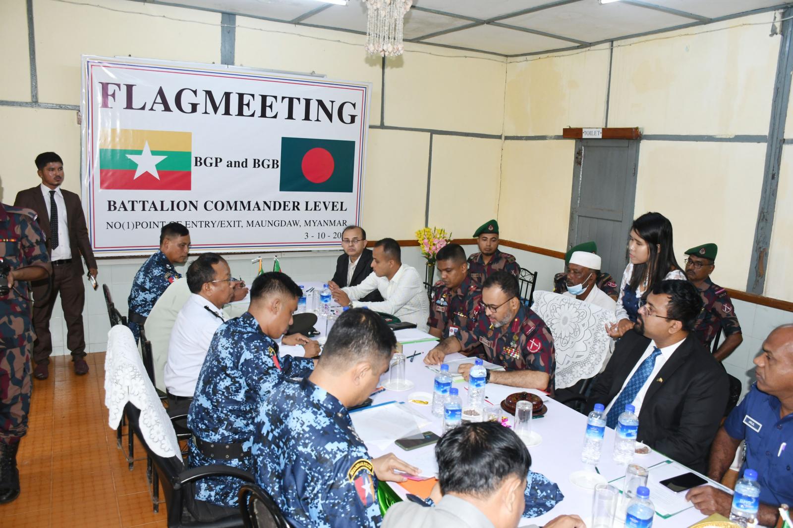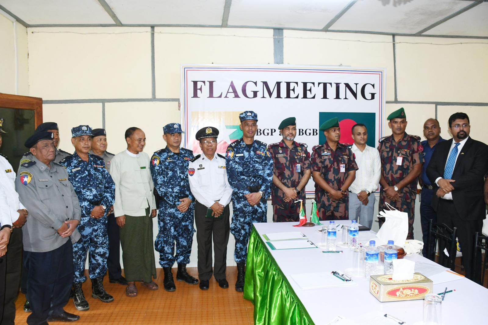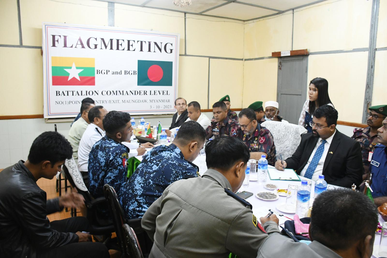 ဆက်လက်၍ မြန်မာနှင့် ဘင်္ဂလားဒေ့ရှ်နှစ်နိုင်ငံ တပ်ရင်းမှူးအဆင့် အလံတင်အစည်းအဝေးအား ကျင်းပပြုလုပ်ရာ လက်ရှိနှစ်နိုင်ငံနယ်စပ်ဒေသအခြေအနေများ၊ တရားမဝင်ကျူးကျော်မှု၊ ဝင်ရောက်မှုမှ ကာကွယ်ခြင်းနှင့် နယ်စပ်နေဒေသခံပြည်သူများအား အမှတ်တမဲ့ဖြတ်ကျော်ခြင်းကိစ္စရပ်များ အသိပညာပေးရေးနှင့် နယ်မြေလုံခြုံရေးကိစ္စရပ်များ၊ ဘင်္ဂလားဒေ့ရှ်နိုင်ငံသားများ မြန်မာနိုင်ငံဘက်သို့ တရားမဝင်ဝင်ရောက်ခြင်း မရှိစေရေးနှင့် တရားမဝင် နယ်စပ်ဖြတ်ကျော် မူခင်းများမဖြစ်ပွားစေရေး၊ မူးယစ်ဆေးဝါး အပါအဝင် လူကုန်ကူးမှု တိုက်ဖျက်ရေးလုပ်ငန်းများ တိုးမြှင့်ဆောင်ရွက်ခြင်းနှင့် နယ်စပ်ဒေသ တည်ငြိမ်အေးချမ်းရေးအတွက် အပြန်အလှန် သတင်းဖလှယ်ကာ ပူးပေါင်း ဆောင်ရွက်စေလိုကြောင်းပြောကြားခဲ့ကြသည်။
