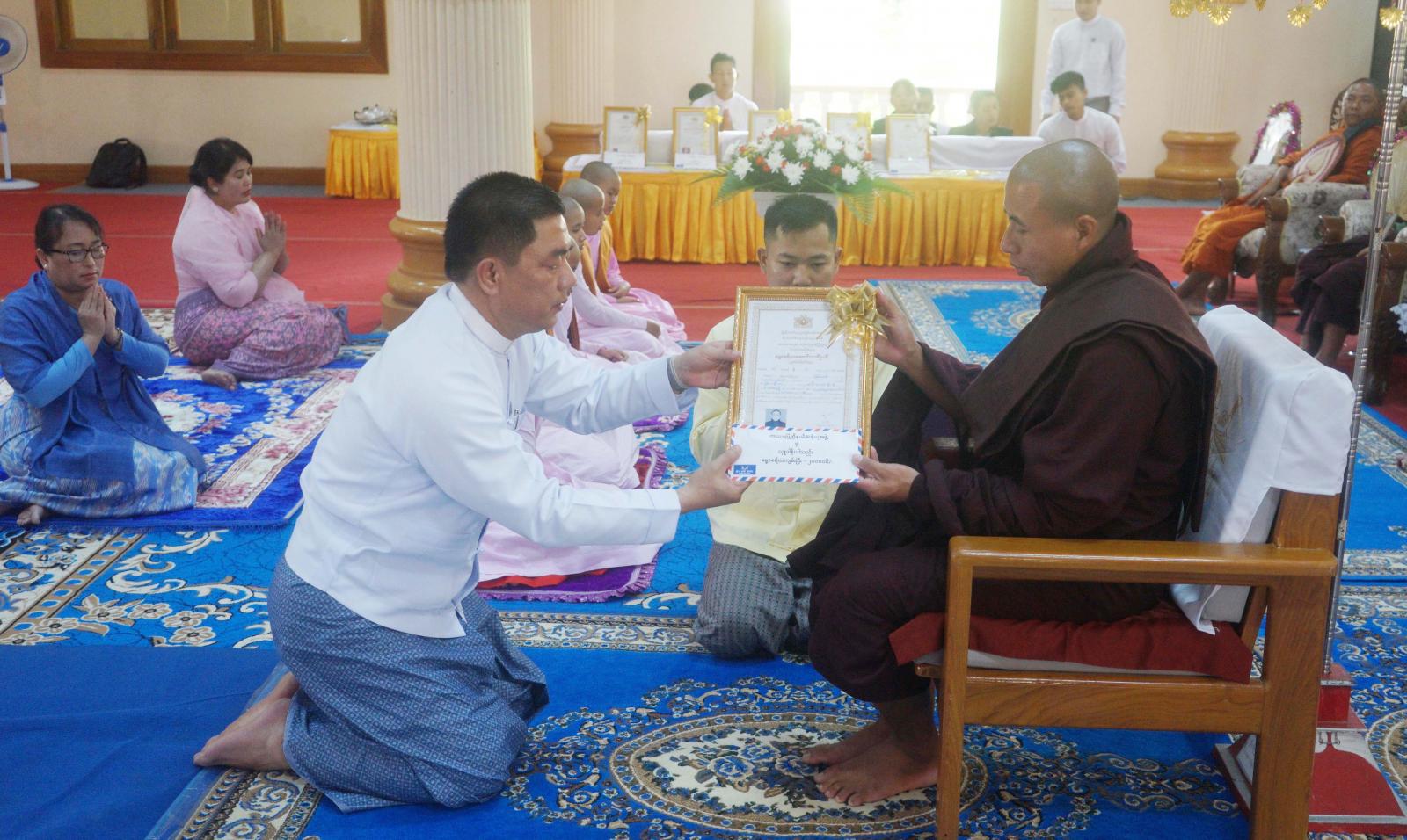 ယင်းနောက် ပြည်နယ်ဝန်ကြီးချုပ်နှင့်တာဝန်ရှိသူများက ၂၀၂၃ ခုနှစ် အစိုးရဓမ္မာစရိယ၊ ပထမကြီးတန်း ၊ ပထမလတ်တန်း ၊ ပထမငယ်တန်းနှင့် အခြေပြုမူလတန်းနှင့် နိကာယ်အုပ်စု(၈)ကျမ်းပြီး စာအောင်ဆုရသံဃာတော်များအားလည်းကောင်း၊ ပြည်နယ်ဝန်ကြီးချုပ်၏ဇနီးနှင့် တာဝန်ရှိသူများက ပထမကြီးတန်း ၊ ပထမငယ်တန်းနှင့် အခြေပြုမူလတန်းစာအောင်ဆုရသီလရှင်များနှင့် ဝိသုဒ္ဓိမဂ်နှင့်အဘိဓမ္မာ စာအောင်ဆုရ လူပုဂ္ဂိုလ်များအားလည်းကောင်း ဂုဏ်ပြုအလှူတော်ငွေနှင့် ဂုဏ်ပြုမှတ်တမ်းလွှာများ ဆက်ကပ်လှူဒါန်းခဲ့ကြသည်။