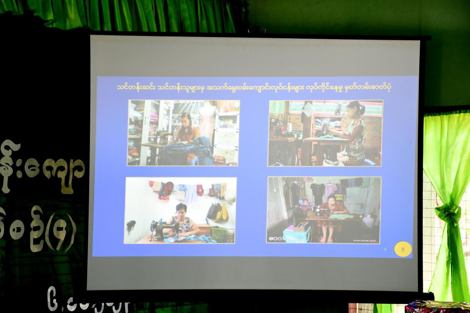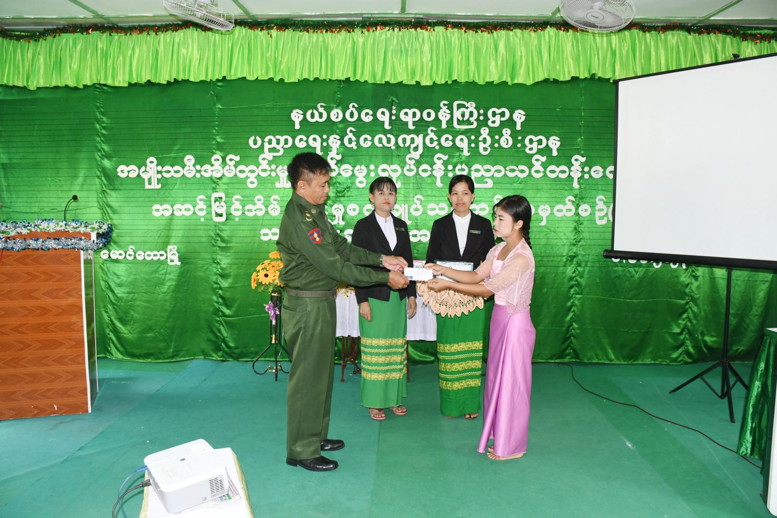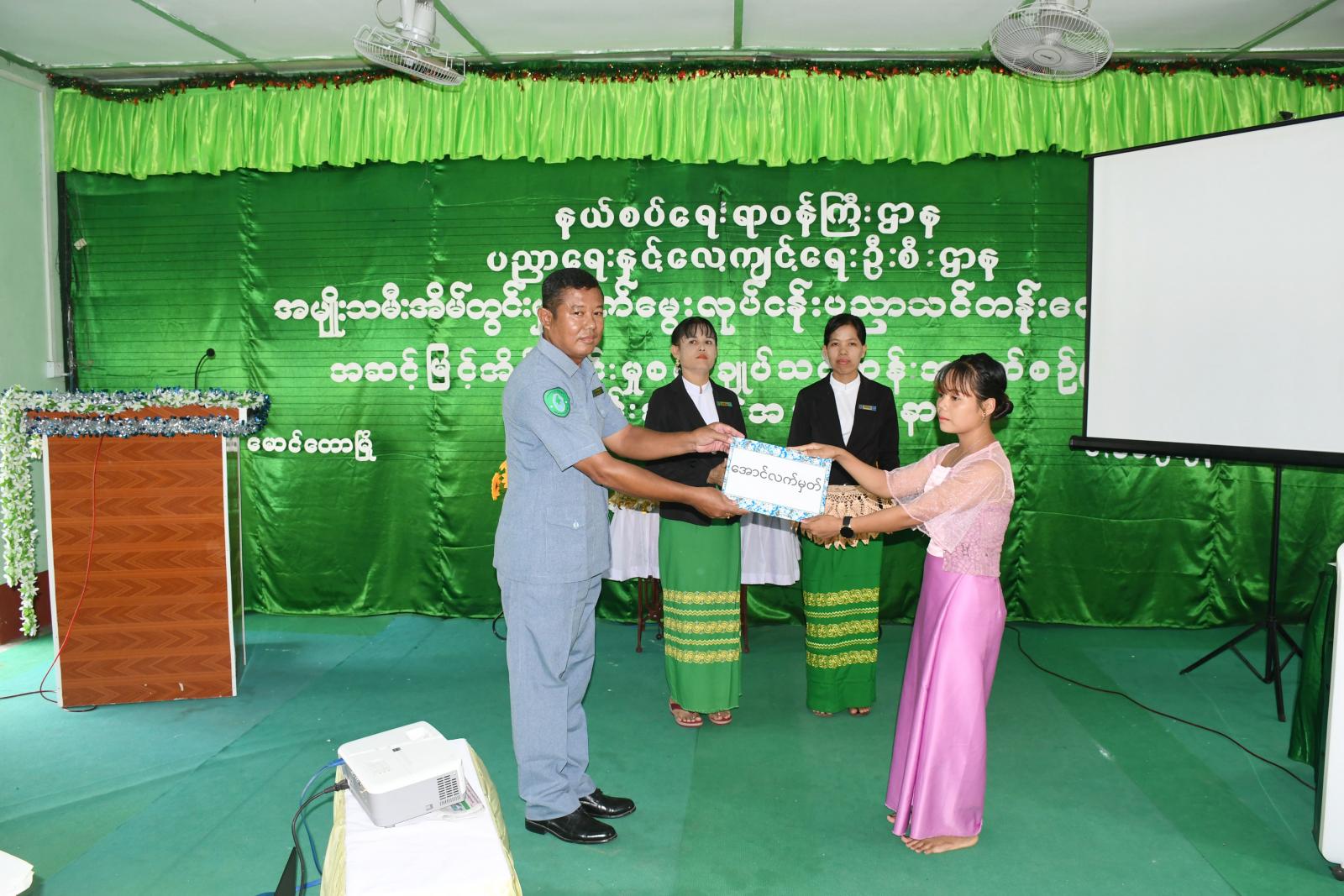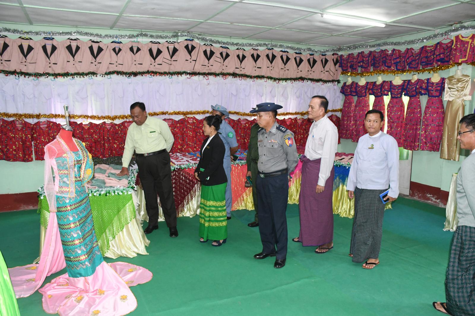 ထို့နောက် ခရိုင်စီမံအုပ်ချုပ်ရေးအဖွဲ့ ဥက္ကဋ္ဌ ဦးနေဦးက အဆင့်မြင့် အိမ်တွင်းမှု စက်ချုပ်သင်တန်း အမှတ်စဉ်(၄) သင်တန်းတွင် ထူးချွန်စွာ ပထမ ရရှိခဲ့သူအား ဆု ရရှိသူအား ဆုများ ဂုဏ်ပြုဆုငွေနှင့် အပ်ချုပ်စက် တစ်လုံးအားပေးအပ်ခဲ့ကာ ခရိုင်စီမံ အုပ်ချုပ်ရေးအဖွဲ့ဝင်များနှင့် နယ်စပ်ဒေသ ဖွံ့ဖြိုးမှု ကြီးကြပ်ရေးရုံးမှ ဒုတိယညွန်ကြာရေးမှူး ဦး ကျော်မြင့်ဦးမှ သင်တန်းဆင်းလက်မှတ်များနှင့် ဒုတိယ၊ တတိယ ဆုရရှိသူများအား အသီးသီး ဆုချီးမြှင့်ပေးအပ်ခဲ့ပြီး အဆင့်မြင့် အိမ်တွင်းမှု စက်ချုပ်သင်တန်း အမှတ်စဉ်(၄) သင်တန်း တက်ရောက်သင်ယူခဲ့သည့် သင်တန်းသူတစ်ဦးမှ ကျေးဇူးတင်စကား ပြောကြားခဲ့သည်။ ဆက်လက်၍ အခမ်းအနားသို့တက်ရောက်လာကြသူများက အဆင့်မြင့် အိမ် တွင်းမှု စက်ချုပ်သင်တန်း အမှတ်စဉ်(၄) သင်တန်းတွင် တက်ရောက်ခဲ့သောသင်တန်းသူများ၏ လက်ရာများအားလှည့်လည် ကြည့်ရှုခဲ့ကြပြီး အမျိုးသမီးအိမ်တွင်းမှုလုပ်ငန်း ပညာသင်တန်းကျောင်းမှ ကျောင်းအုပ် ဆရာမကြီး ဒေါ်နီလာကြည်မှ လိုက်လံရှင်းလင်းပြသခဲ့သည်။ အခမ်းအနားသို့ ခရိုင်စီမံအုပ်ချုပ်ရေး အဖွဲ့ဥက္ကဋ္ဌ ဦးနေဦးနှင့် အဖွဲ့ဝင်များ၊ မြို့နယ်စီမံအုပ်ချုပ်ရေး ဦးကံထွန်း အောင်နှင့် အဖွဲ့ဝင်များ၊ ခရိုင်/ မြို့နယ် အဆင့်ဌာန ဆိုင်ရာများ၊ လူမှုရေးအသင်းအဖွဲ့များ၊ အိမ်တွင်းမှု ပညာသင်တန်း ကျောင်းမှ ဆရာမများနှင့် သင်တန်း သူများ နှင့် တာဝန်ရှိသူ များ တက်ရောက်ခဲ့ကြကြောင်း သိရသည်။